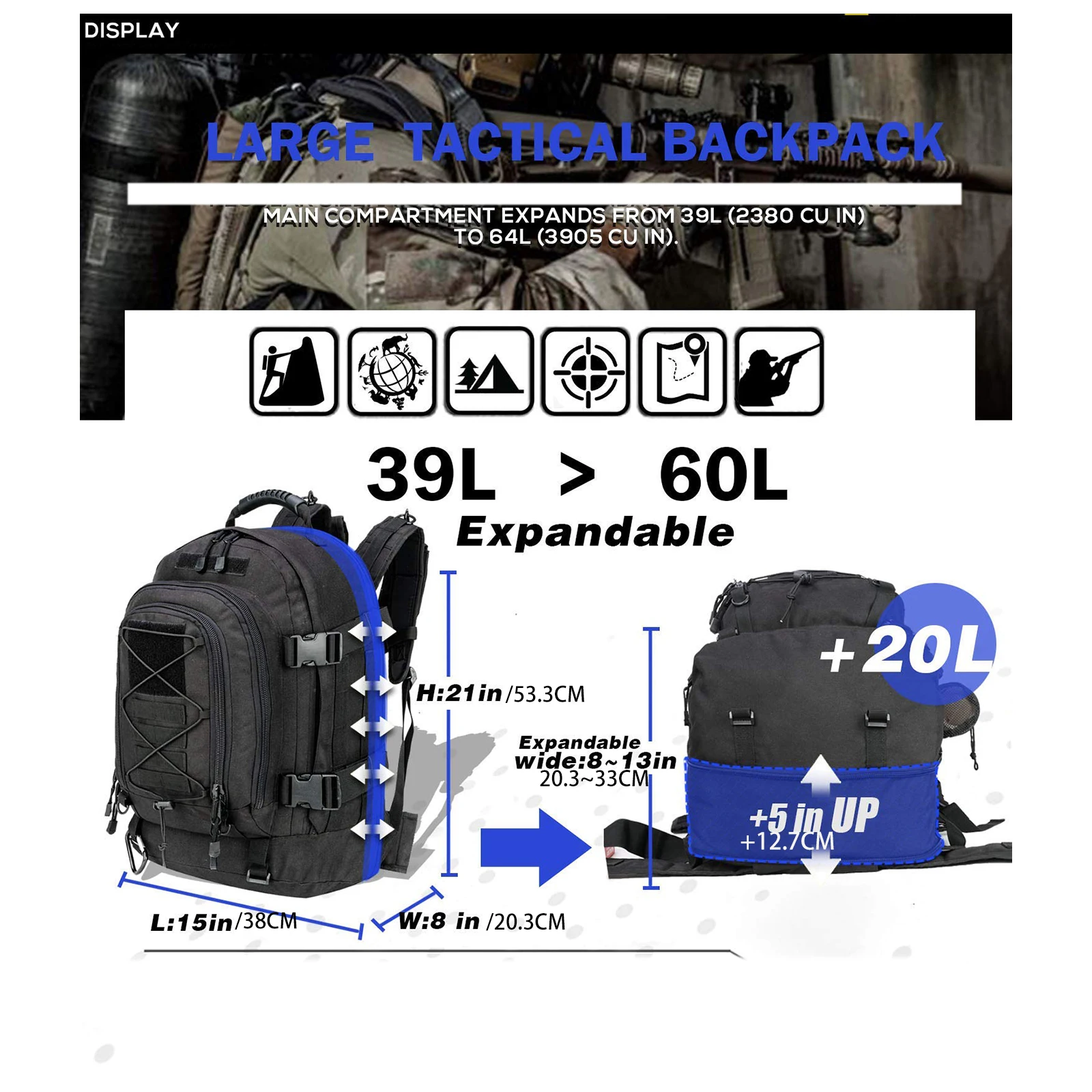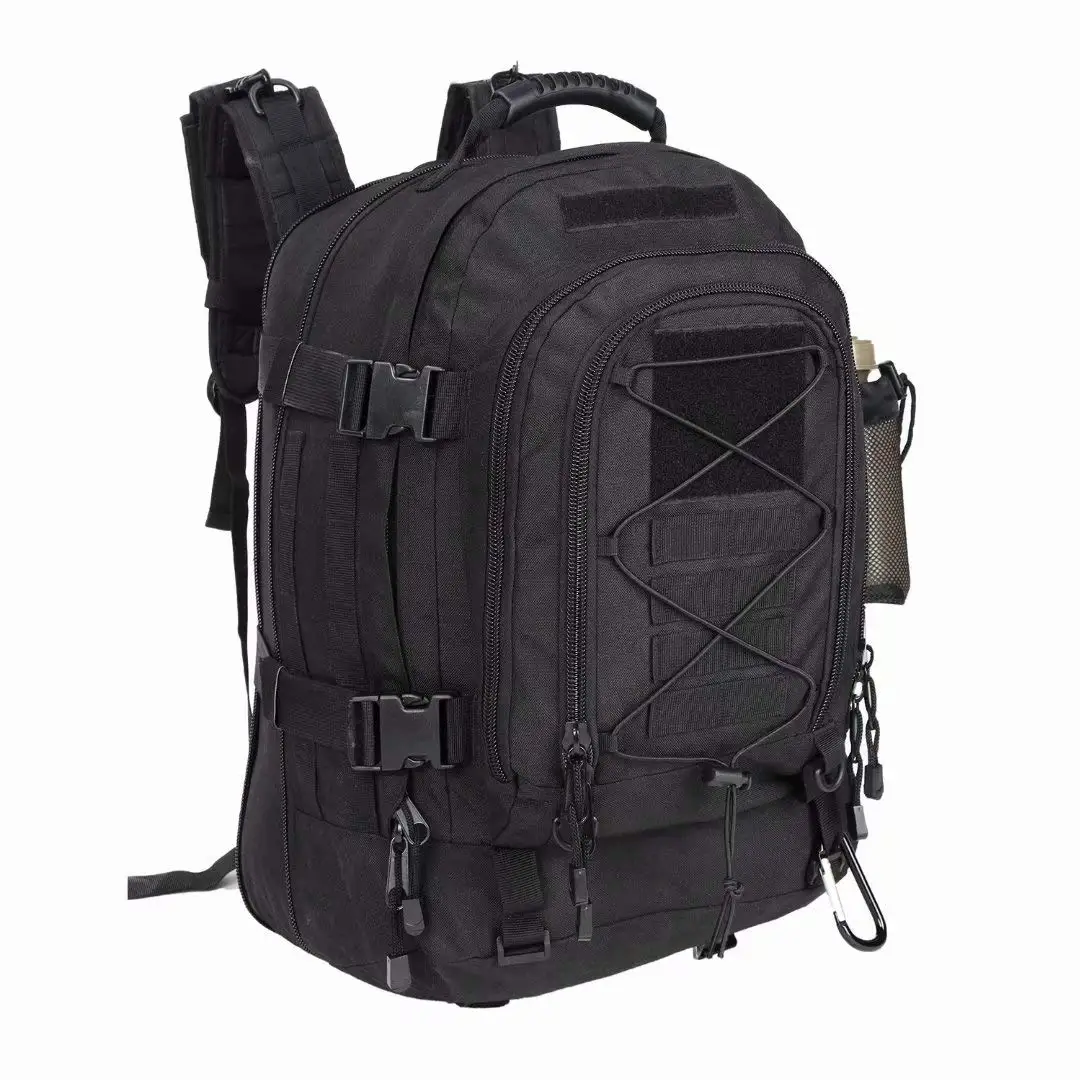 Bolsillo de malla para botella de agua en el lateral (botella no incluida). Es conveniente para usted beber agua en actividades al aire libre, sistema MOLLE en la parte delantera, puede agregar una bolsa, el gancho de Montañismo se puede usar para colgar cosas pequeñas, el lado de la hebilla puede hacer que esta mochila grande sea más compacta, más cómoda de llevar, Puede poner una tarjeta con el nombre o una bandera delante del velcro, hacer que esta mochila para exteriores sea más personalizada