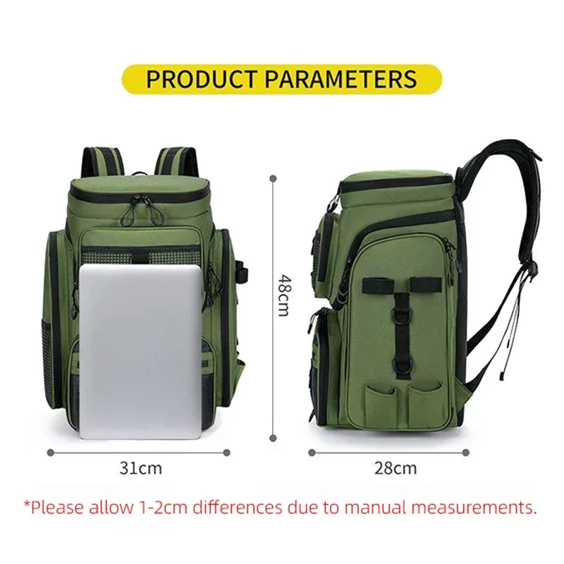 MOCHILA GRANDE CON 16 BOLSILLOS DE ALMACENAMIENTO: la mochila de pesca tiene un espacio de almacenamiento de gran capacidad de 50 litros para todos sus elementos esenciales para un día de pesca.Toda esta mochila para aparejos de pesca contiene 16 bolsillos independientes y áreas de almacenamiento que brindan suficiente espacio para organizar todos sus equipos y accesorios de pesca, como cañas de pescar, carretes, alicates, cajas de aparejos, herramientas de pesca, controlador, botella de agua, etc.