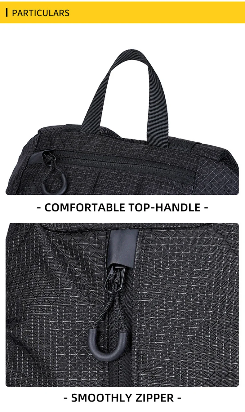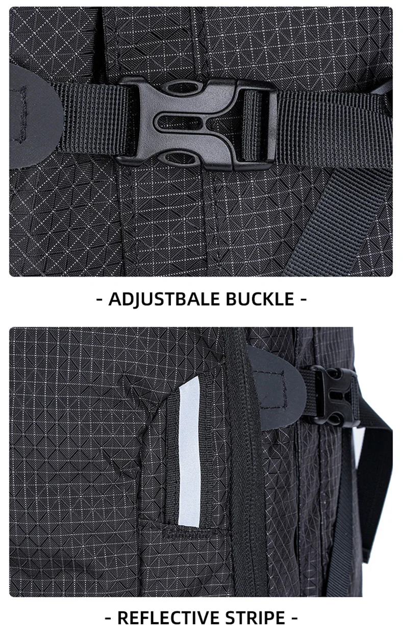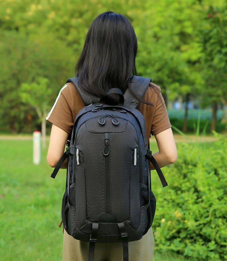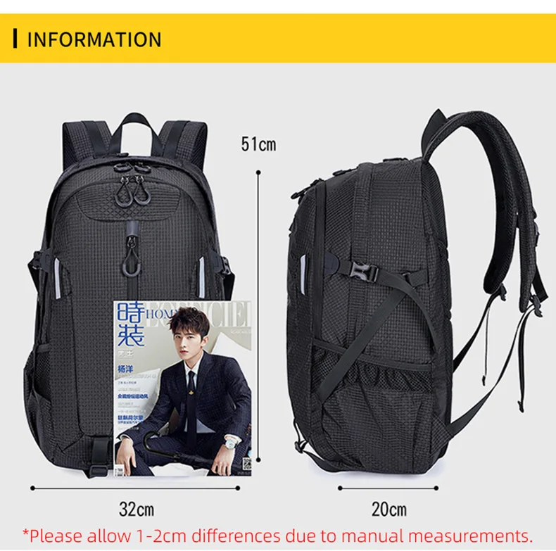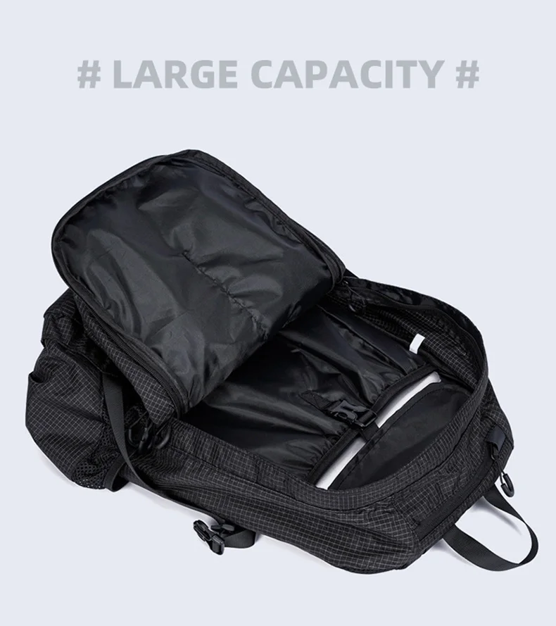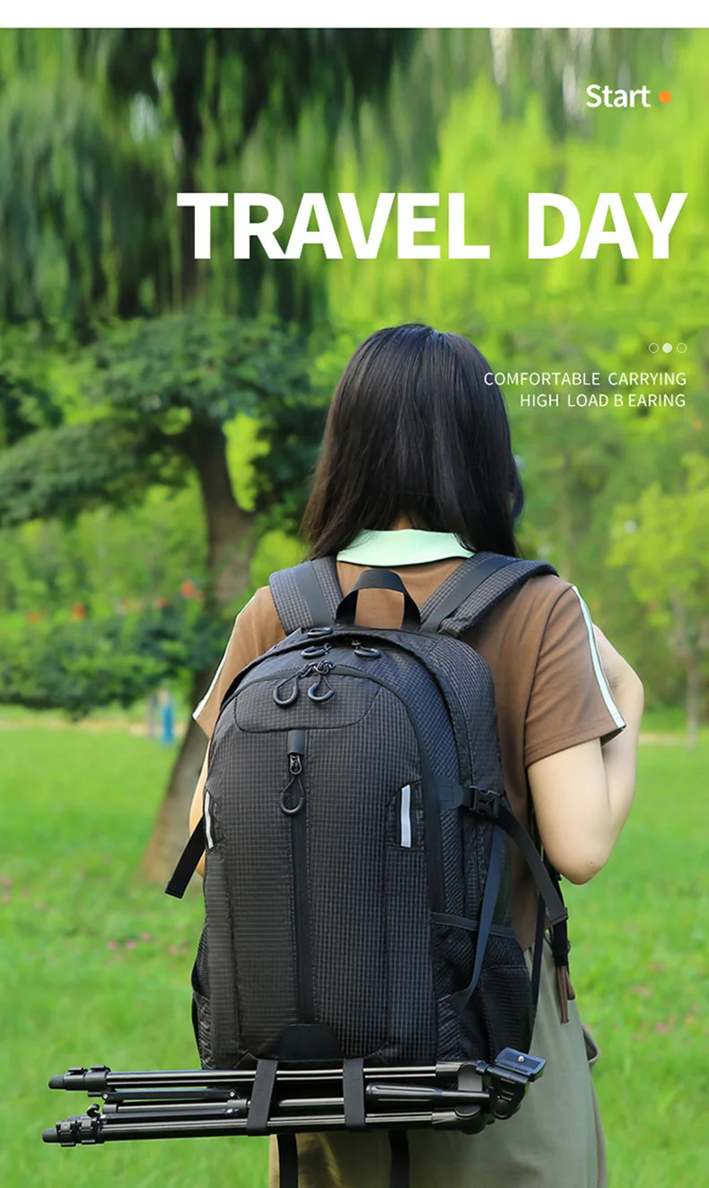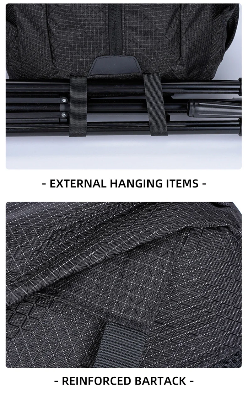 【Aplicación】: Gran capacidad para saco de dormir, bastones de trekking, libros, cámara, ropa, auriculares, botella de agua, paraguas plegable, pañuelo, bolsa de agua, ropa, computadora portátil, etc.
