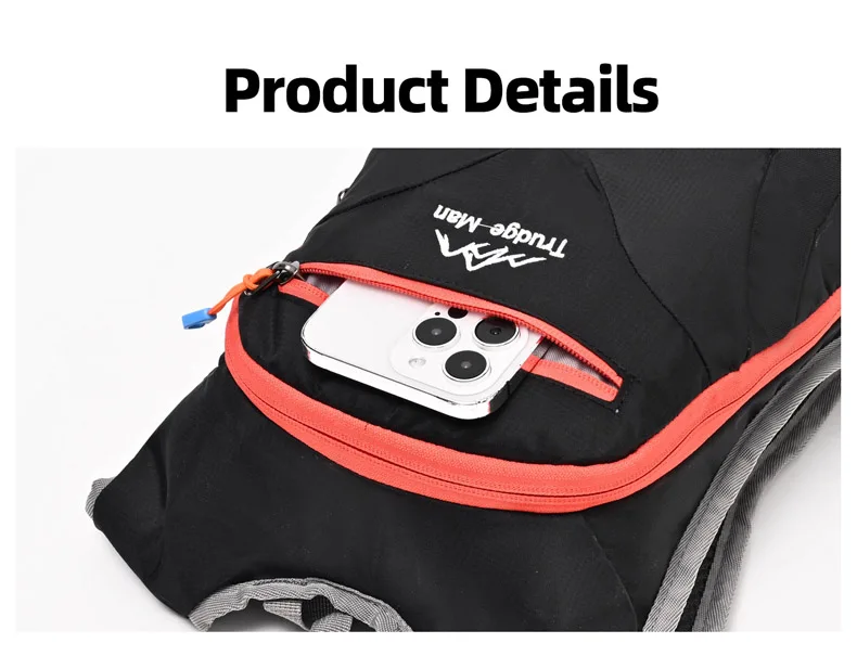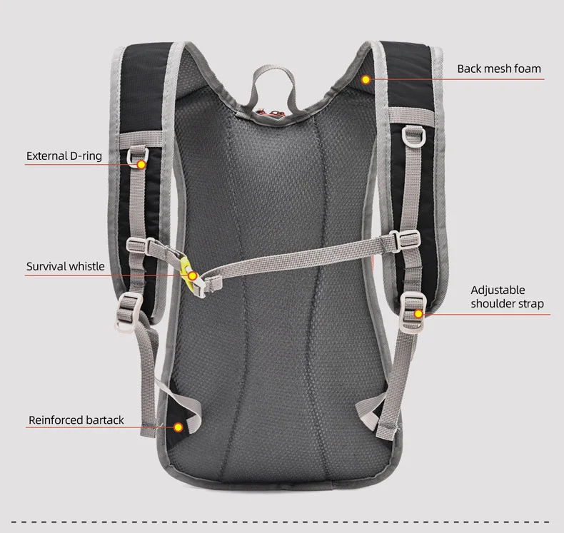 1.Aspectos destacados estructurales: correas de hombro de malla transpirable, mango cómodo, cremallera suave, diseño de cordón, tiras reflectantes de seguridad, silbato de supervivencia