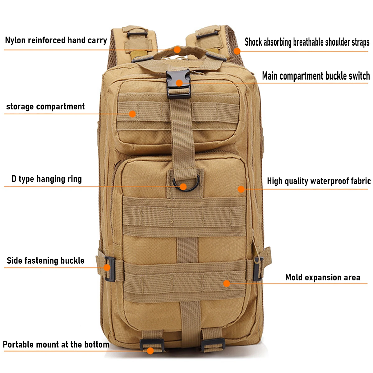 [Military MOLLE system] The molle webbing system of the tactical backpack is designed to facilitate the attachment of additional Molle tactical bags or more equipment. The front of the backpack has 3 rows of molle velcro areas, and the front and sides, as well as the bottom and shoulder straps are equipped with molle connections Strap, the shoulder strap with two D-rings can hang things, and the strap at the bottom can be used to fix tents and sleeping mats or other outdoor equipment.
