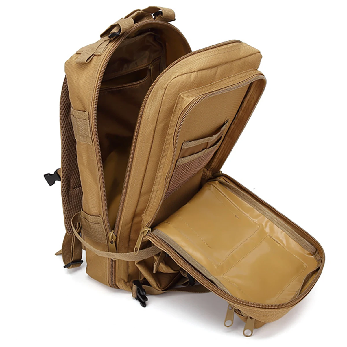 [Multi-functional and multi-compartment] The spacious military backpack has multiple compartments and double zipper closure pockets, including internal zipper pockets and mesh pockets, which increase storage options to meet your daily life and outdoor needs. 2 main large compartments, 2 front small compartments, and 1 rear compartment. The large compartment is equipped with elastic straps to fix the laptop or anything you don't want to move. Each compartment has mesh pockets or zipper pockets to help organize.