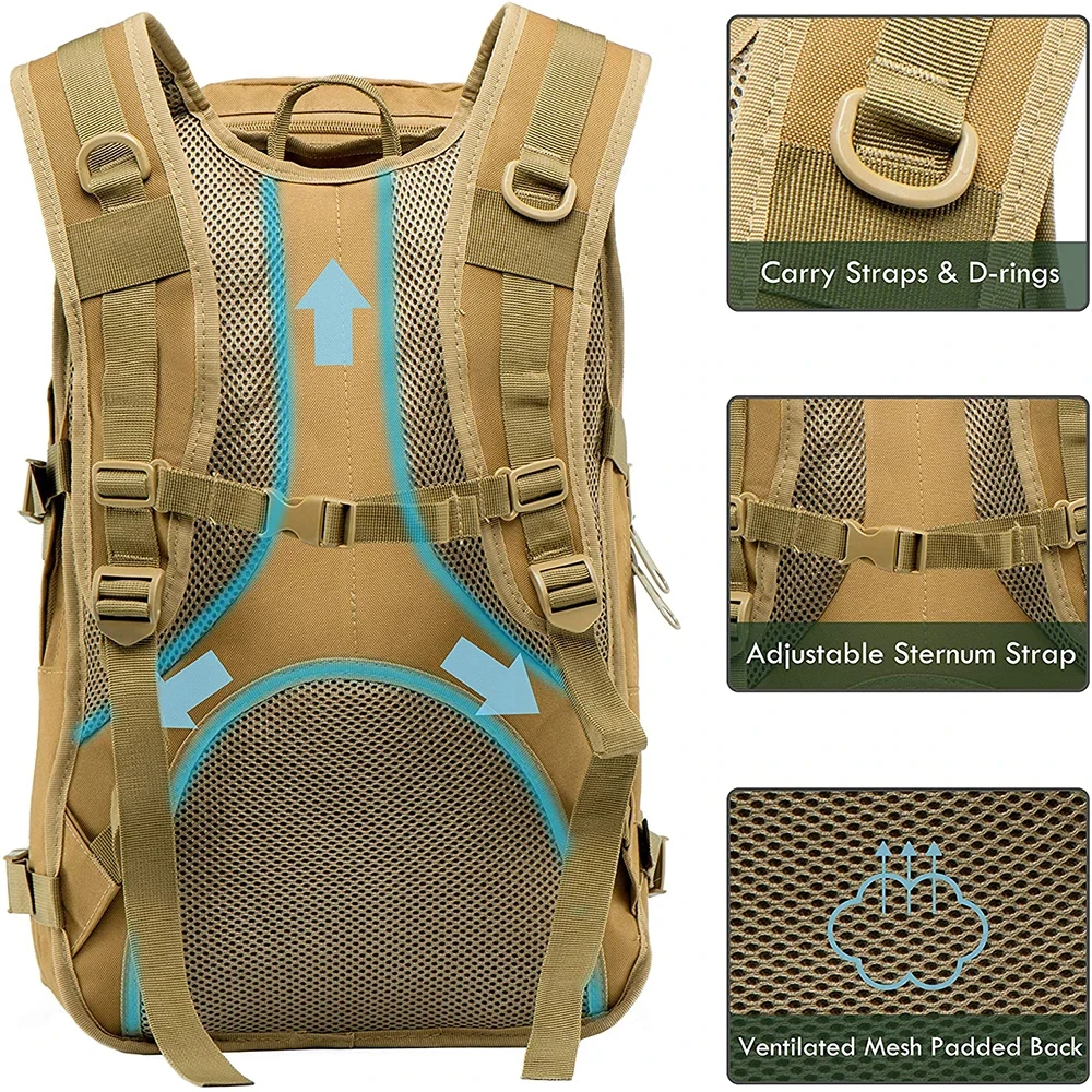Calidad y comodidad: mochila militar táctica con respaldo acolchado transpirable, correa de hombro de malla acolchada con punto de conexión de anillo en D, correa para el pecho desmontable