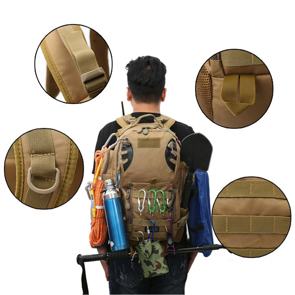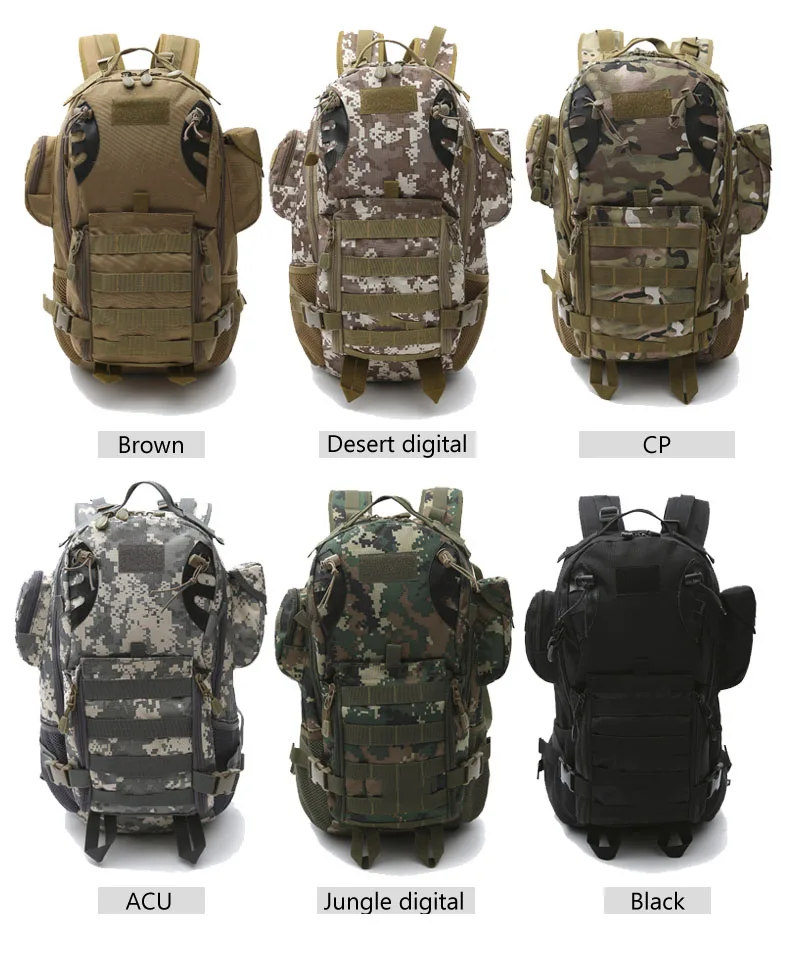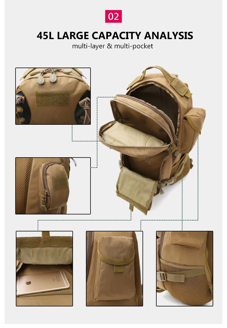 Tamaño: 50cmX32cmX18cm(HXLXW)Capacidad: 45LUso: Bolso de hombro táctico, bolso cruzado con sistema Molle, mochila de escaladaOcasión: camping, senderismo, caza, pesca, trekking, Montañismo