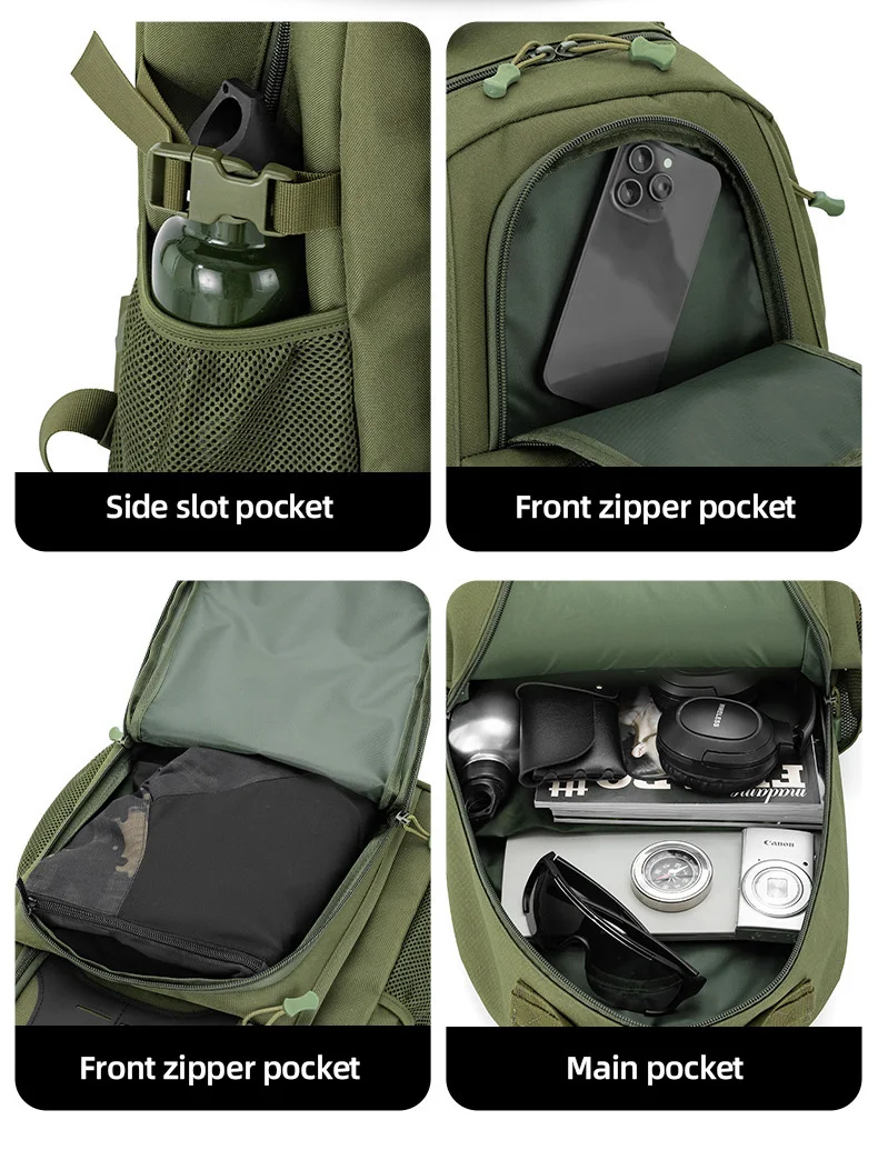 1.Juego de bolsa principal de gran capacidad, dentro del compartimento de bolsillo, los bolsillos secundarios con múltiples cremallera del cuerpo de la bolsa, los bolsillos laterales de malla de la bolsa se pueden guardar tazas, paraguas, etc., diseño racional de almacenamiento de varios niveles