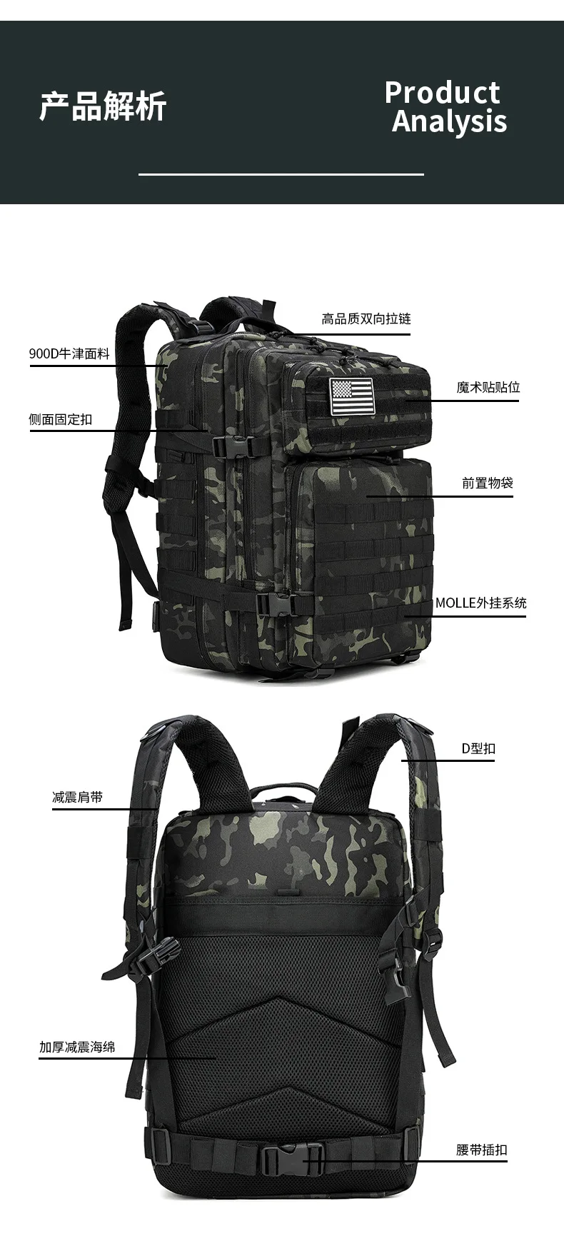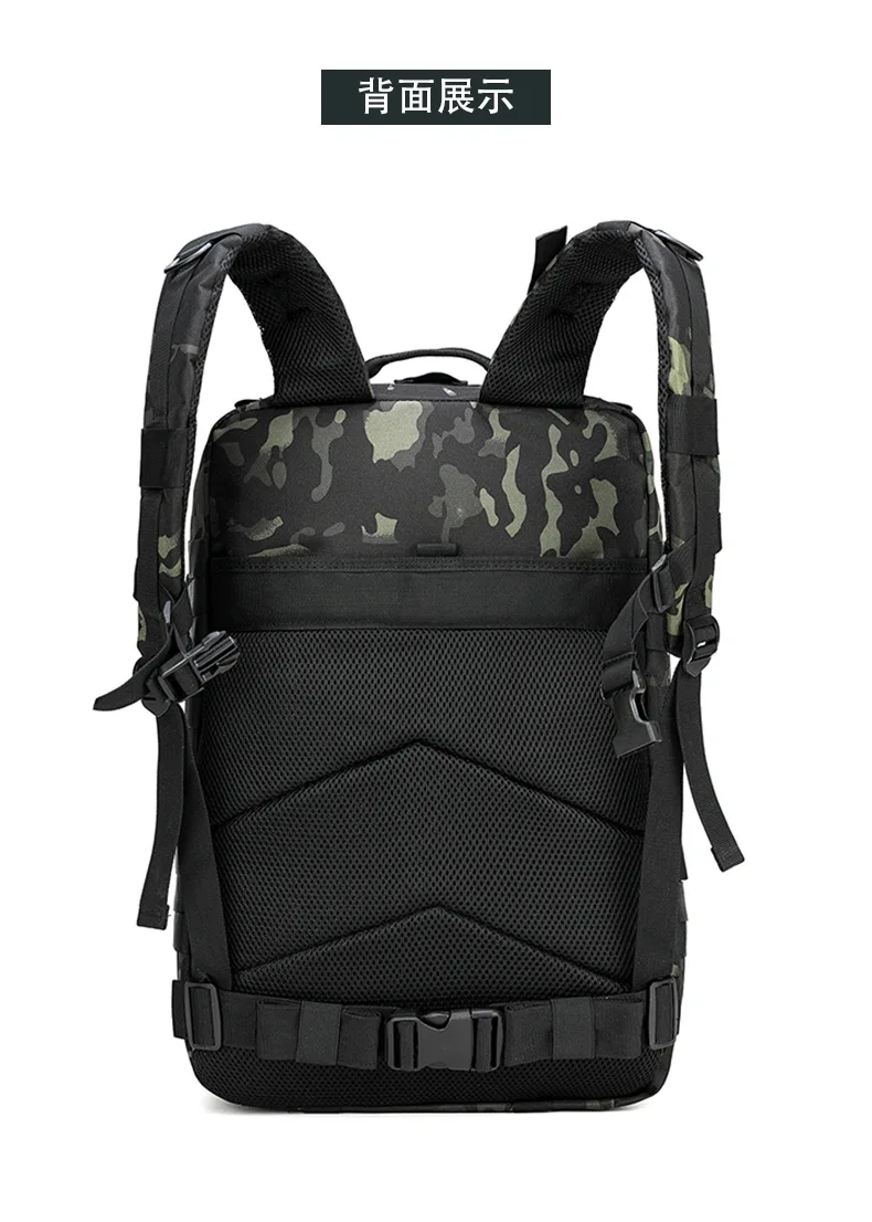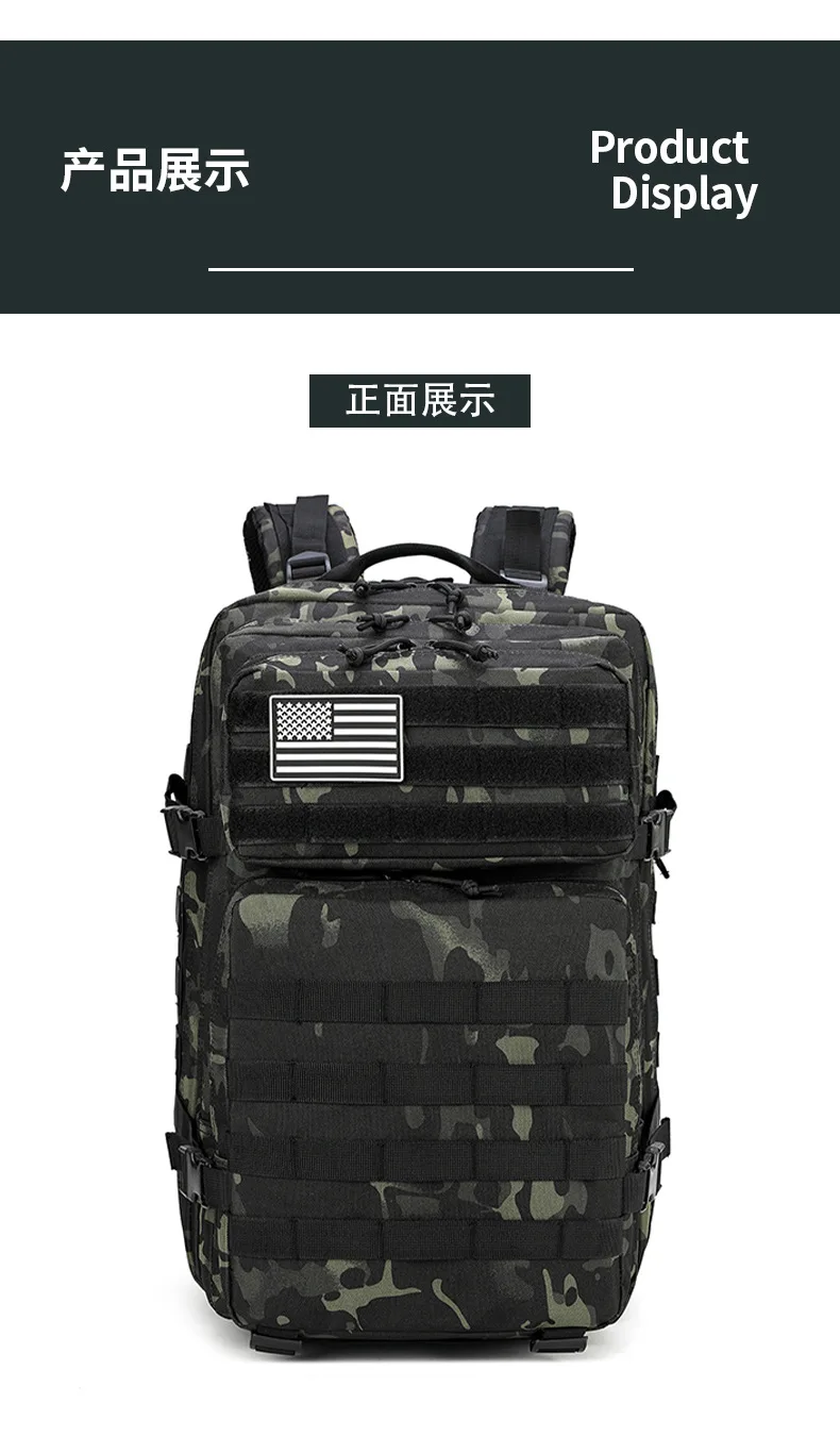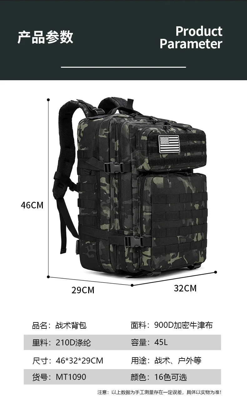 Esta mochila táctica está hecha de tela Oxford cifrada 900D y forro de poliéster 210D.Es resistente a los arañazos, duradero y altamente confiable.Las dimensiones son 46×32×29 cm y la capacidad es de 45 litros, satisfaciendo las necesidades de almacenamiento de gran capacidad para actividades al aire libre, CS de personas reales, montañismo y senderismo, etc.
