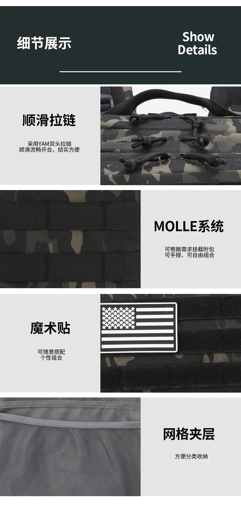 El cuerpo de la bolsa está equipado con un sistema de fijación MOLLE, que permite la fijación gratuita de bolsas de almacenamiento adicionales;