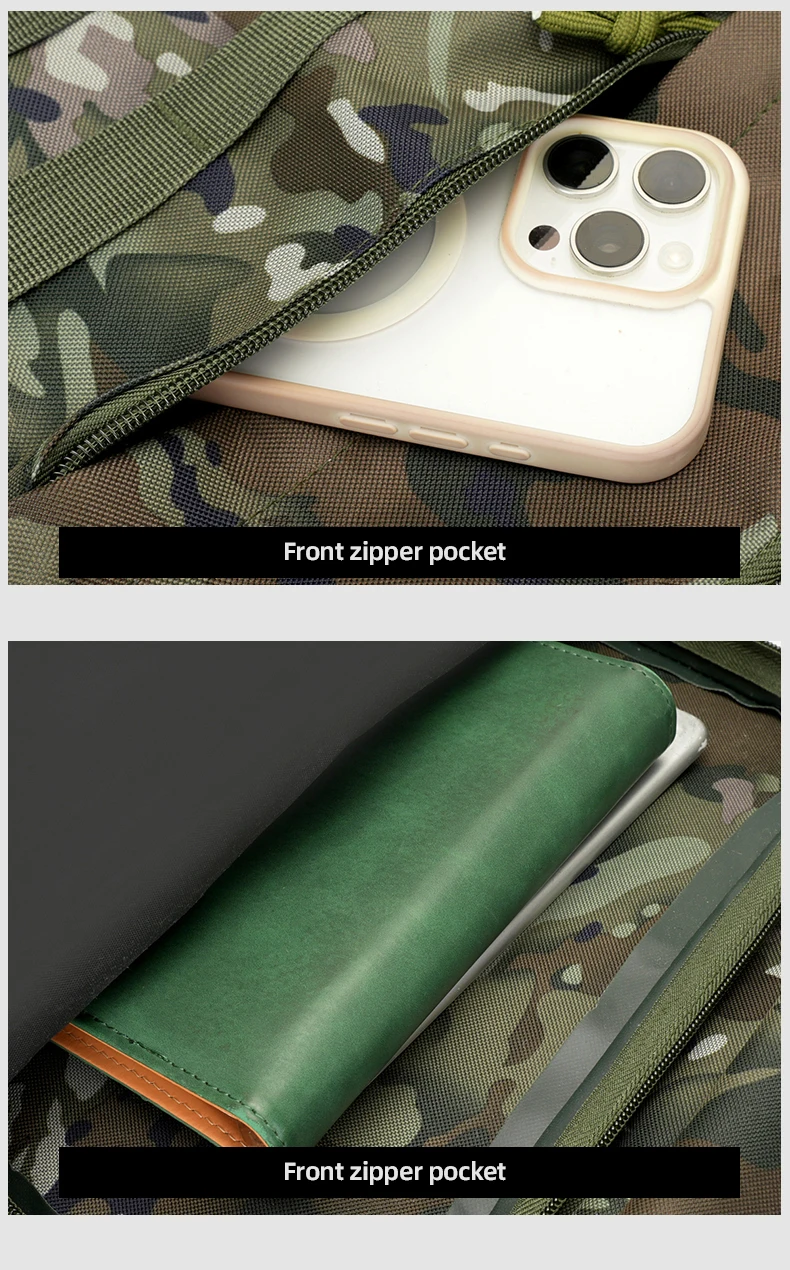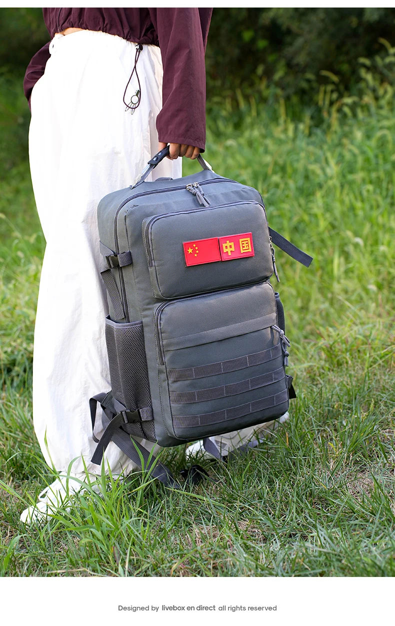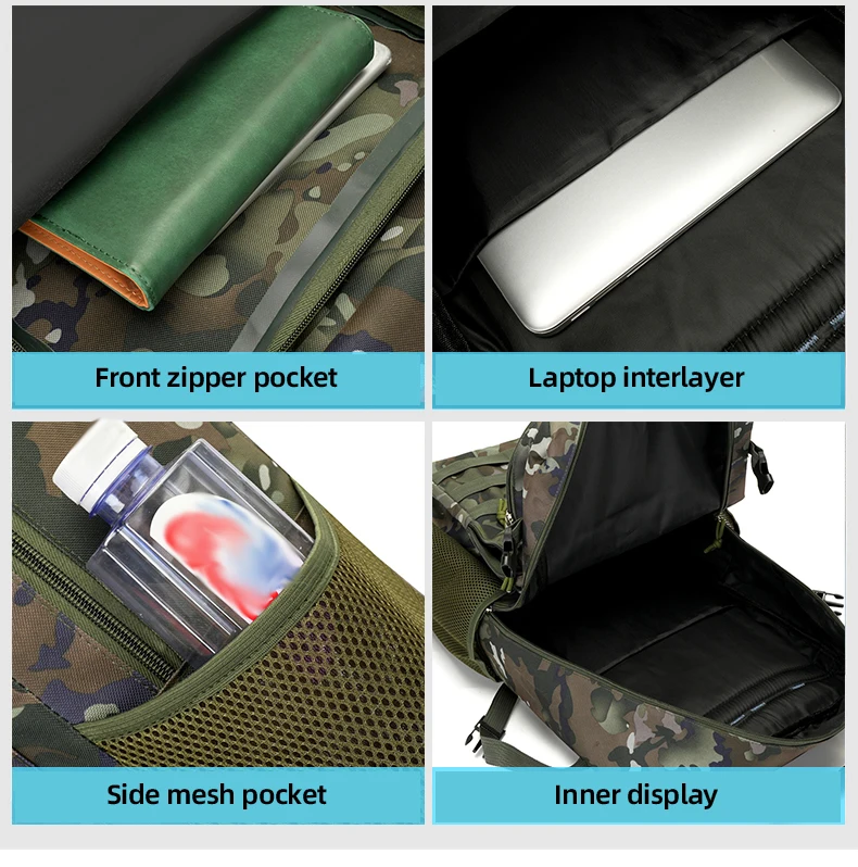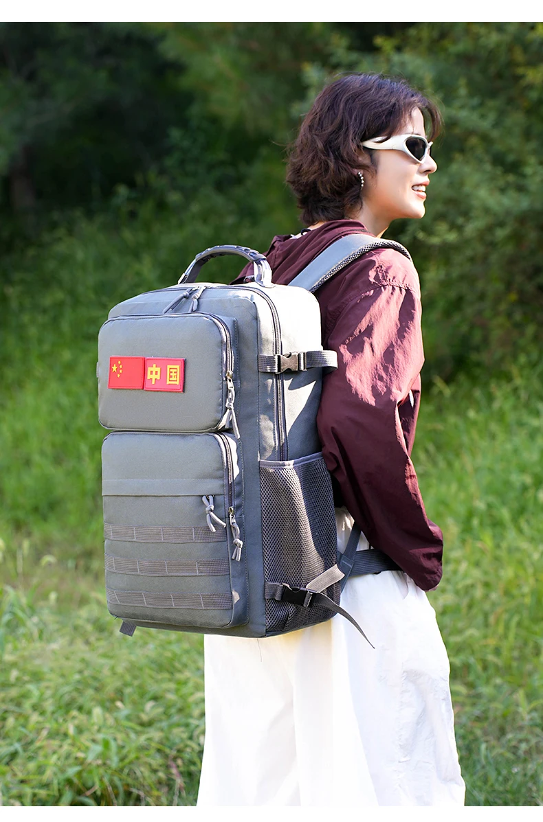 3.Espacio de gran capacidad y carga de zonificación científica: bolsa con cremallera frontal, bolsa con compartimento interior, bolsa de red lateral y bolsa principal de gran capacidad.