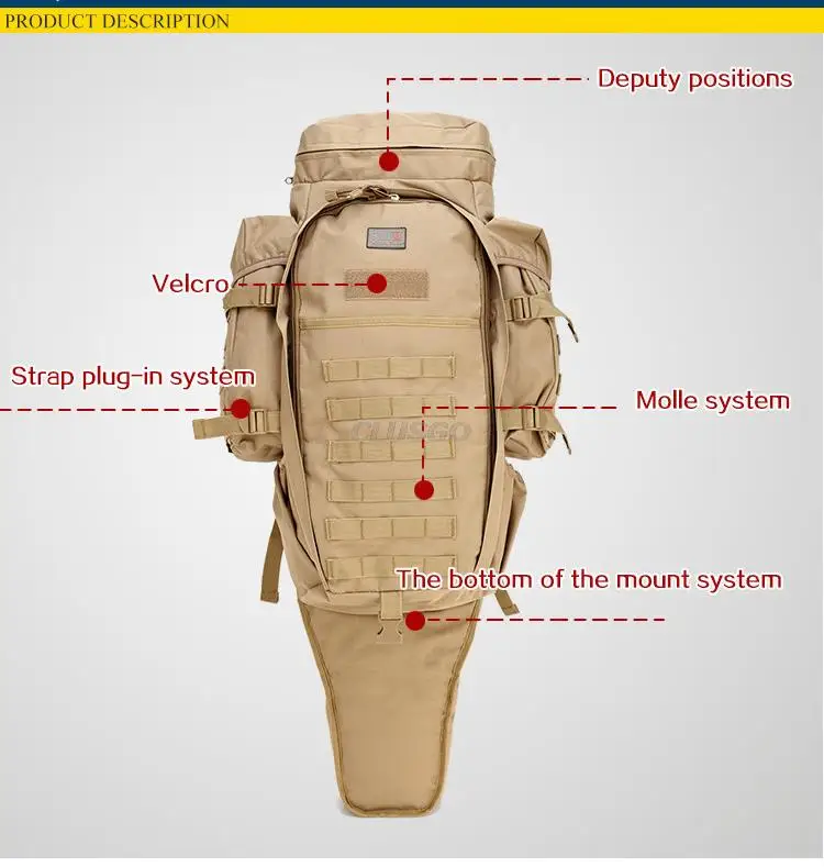 La carga principal se ha separado en dos compartimentos por una bolsa acolchada desmontable para sostener dos rifles. Y el tamaño completo de la carga principal es de 86cm (largo) x 24cm (ancho).