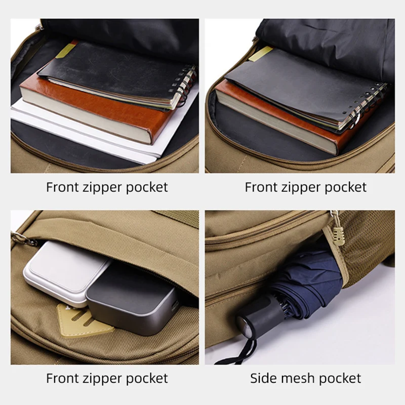 1.Conjunto de bolsa principal de gran capacidad, compartimento para computadora incorporado, bolsillos laterales con cremallera en el cuerpo de la bolsa y bolsillos con cremallera, almacenamiento de zonificación, viaje más conveniente.Bolsillos laterales para guardar paraguas o tazas, etc.
