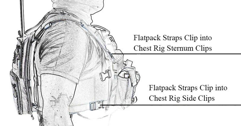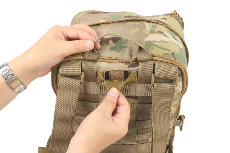 La mochila se puede conectar al chaleco táctico o al aparejo del pecho.