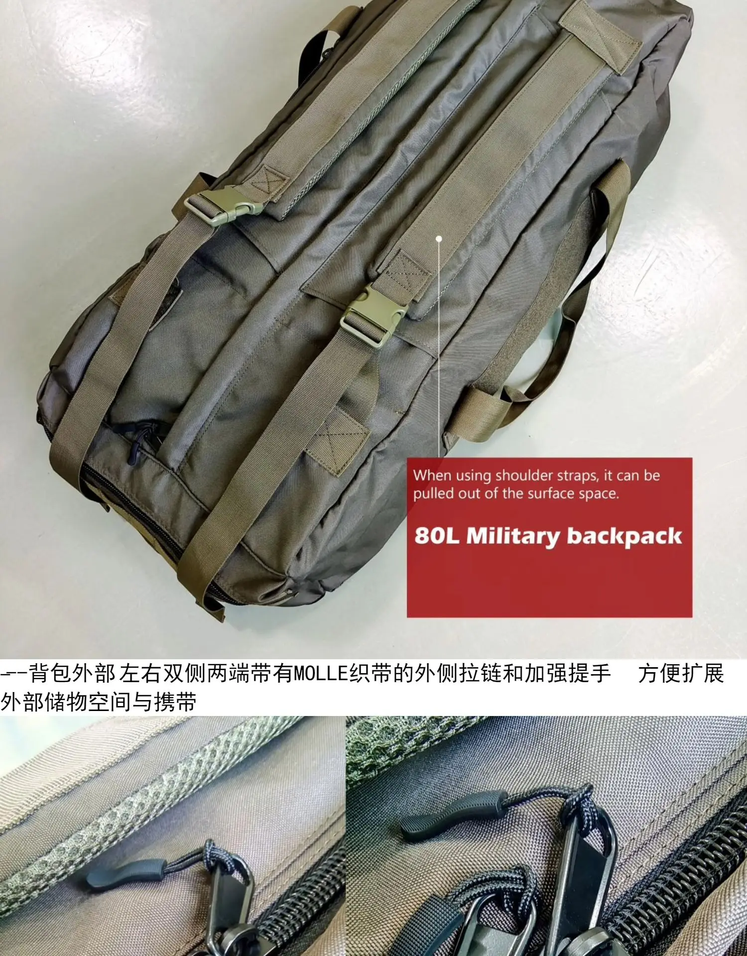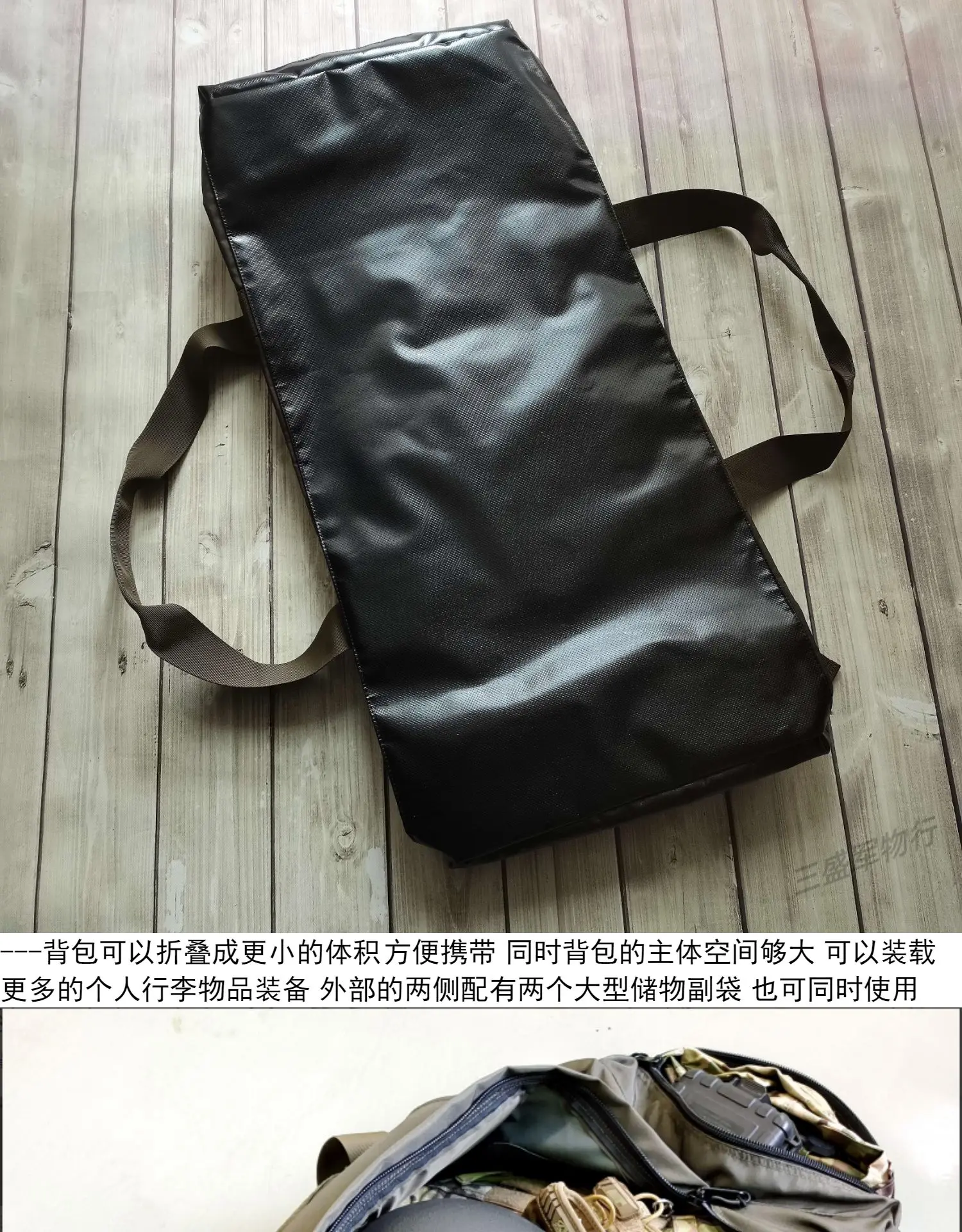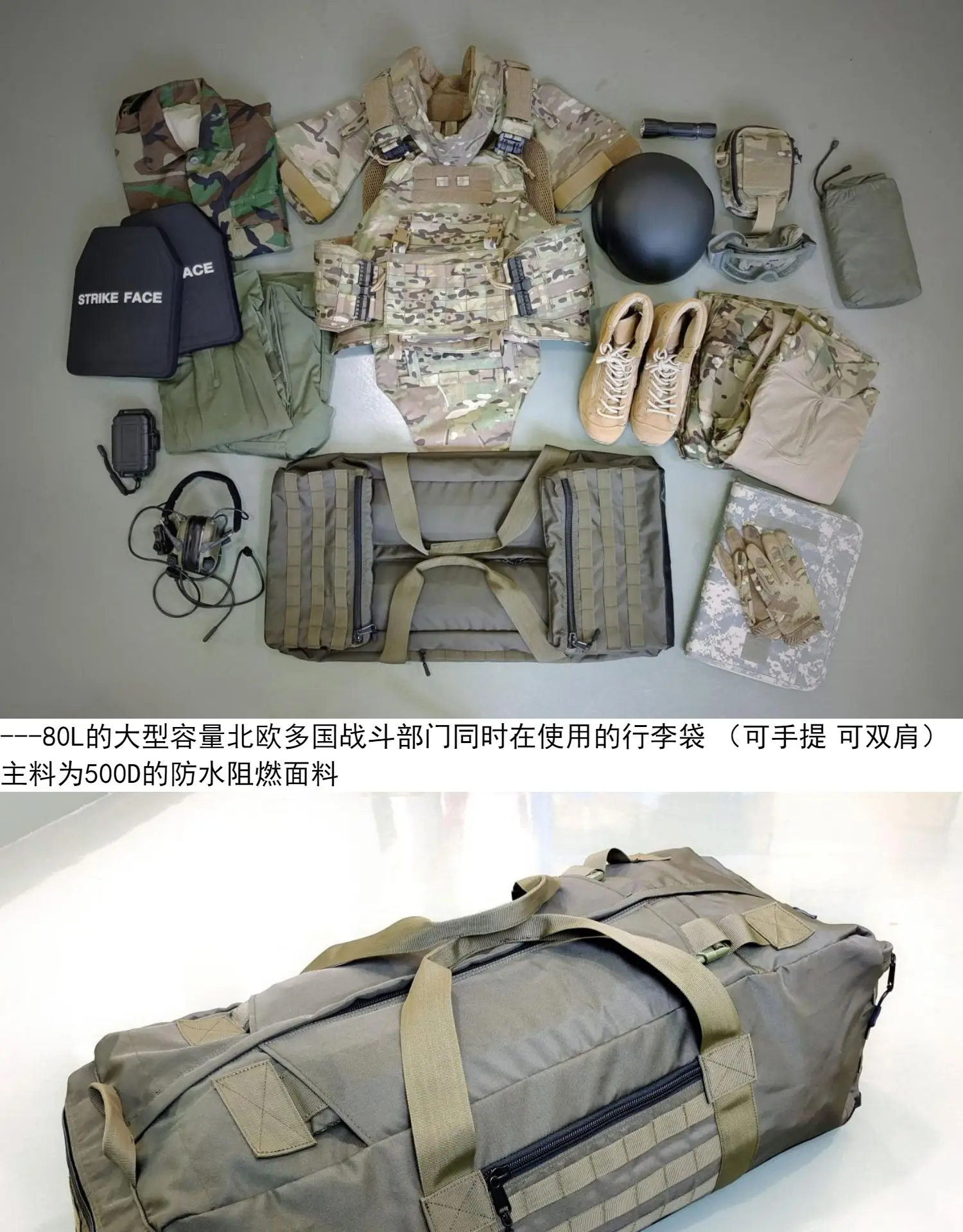 Gran CAPACIDAD DE 80L (se puede llevar en ambos hombros), el material principal es 500D tela impermeable e ignífuga