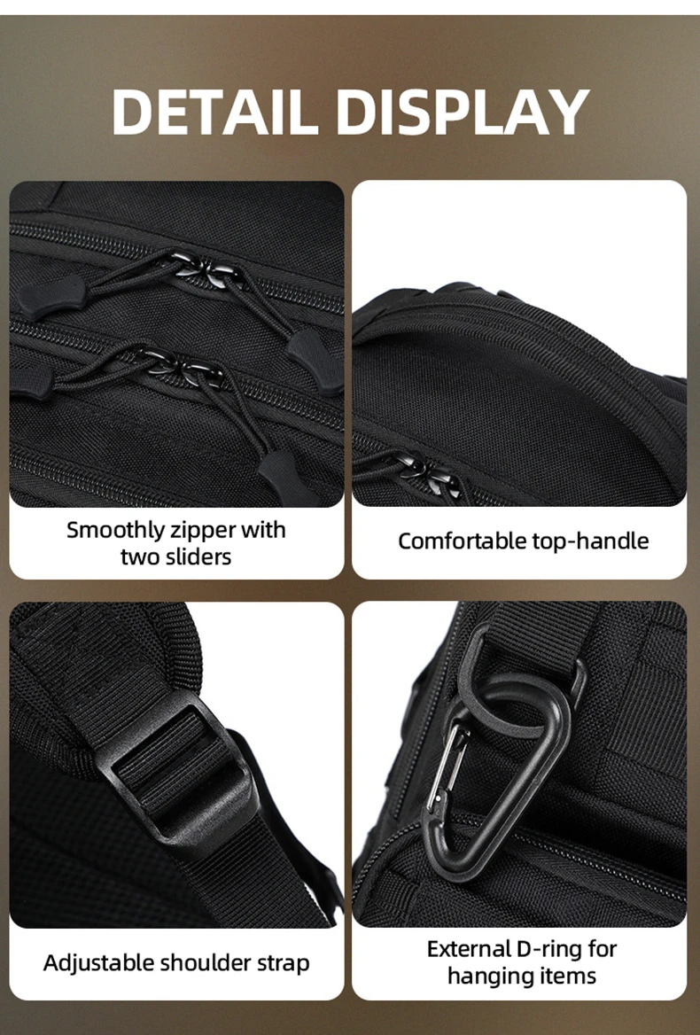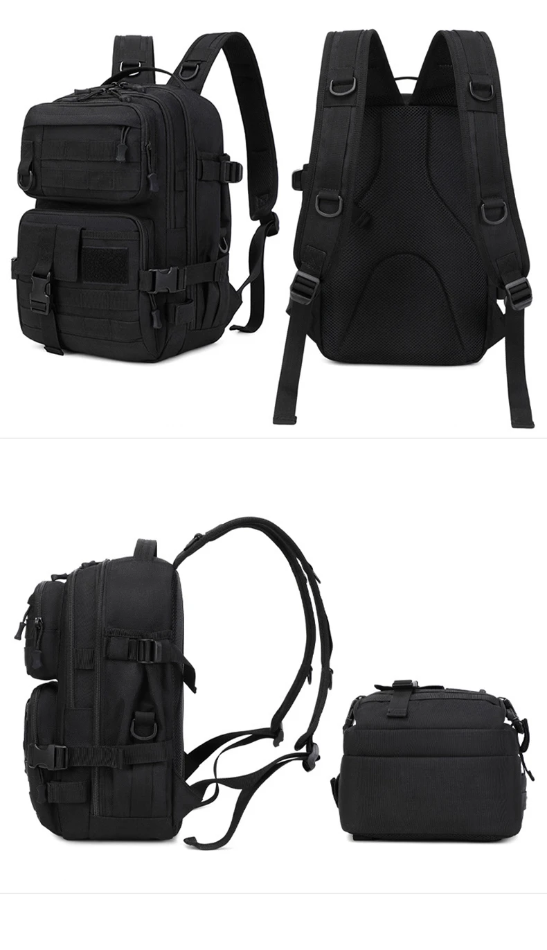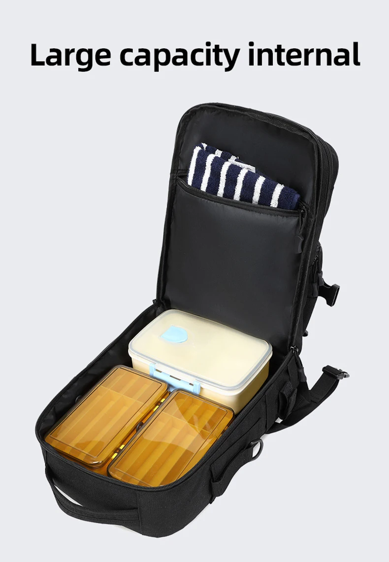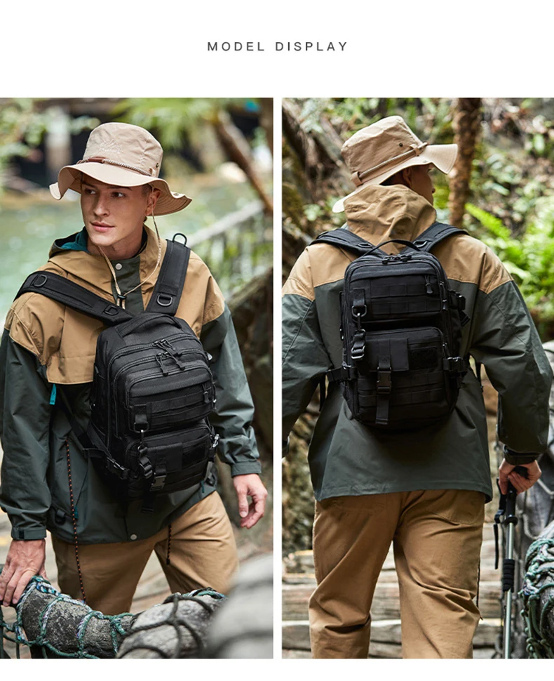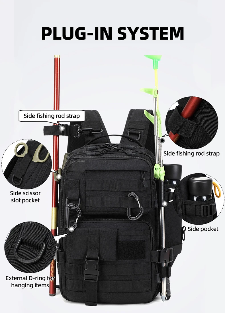 5.El diseño colgante externo puede transportar todo tipo de objetos: las correas laterales pueden fijar cañas de pescar; El bolsillo lateral puede contener tijeras; Correas de sujeción, llaves, etc.