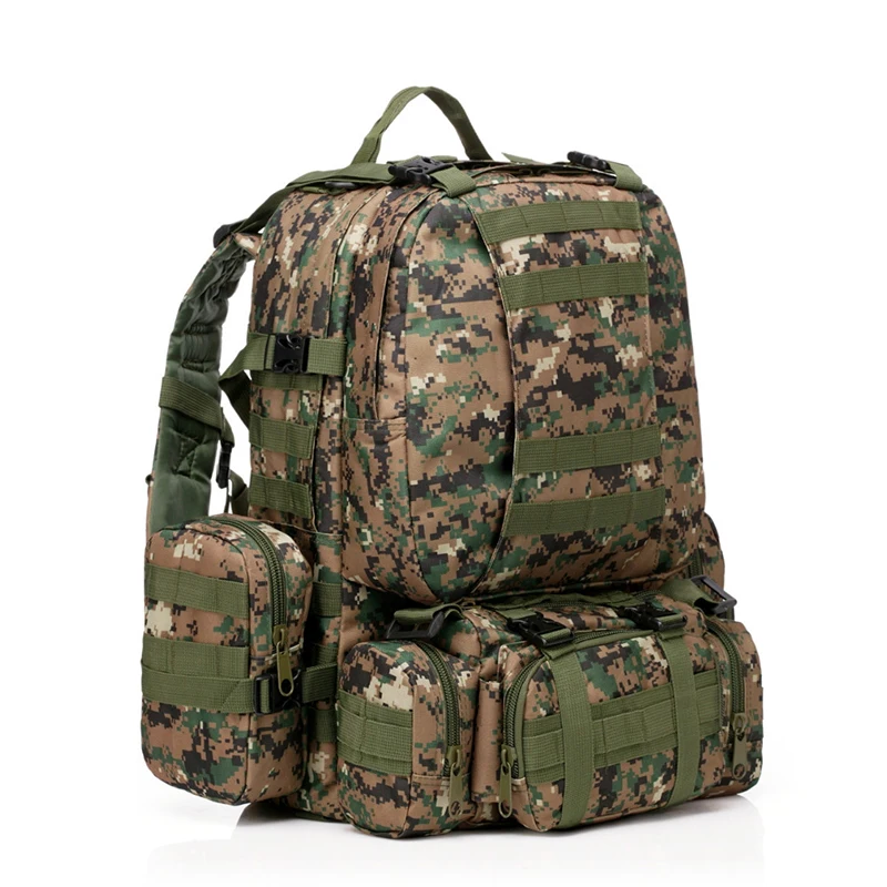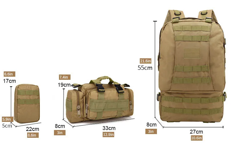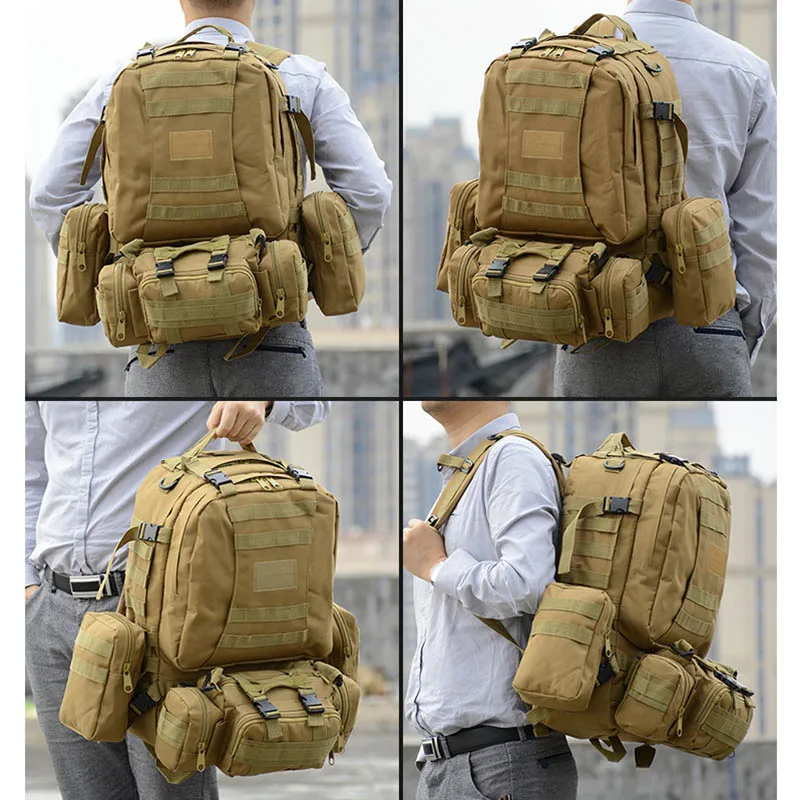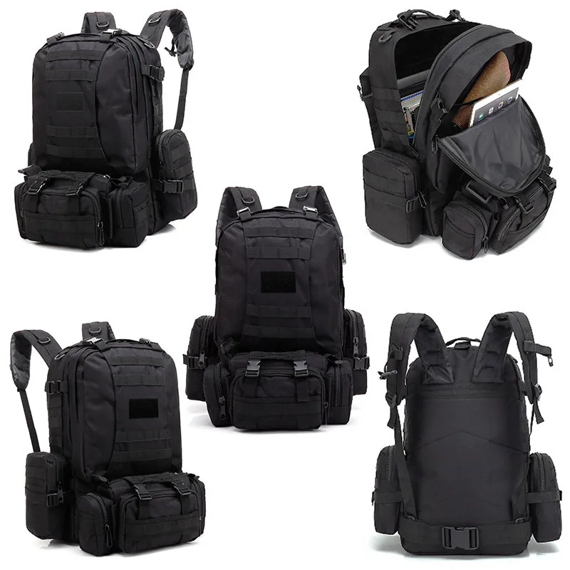 Con 3 bolsas de molle desmontables en la parte delantera y en los dos lados.