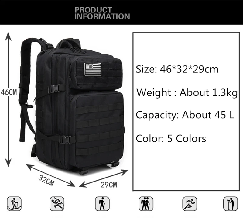 Mochila táctica de gran capacidad para exteriores de 45L, impermeable, usable, para hombres, senderismo, equipo de caza militar, mochila para acampar, bolsas
