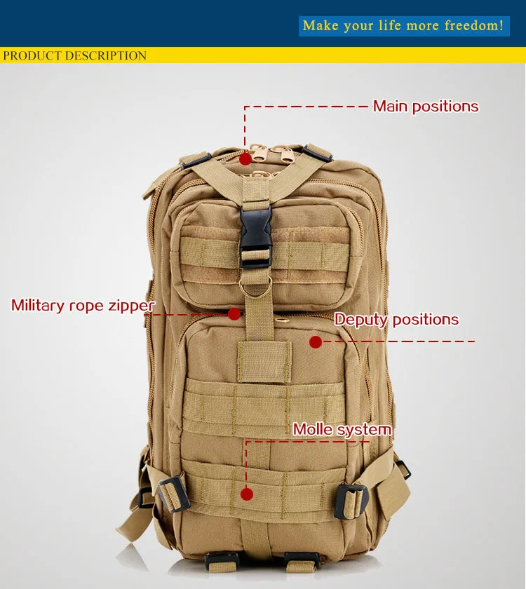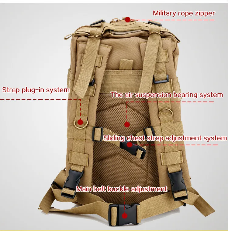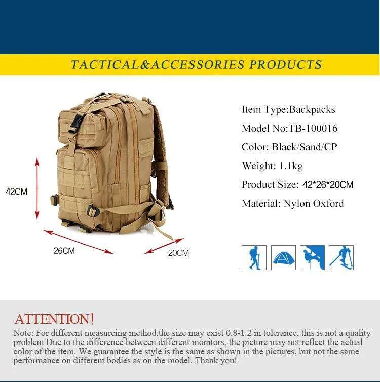 Tipo de Bolsa: Bolsa de exterior Material: tela impermeable Oxford 900D de alta densidad Forro: nailon Tamaño del paquete: 42*26*20cm Capacidad del paquete: 50L Peso: alrededor de 1,1 kg Dureza: medio a suave USOS: correr, senderismo, camping, deportes tácticos Personas aplicables: hombres y mujeres El paquete incluye: 1 bolsa para exteriores