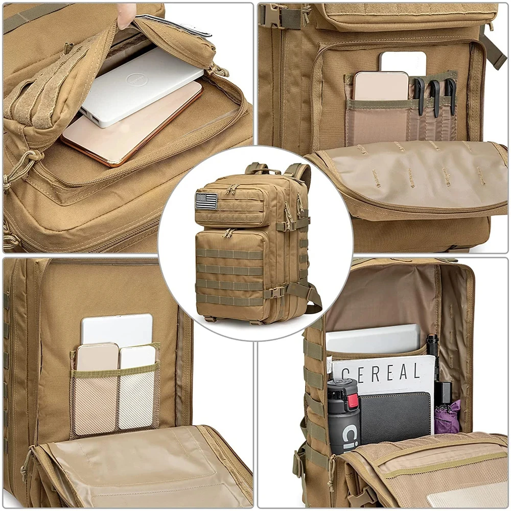 [Multifuncional y multicompartimento] La espaciosa mochila militar tiene múltiples compartimentos y bolsillos dobles con cierre de cremallera, incluidos bolsillos internos con cremallera y bolsillos de malla, que aumentan las opciones de almacenamiento para satisfacer su vida diaria y sus necesidades al aire libre. 2 compartimentos principales grandes, 2 compartimentos pequeños delanteros y 1 compartimento trasero. El compartimento grande está equipado con correas elásticas para fijar el portátil o cualquier cosa que no desee mover. Cada compartimento tiene bolsillos de malla o bolsillos con cremallera para ayudar a organizar.