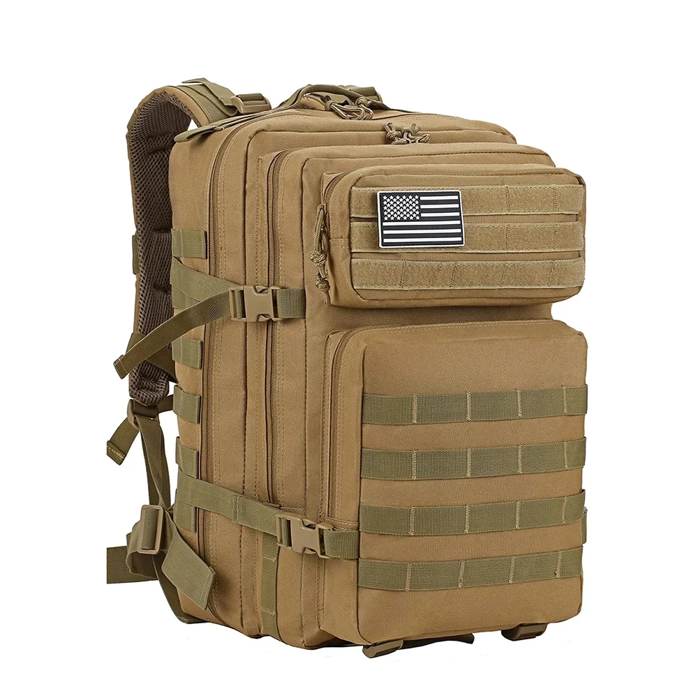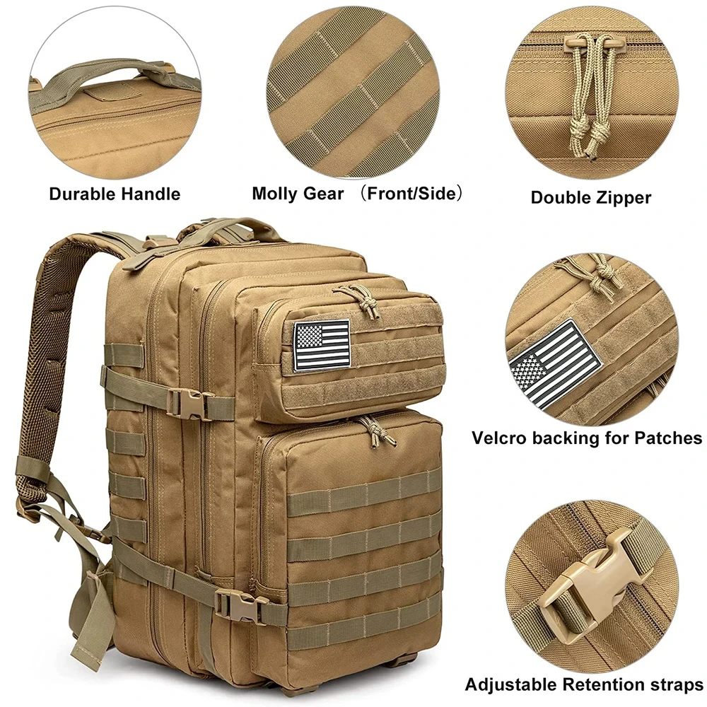 [Sistema militar MOLLE] El sistema de correas molle de la mochila táctica está diseñado para facilitar la fijación de bolsas tácticas Molle adicionales o más equipos. La parte delantera de la mochila tiene 3 filas de áreas de Velcro Molle, y la parte delantera y los lados, así como las correas inferiores y de hombro están equipadas con correa de conexiones Molle, la correa de hombro con dos anillos en D puede colgar cosas, Y la correa en la parte inferior se puede utilizar para fijar tiendas de campaña y colchonetas para dormir u otros equipos al aire libre.