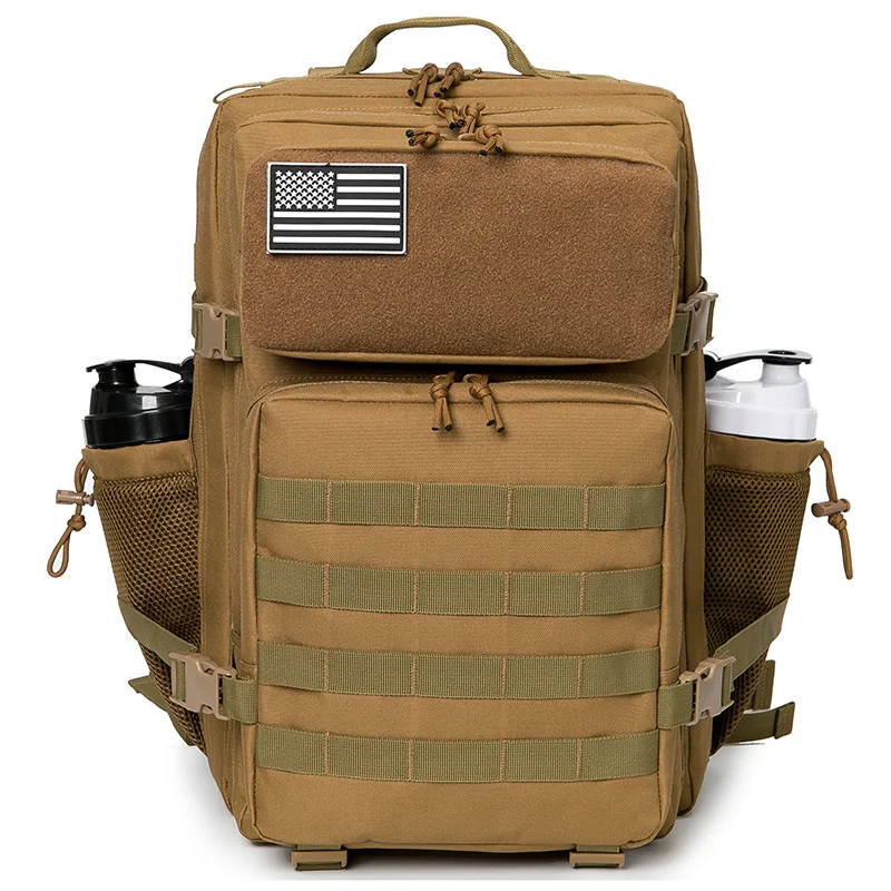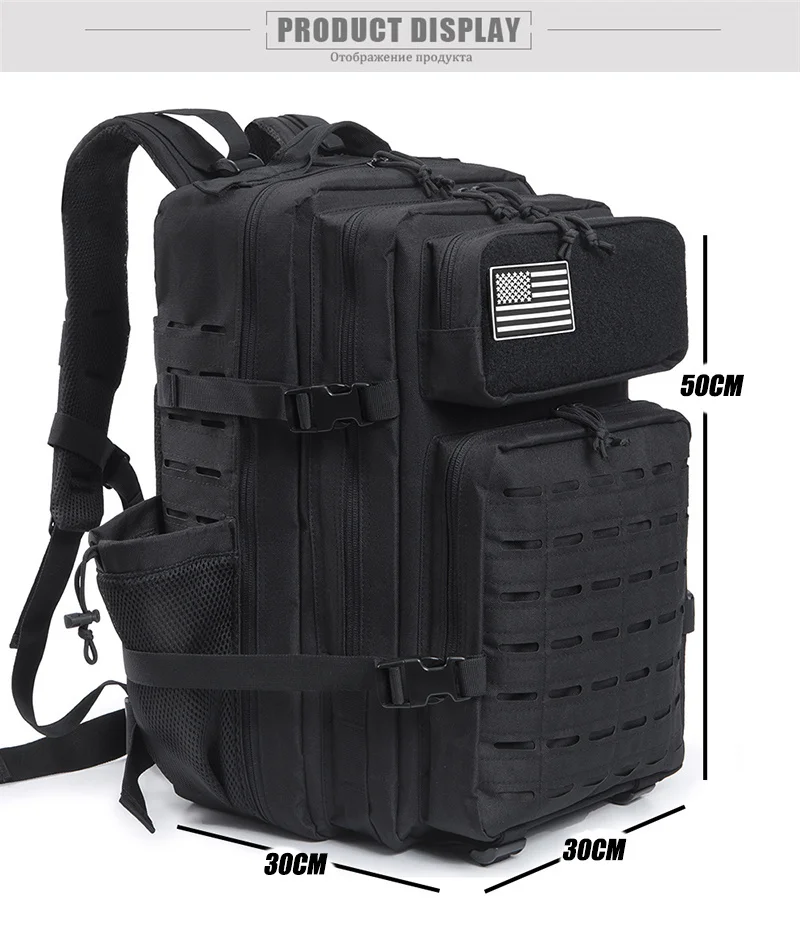 ✅【EL ESPACIO QUE NECESA】 Esta mochila táctica tamaño aproximado: 50cm x 30 cm x 30 cm Dimensiones y tamaño apropiado 45L de capacidad, este paquete tiene espacio para todo su equipo esencial. Los grandes compartimentos de almacenamiento interiores multicapa pueden acomodar una gran cantidad de equipos al aire libre y también satisfacer sus necesidades de viaje diarias. Gran Área de velcro, haga la mochila diferente a otras mochilas, puede pegar cualquier parche que desee.. Un parche de la bandera estadounidense para regalo (se puede quitar).