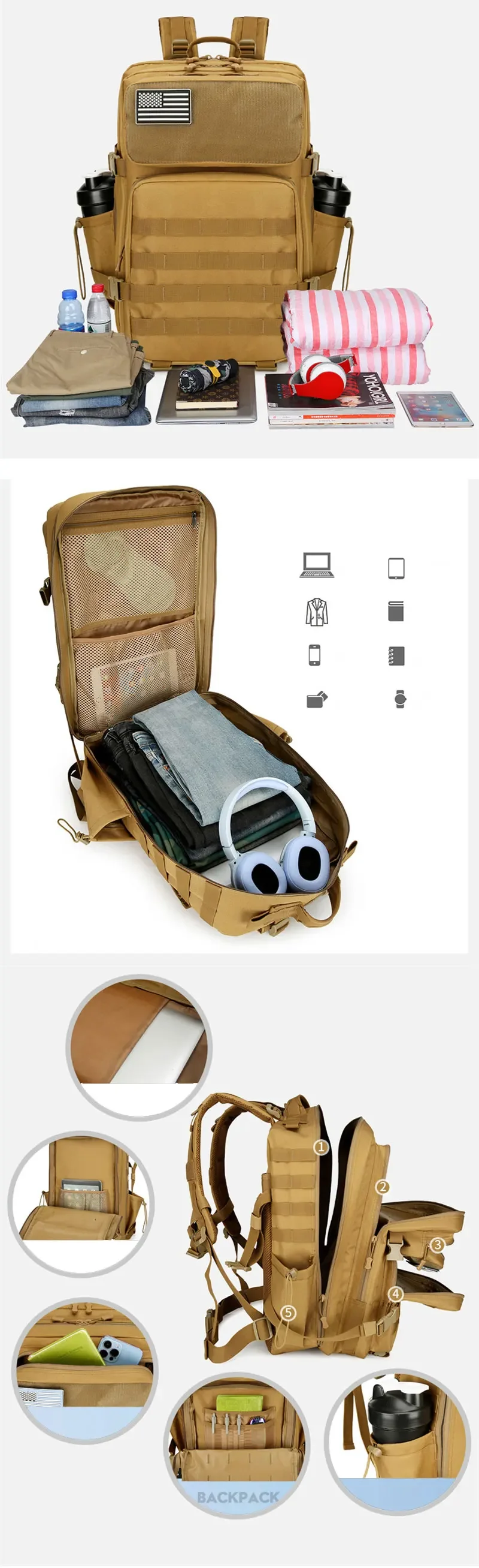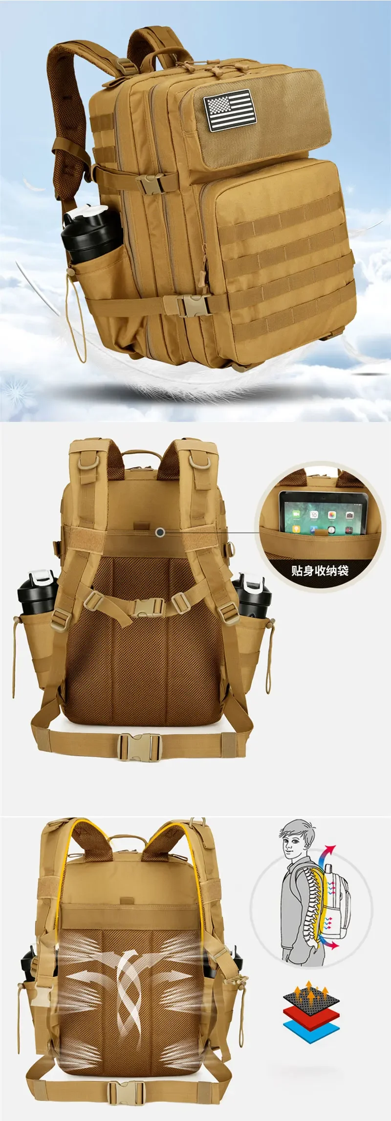Mochila táctica Molle F 45L, mochila MOLLE de caza, gimnasio para hombres EDC, mochila de supervivencia para senderismo al aire libre, portabotellas de bruja