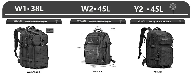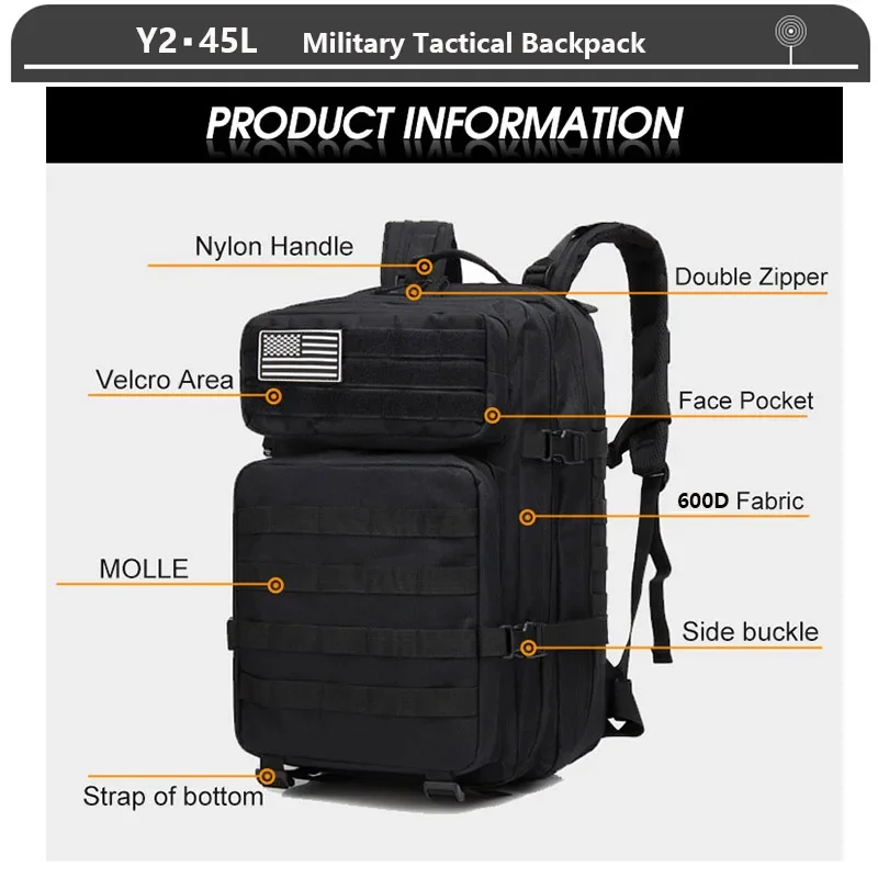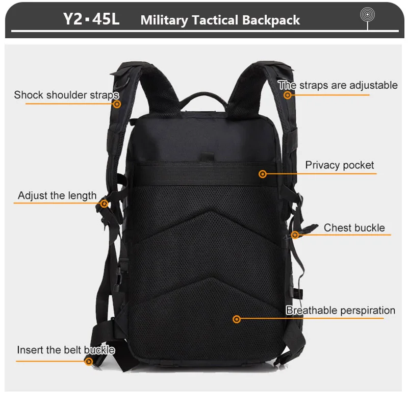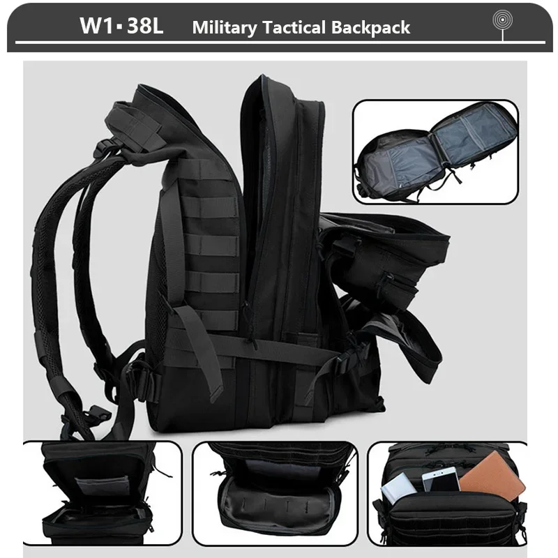 • Alta capacidad:Esta mochila táctica cuenta con una gran capacidad de 38/45 litros, perfecta para largas aventuras al aire libre como caminatas, campamentos y viajes.