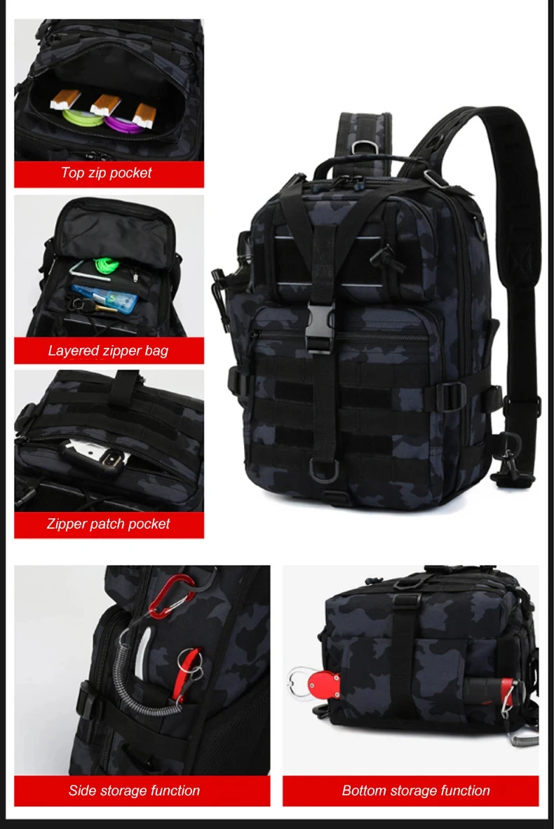 2.Función de almacenamiento multifuncional, bolsa con cremallera superior, bolsa con cremallera en capas, bolsa con pegatinas con cremallera, función de almacenamiento lateral y función de almacenamiento inferior, el equipo de pesca se puede almacenar libremente, fácil acceso