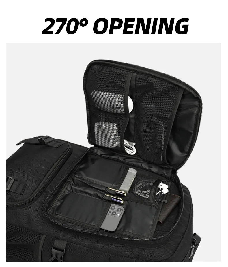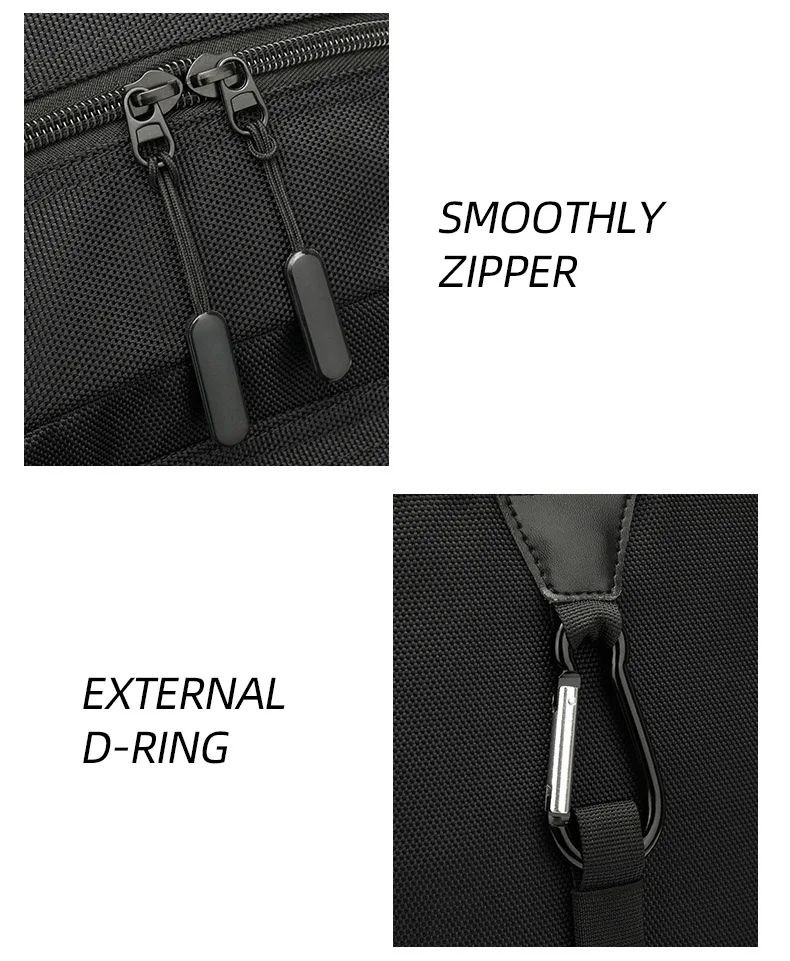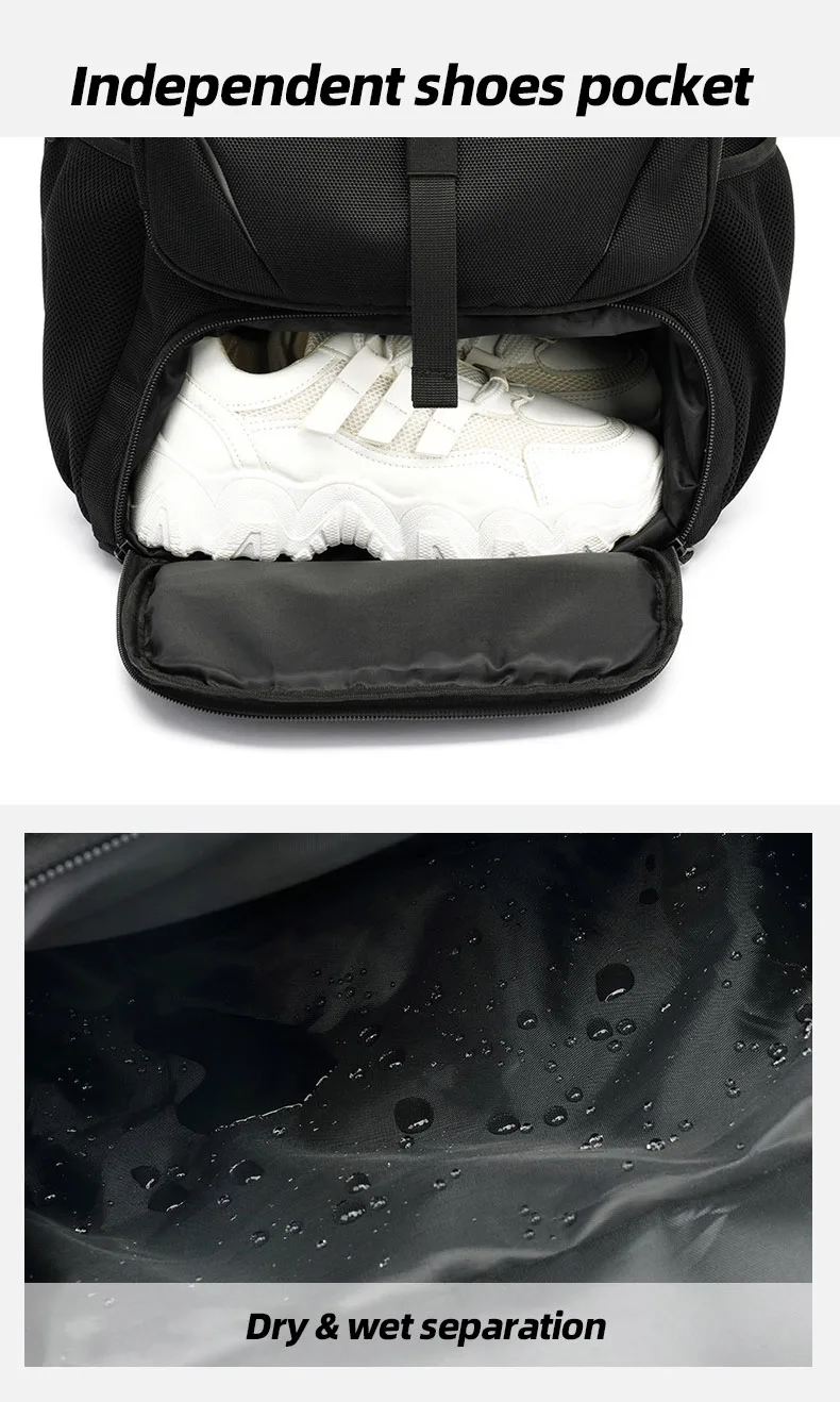 1.Bolsillo para zapatos con separación seca y húmeda: separación independiente, mantiene la ropa limpia y libre de suciedad