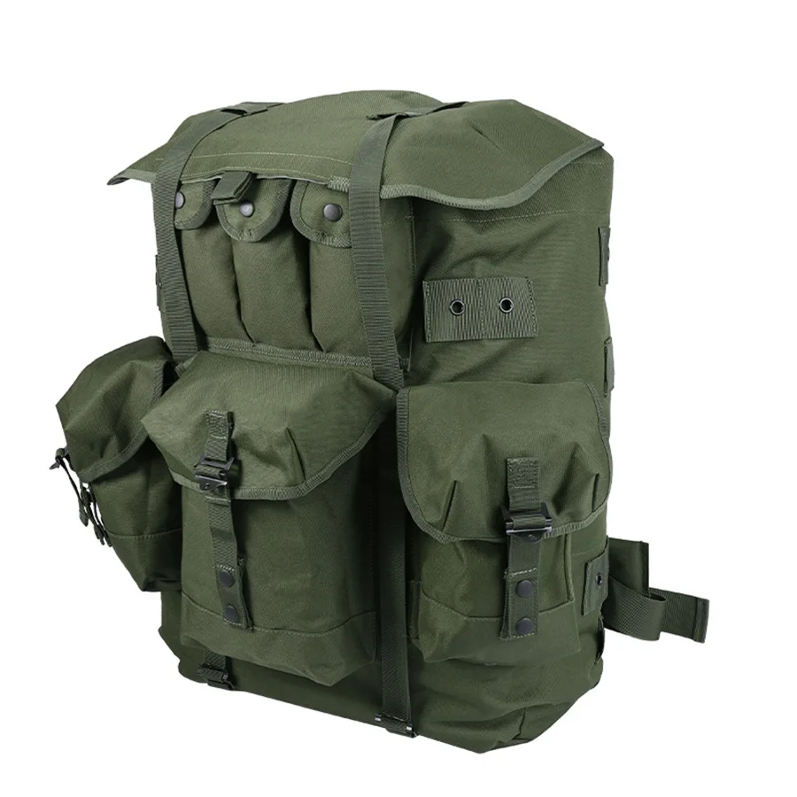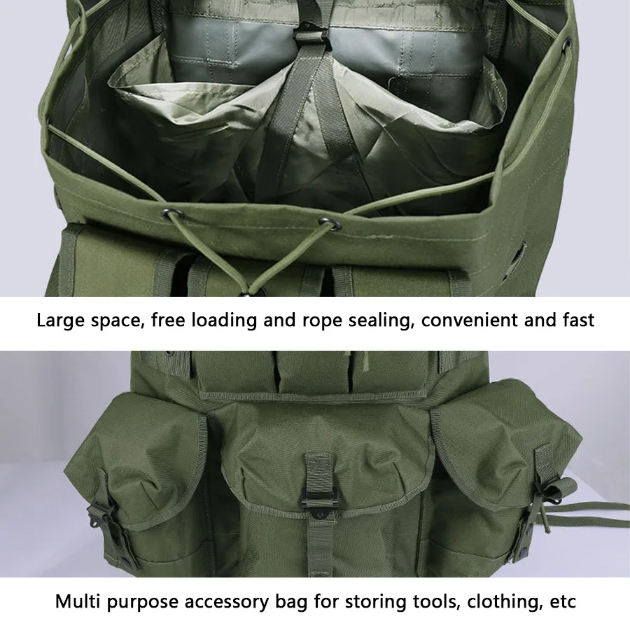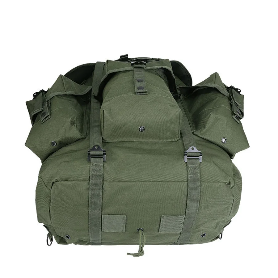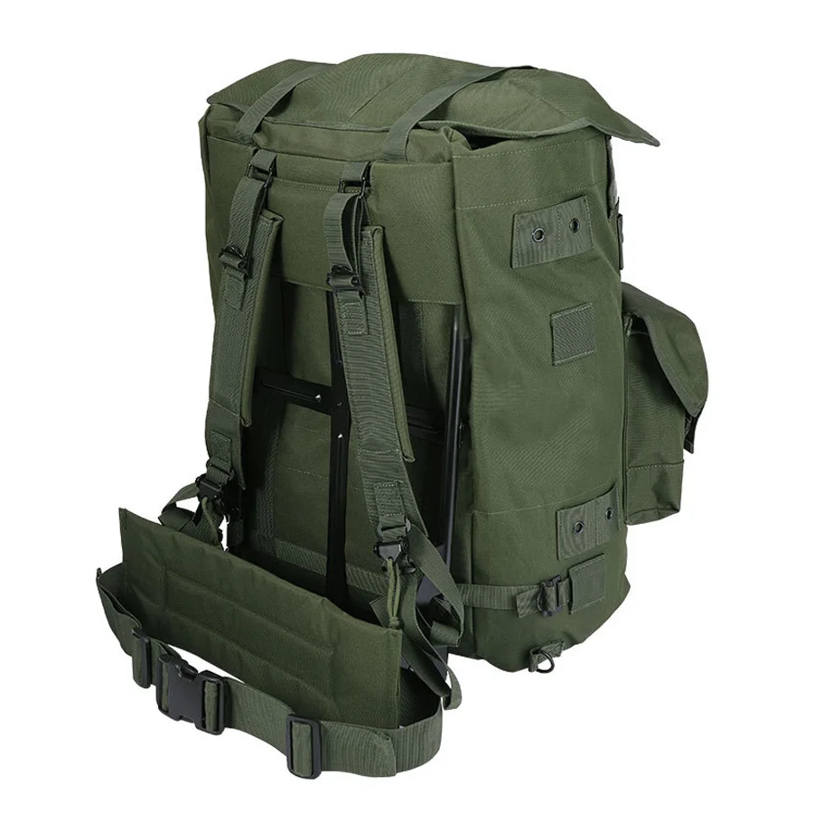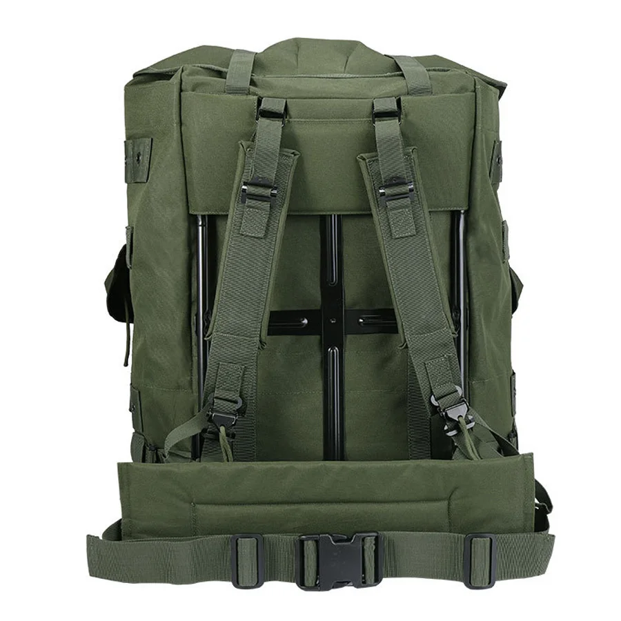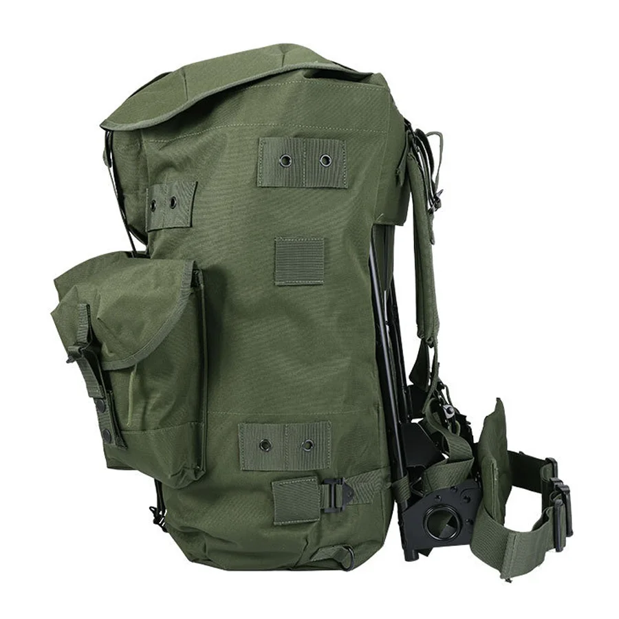 Mochila verde oliva con marco de hierro vendedora caliente para montañismo, mochila de suministros de camping de gran capacidad