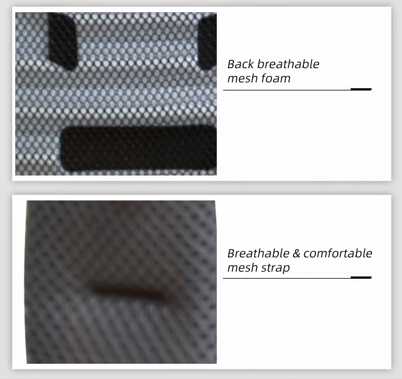 5.Cómodo y transpirable, fácil de transportar: el sistema de transporte de la guía de aire puede drenar el aire, ventilar y sudar, y la parte posterior está hecha de tela tridimensional de panal, que tiene un mejor rendimiento de ventilación.