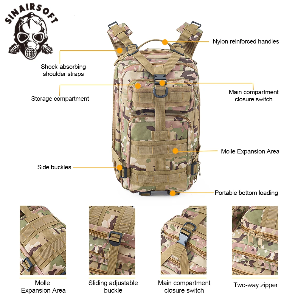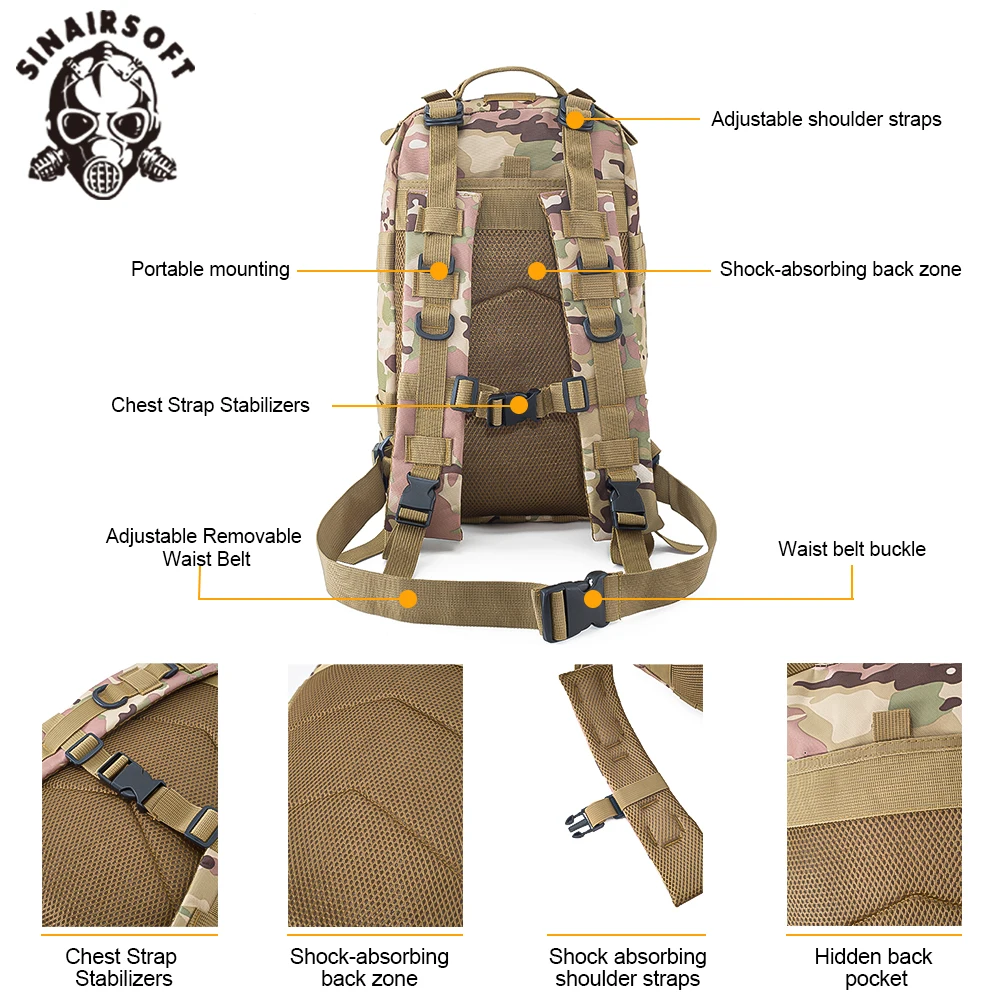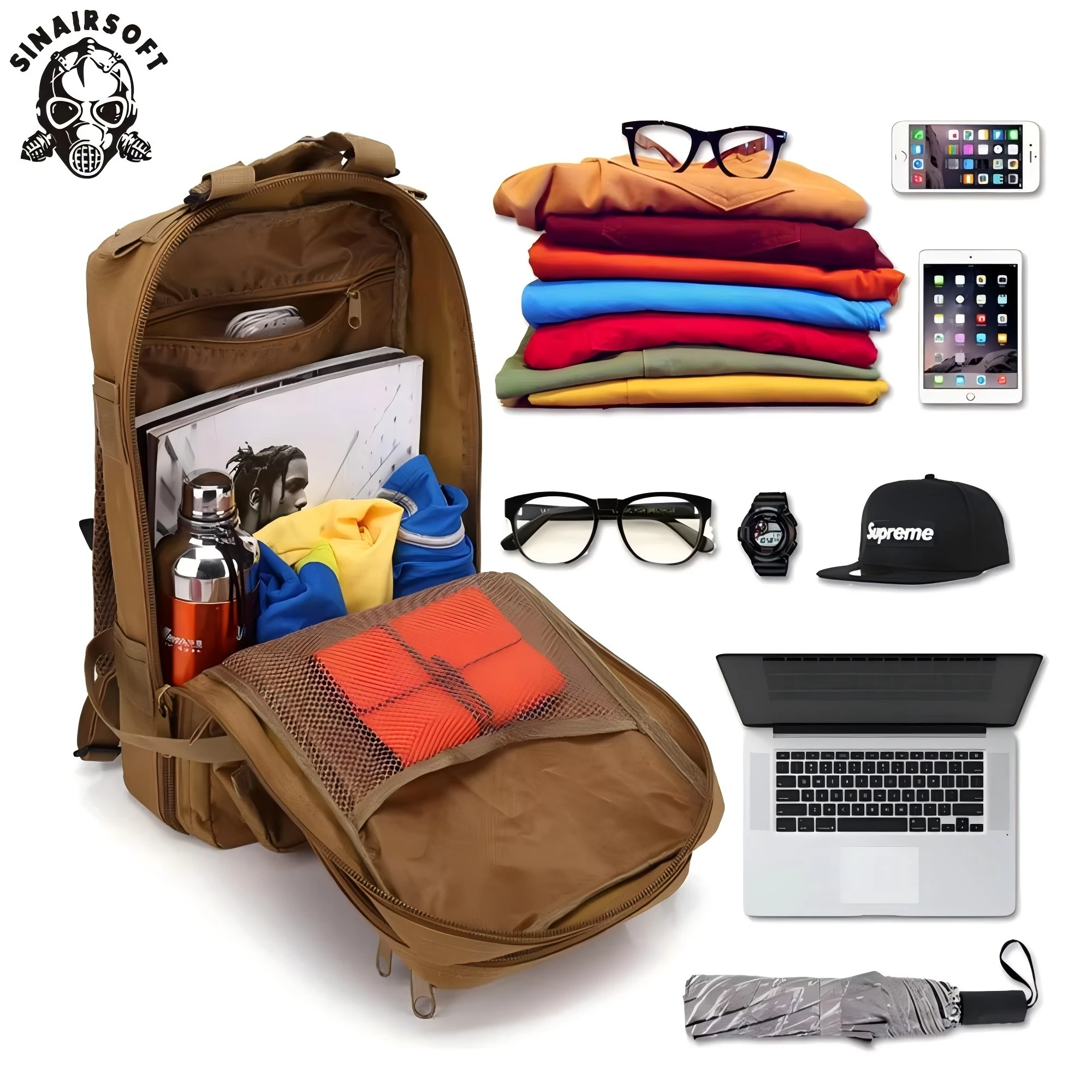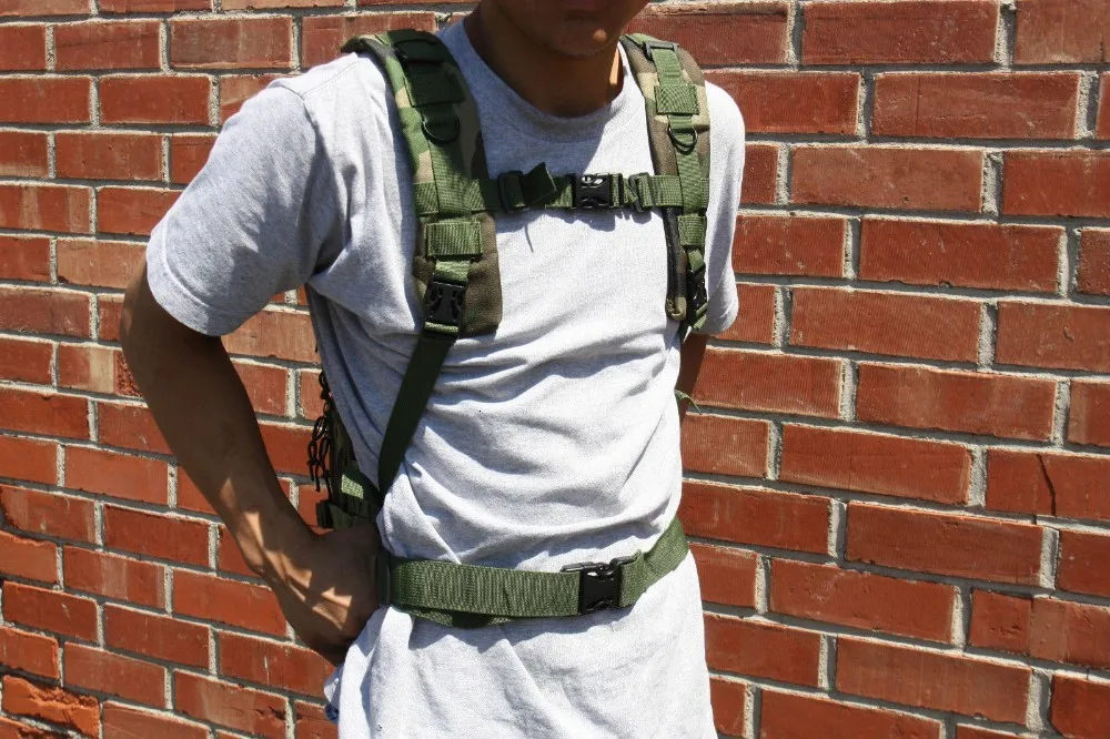 Otro grupo de correas de arriba y abajo se pueden montar sacos de dormir, tiendas de campaña, chaquetas grandes, cuerdas y otras herramientas portátiles grandes.