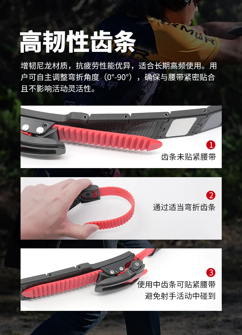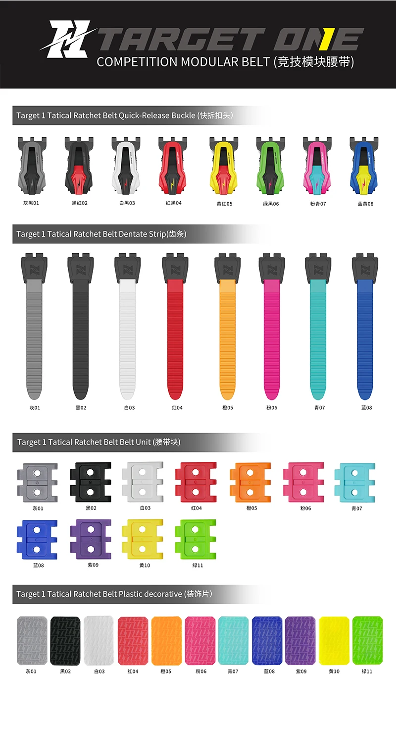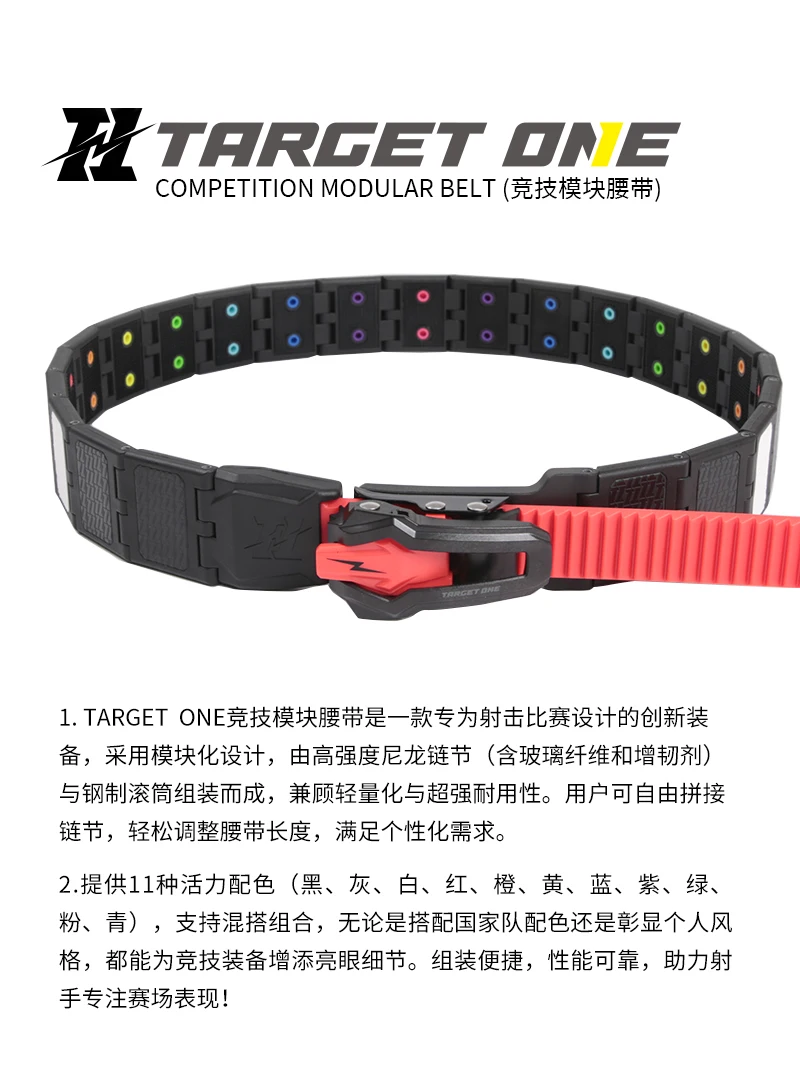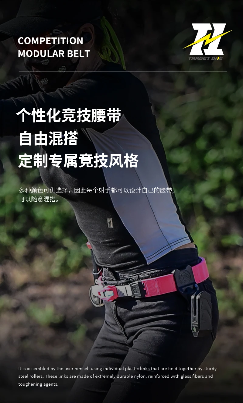 El cinturón modular competitivo TARGET ONE es un equipo innovador especialmente diseñado para competiciones de tiro.Adopta un diseño modular y está ensamblado a partir de eslabones de cadena de nailon de alta resistencia (que contengan fibra de vidrio y agentes de endurecimiento) y rodillos de acero, teniendo en cuenta tanto su peso ligero como su súper durabilidad.Los usuarios pueden ensamblar libremente los eslabones de la cadena y ajustar fácilmente la longitud del cinturón para satisfacer necesidades personalizadas.