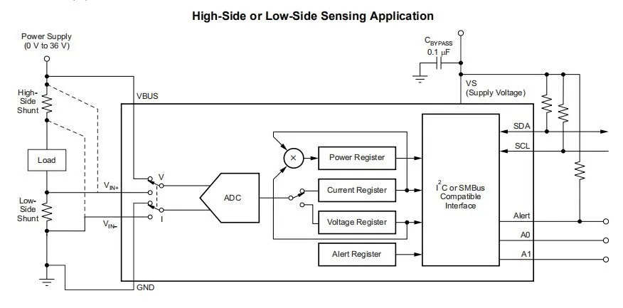 CaracterísticasDetecta tensiones del bus de 0 V a 36 V• Detección de lado alto o lado bajo• Repose la corriente, el voltaje y la potencia• Alta precisión:– Error de ganancia del 0,1% (máx.)– Desplazamiento de 10 μV (máx.)• Opciones medias configurables• 16 direcciones programables• Funciona desde una fuente de alimentación de 2,7 V hasta 5,5 V• Paquete de 10 pines, DGS (VSSOP)Aplicaciones• Servidores• Equipos de telecomunicaciones• Informática• Gestión de energía• Cargadores de baterías• Fuentes de alimentación• Equipo de pruebaVBUS: entrada de voltaje del bus