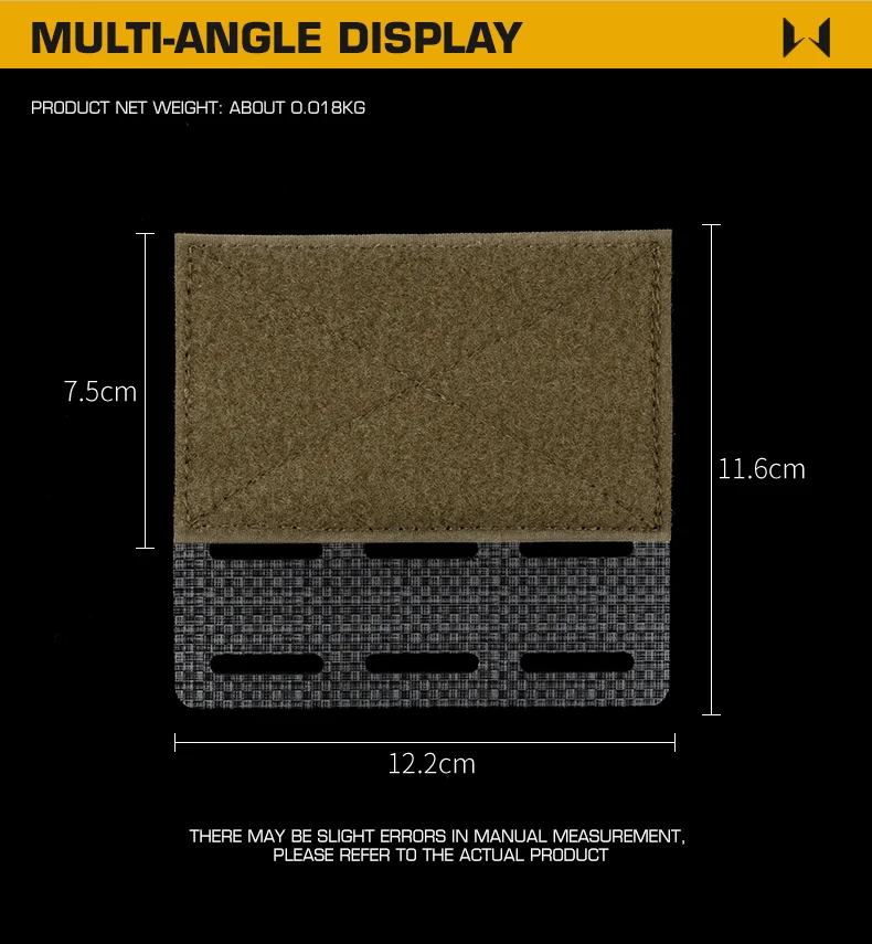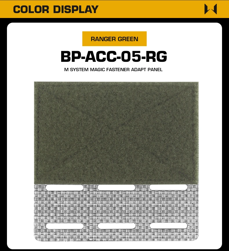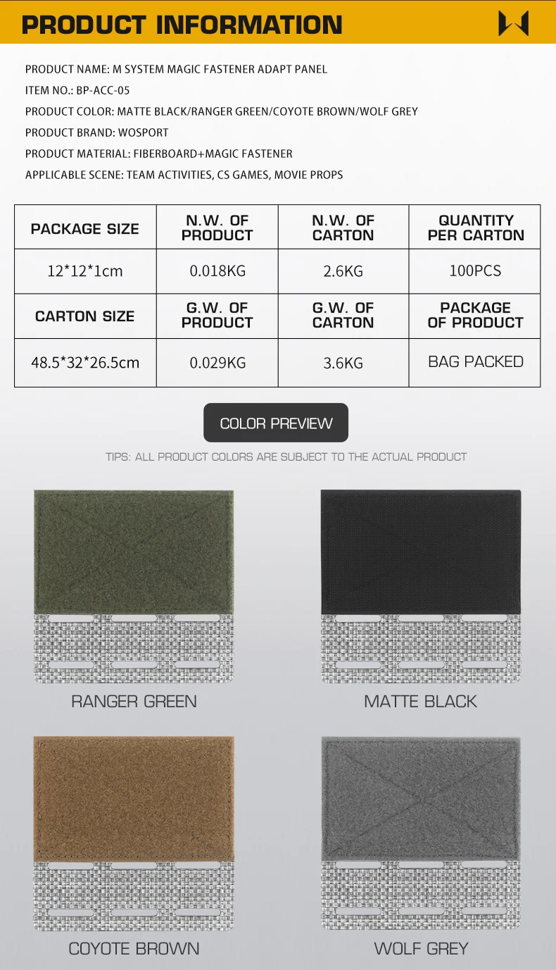 Información del producto Nombre del producto: Panel adaptador de sujetador mágico del sistema M Color del producto: negro mate/verde Ranger/marrón coyote/gris lobo. Material del producto: tablero de fibra + cierre mágico. Escena aplicable: actividades en equipo, juegos CS, accesorios de películas.