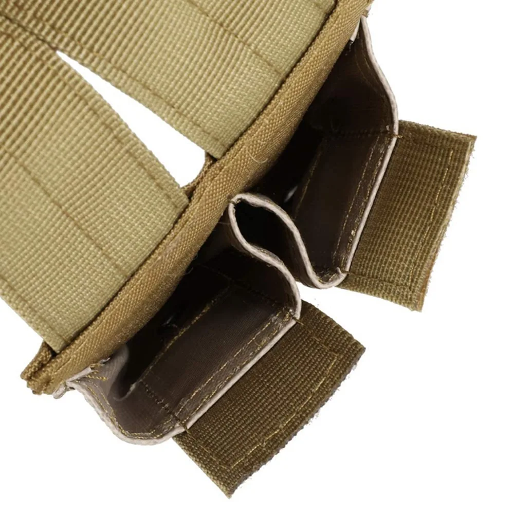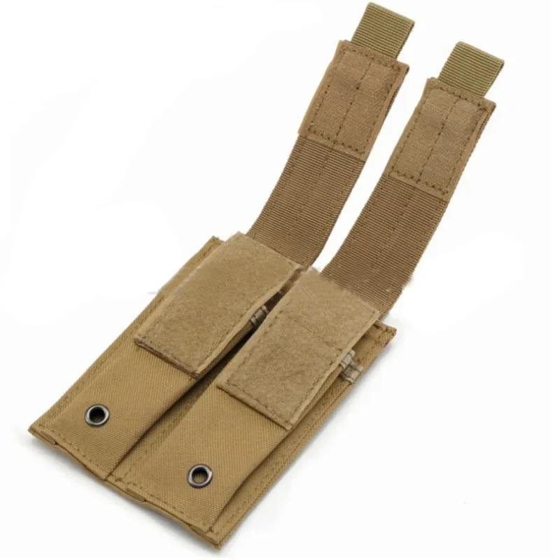 Fabricado con nylon Cordura 600D, más resistente al desgaste habitual. Dimensiones: 14x10 cm Peso: 80g La bolsa doble puede contener linterna, cuchillo u otros dispositivos. Sujete a su chaleco, cinturón, mochila u otro equipo Compatible con MOLLE. Cierre de cinta de sujeción cierra de forma segura la bolsa para la retención de la revista. La lengüeta de liberación rápida permite un acceso rápido para una recarga rápida.