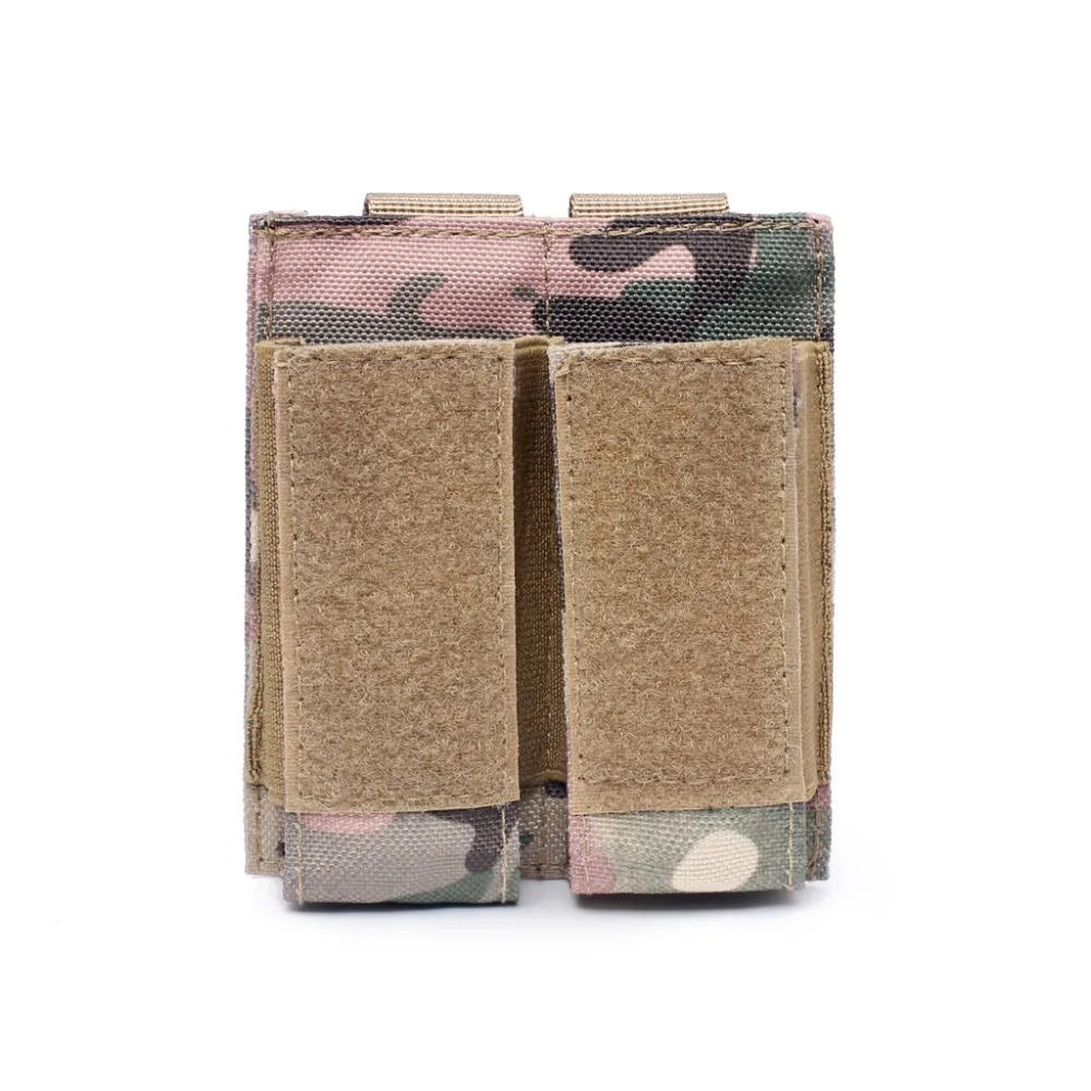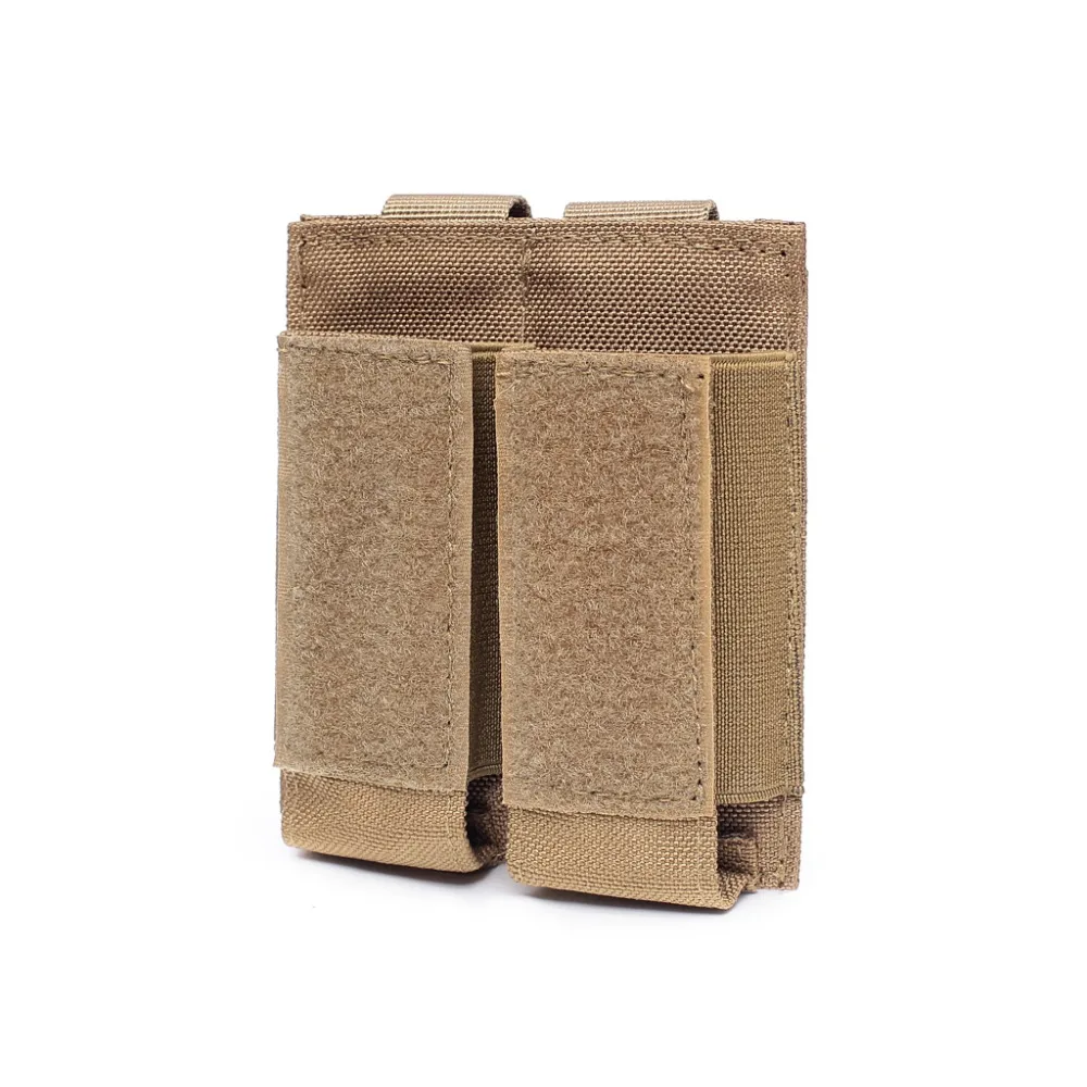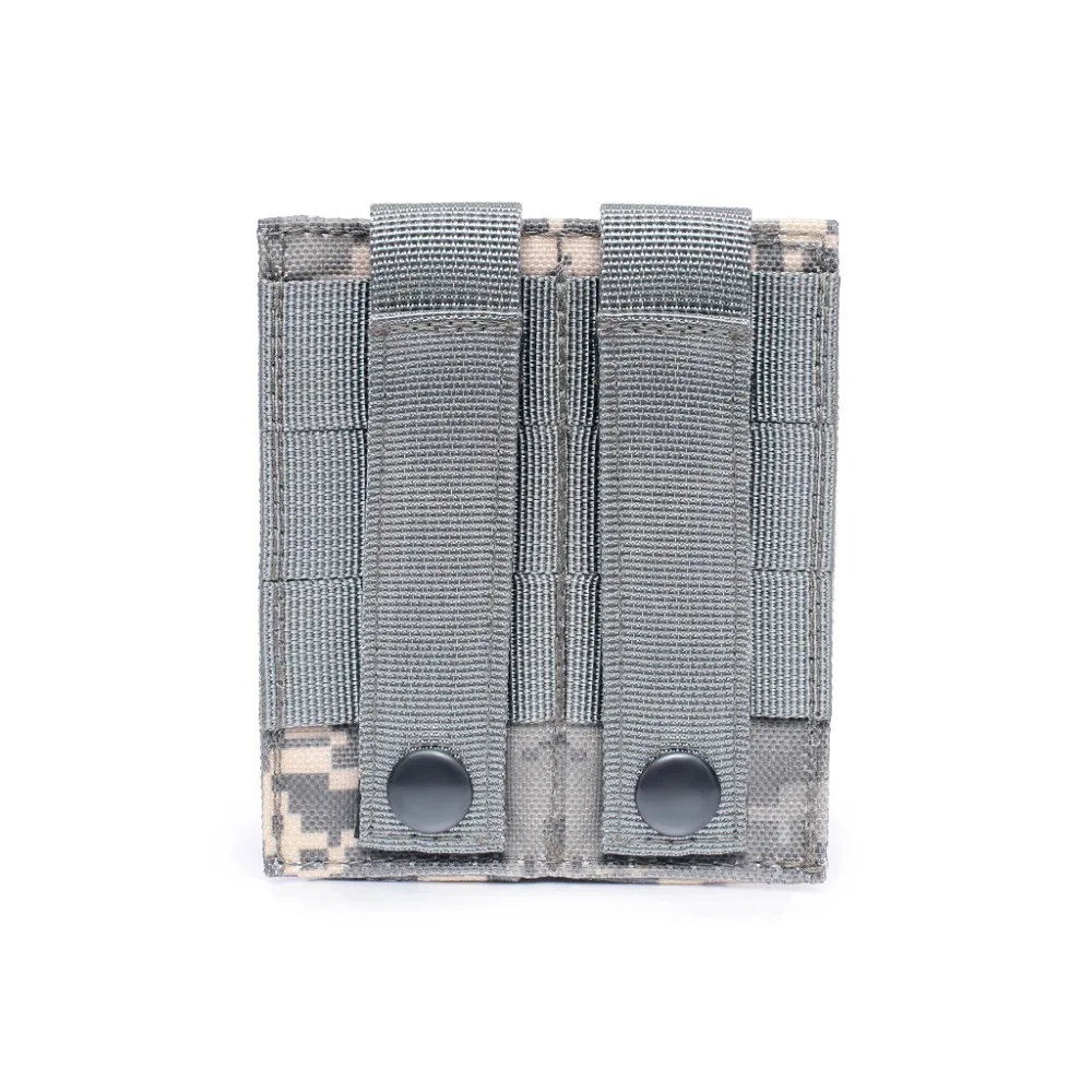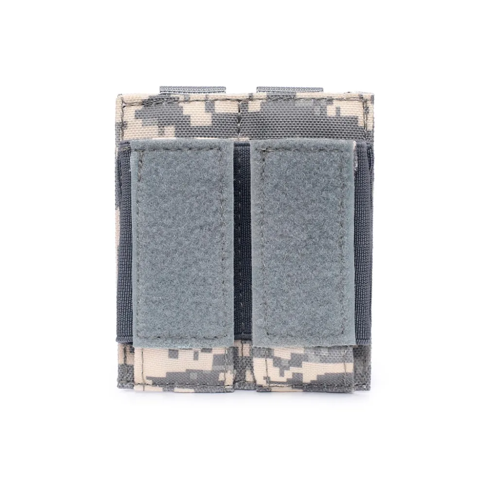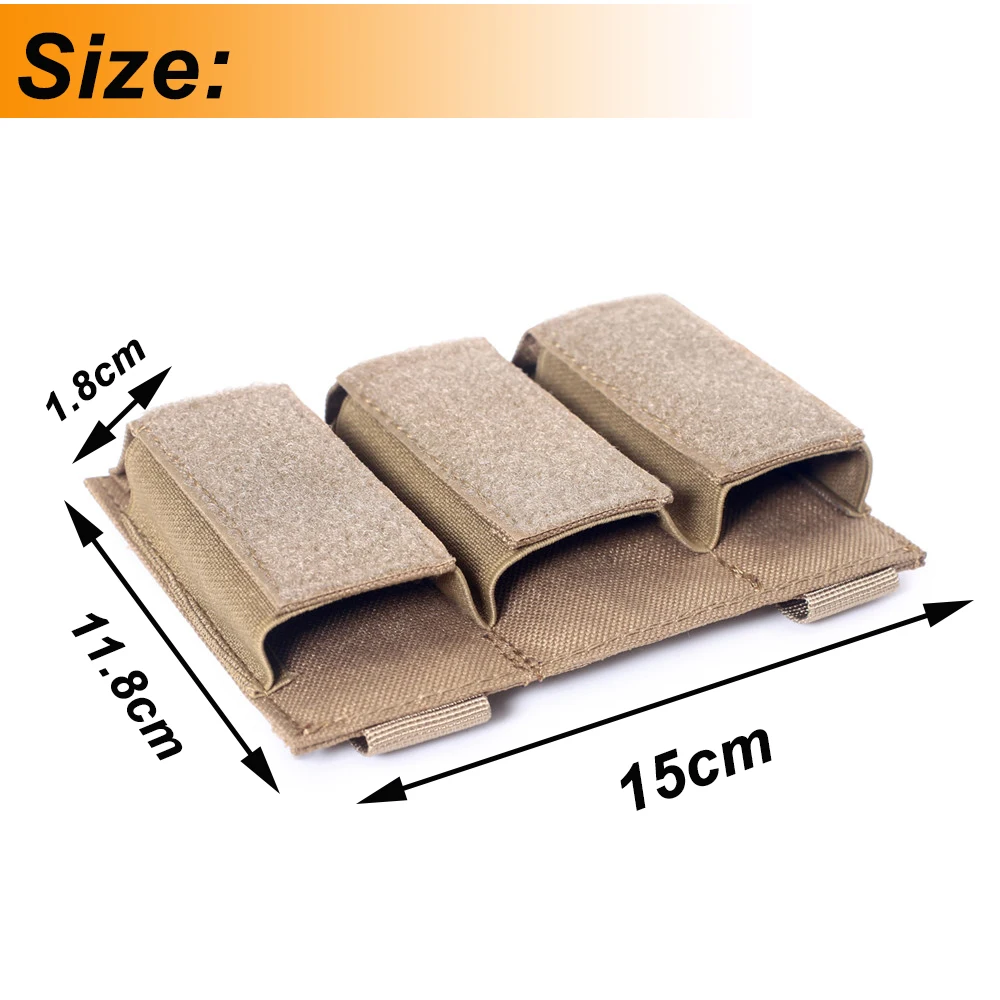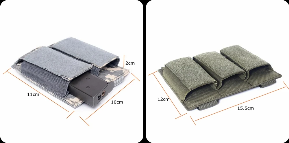Material: nailon 1000D Tamaño: Doble-10*2,8*11,3 cm/3,9*1,1*4.5in Triple-11,8*15*1,8 cm/4,65*5,90*0.7in Peso: 2, 2, 1, 2, 2, 1, 2, 2, 2 Diseño de vástago Molle. Puedes sujetarlo al chaleco, cinturón, mochila. La bolsa doble puede contener linterna, cuchillo u otros dispositivos.
