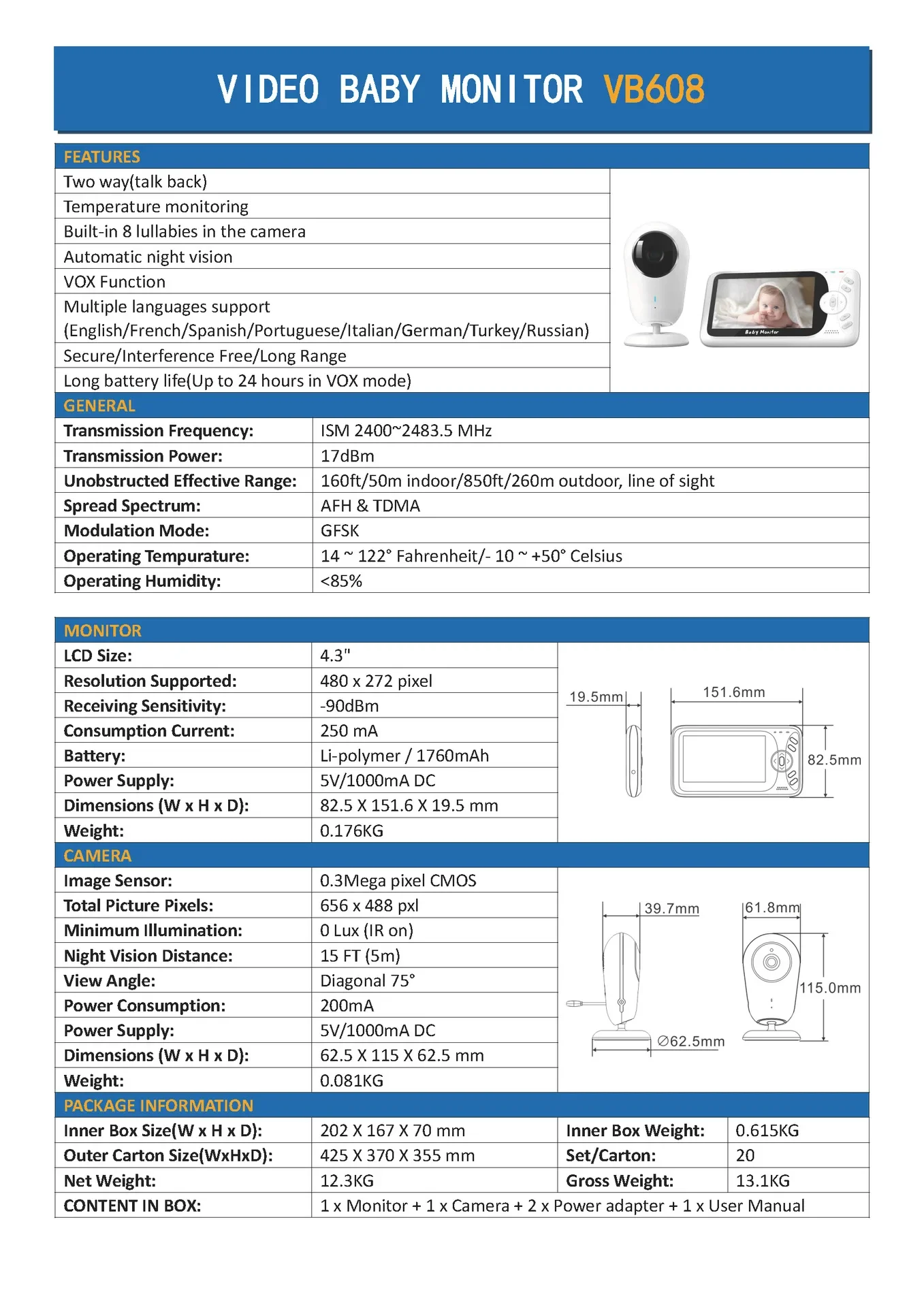 Monitor de vídeo para bebé 2,4G inalámbrico con pantalla LCD de 4,3 pulgadas Audio bidireccional conversación visión nocturna vigilancia cámara de seguridad BabysitterVB608