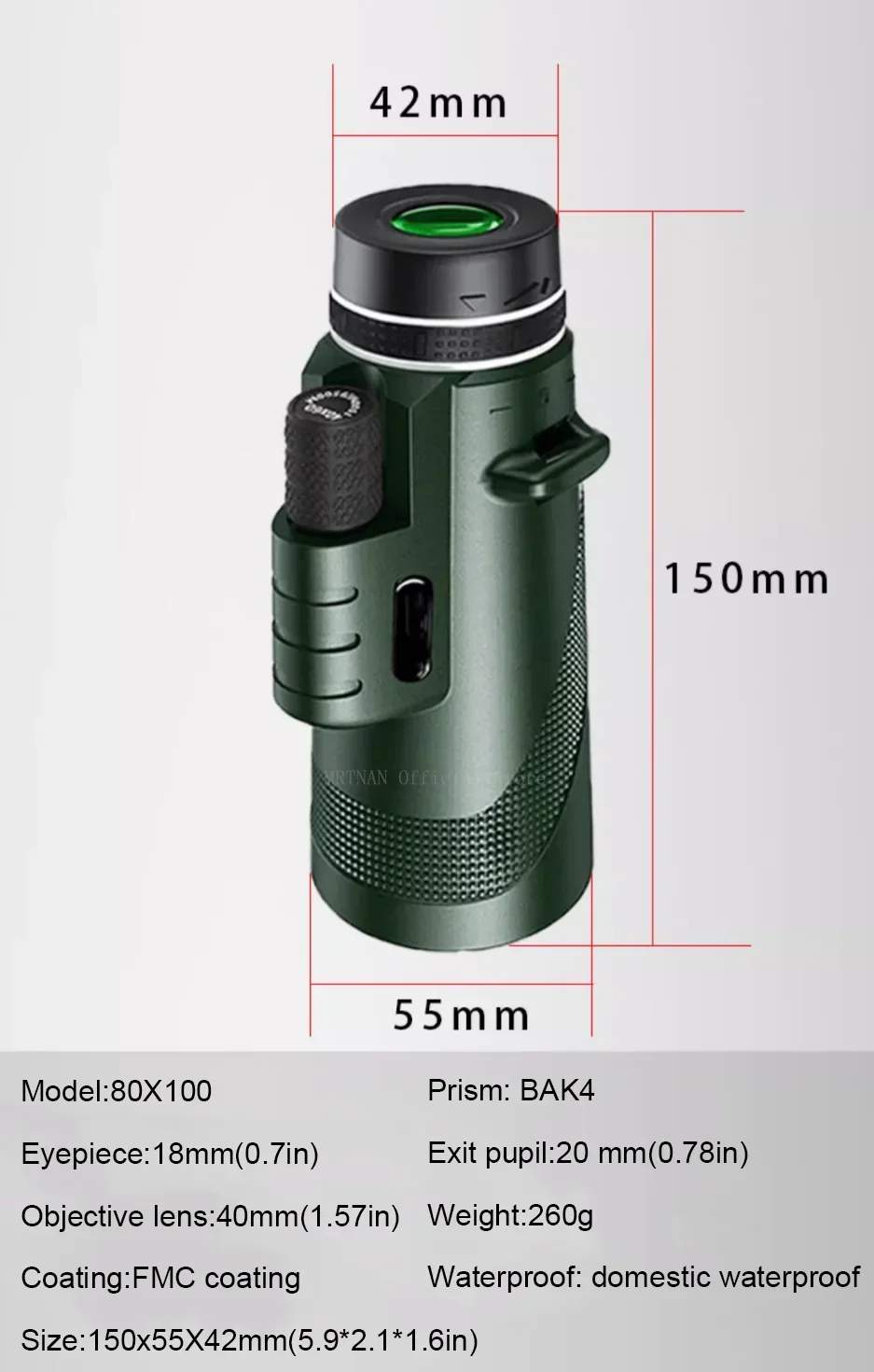 Monocular HD 80x100 para teléfono inteligente, adaptador, trípode, telescopio con prisma BAK4 para observación de aves, caza, senderismo, Camping al aire libre