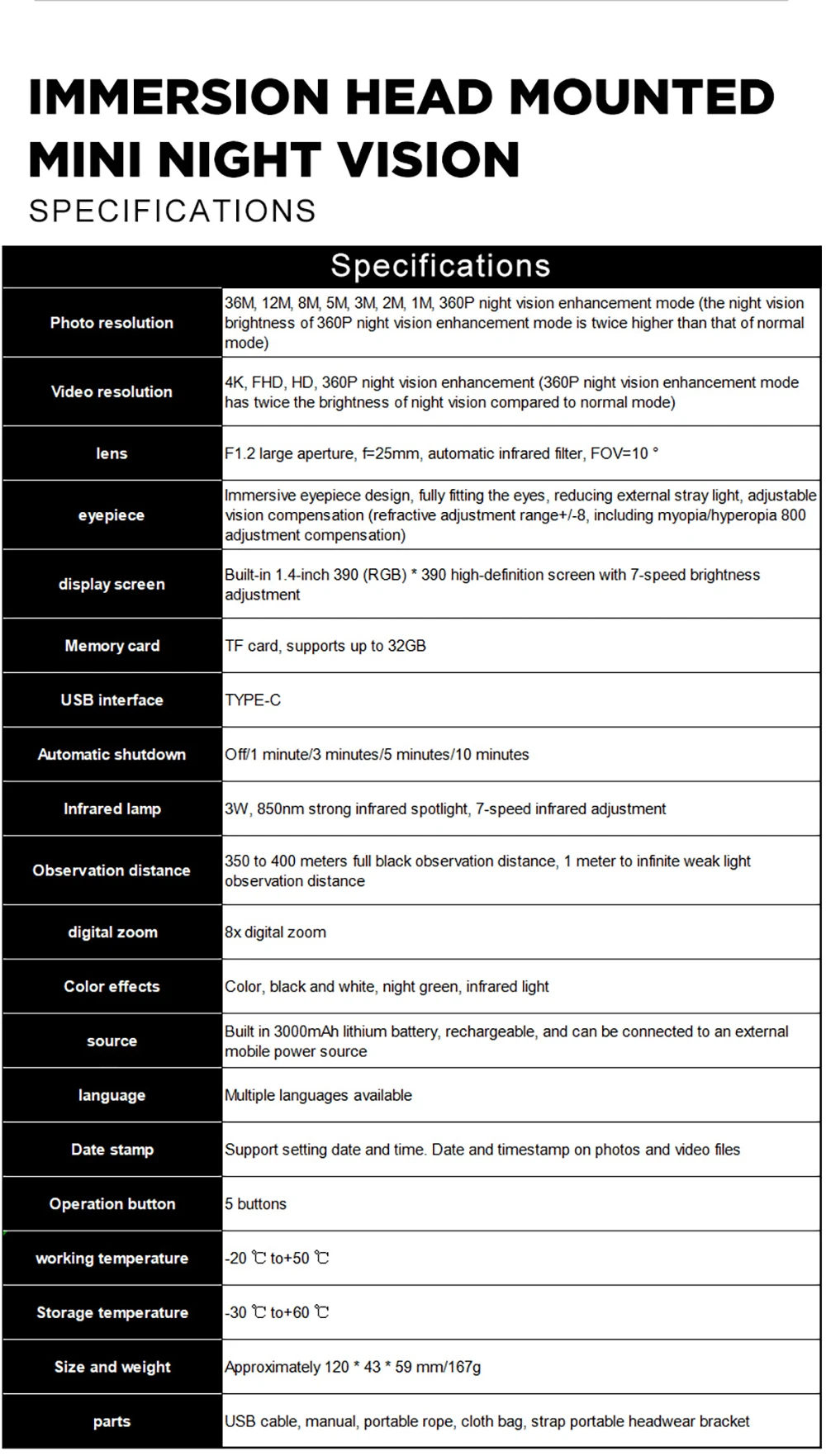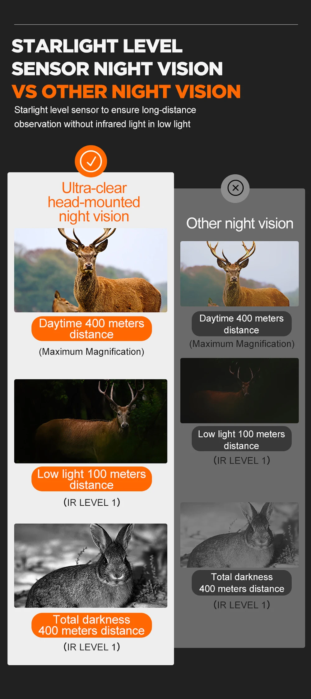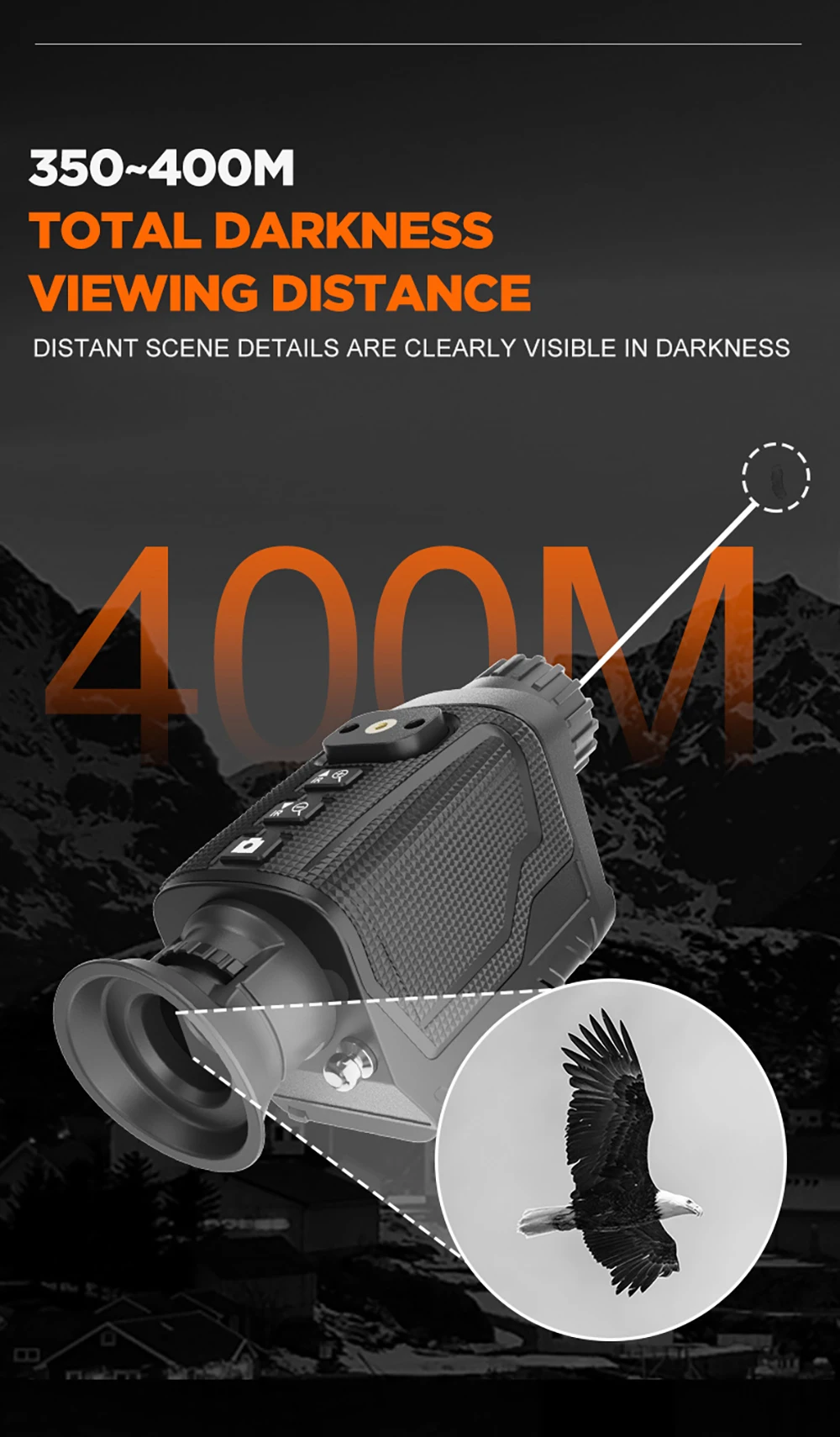 Distancia de visión completamente negra de 350 m ~ 400 m, distancia de visión con poca luz de 1 m ~ infinito