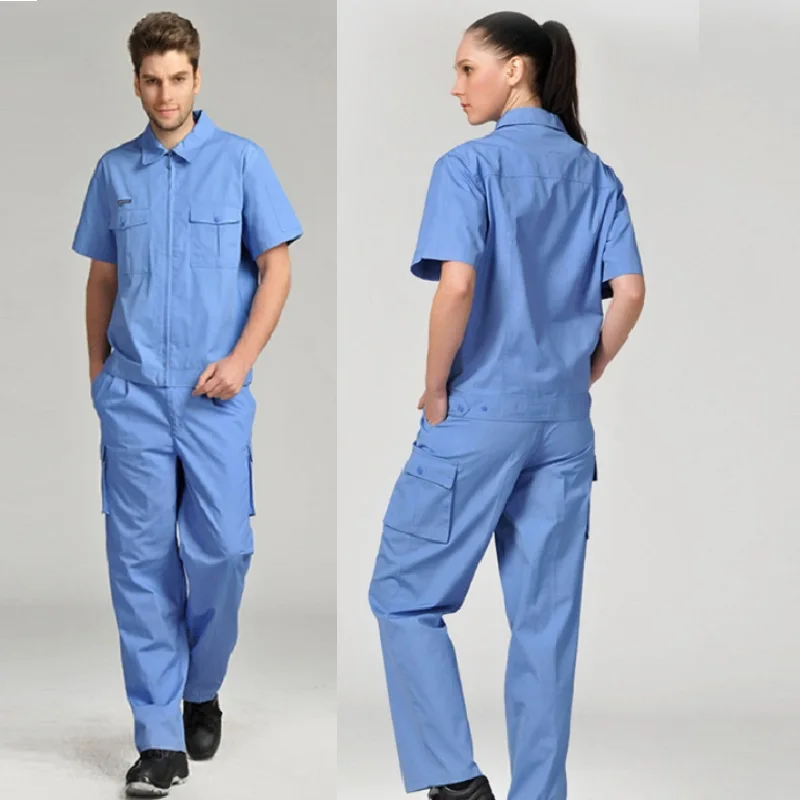 Monos de trabajo para hombre y mujer, uniformes de trabajo, mono de verano, traje de sección delgada para hombre, ropa corta transpirable resistente al desgaste de talla grandeOveroles de trabajo para hombres y mujeres, uniformes de trabajo, trajes de primavera y verano, conjunto de ropa de talla grande de manga corta resistente al desgaste transpirable fino, adecuado para limpiadores de talleres de reparación de automóviles de fábrica, etc.