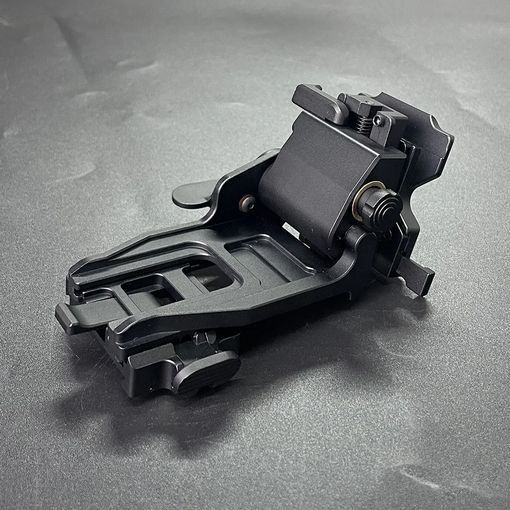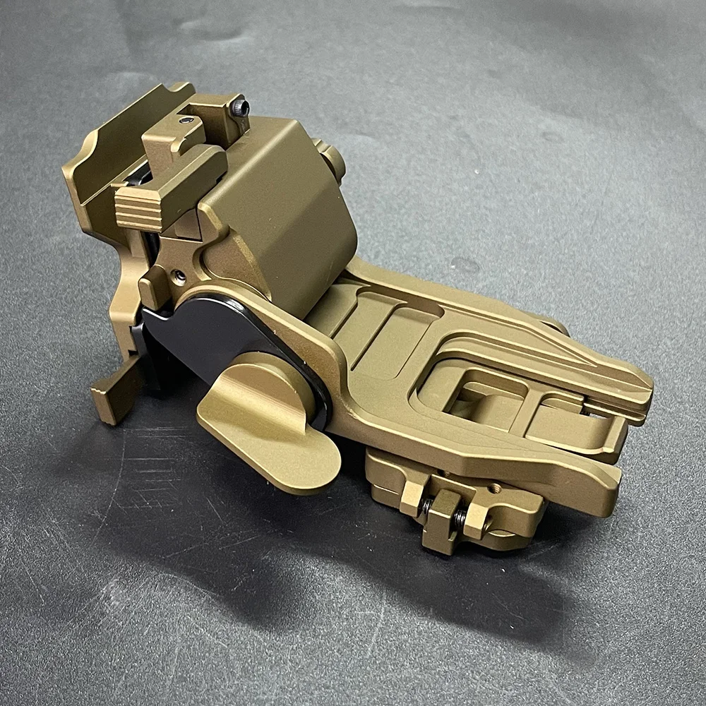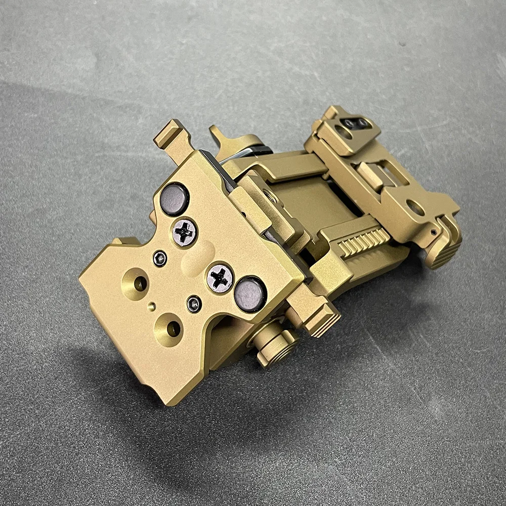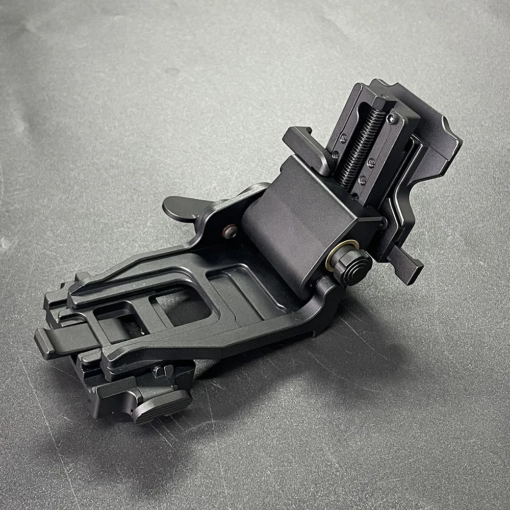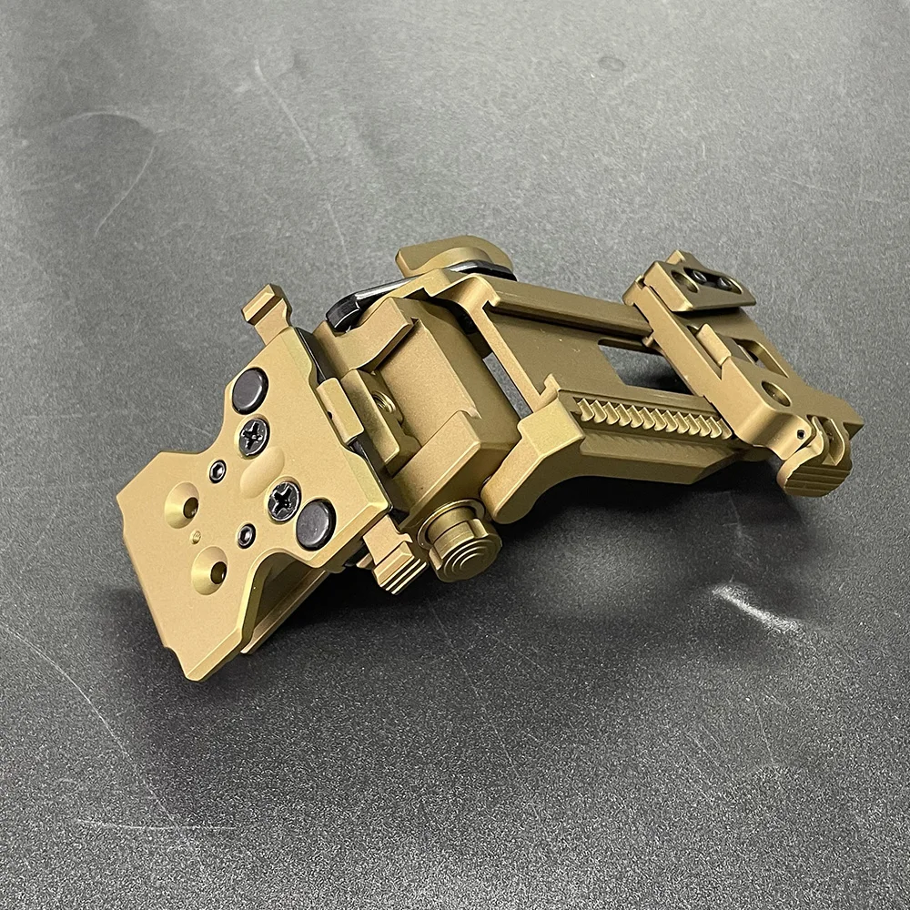 1. La fuerza para superar para guardar elimina las posibilidades de lesiones en el cuello (si el NVG es golpeado o impactado, el soporte abatible de perfil bajo se doblará y bloqueará en una posición vertical protegiendo el NVG y el operador.