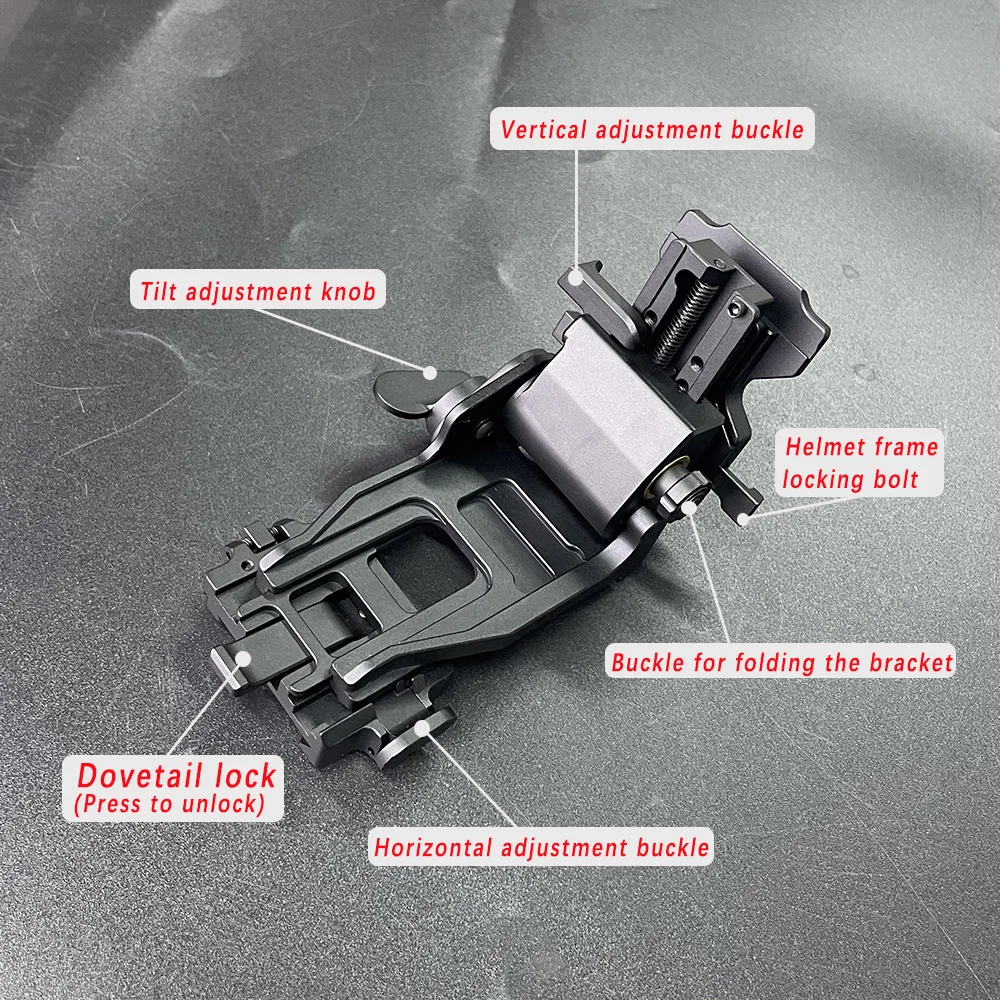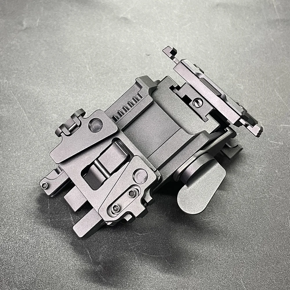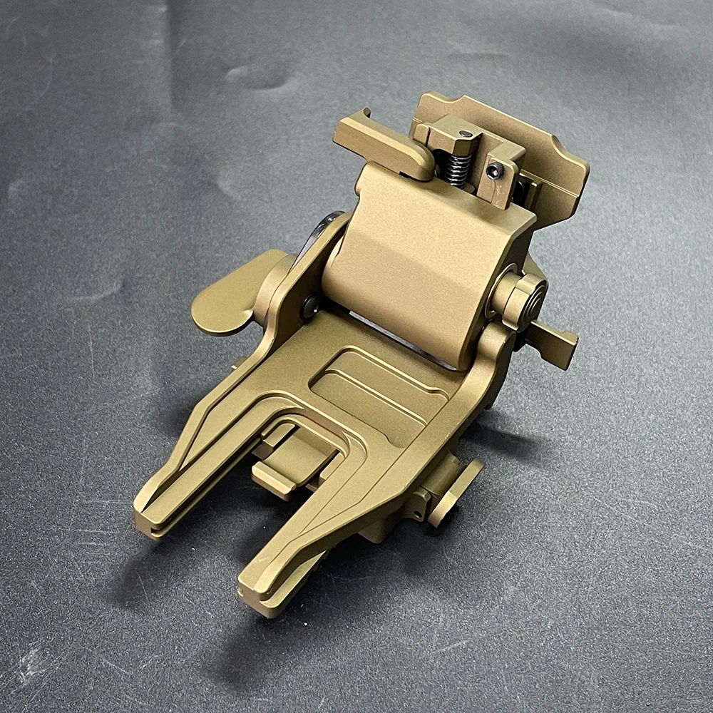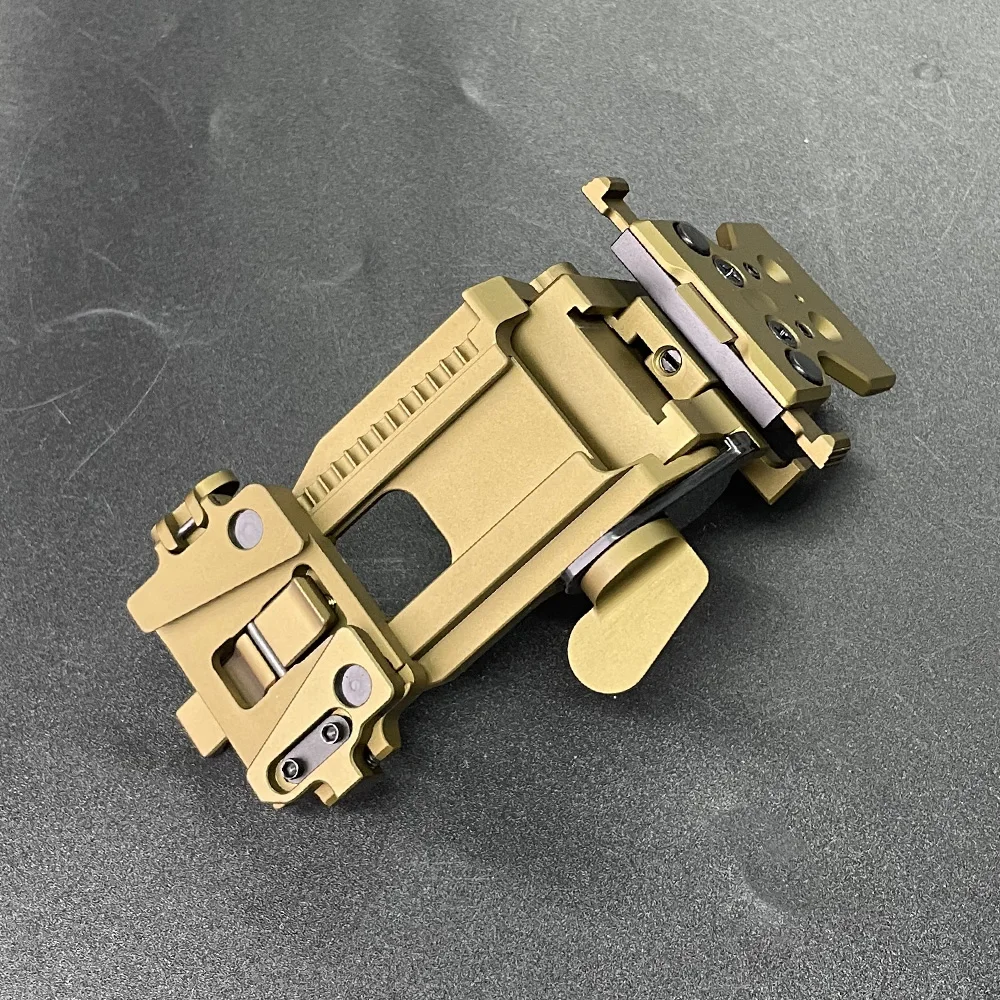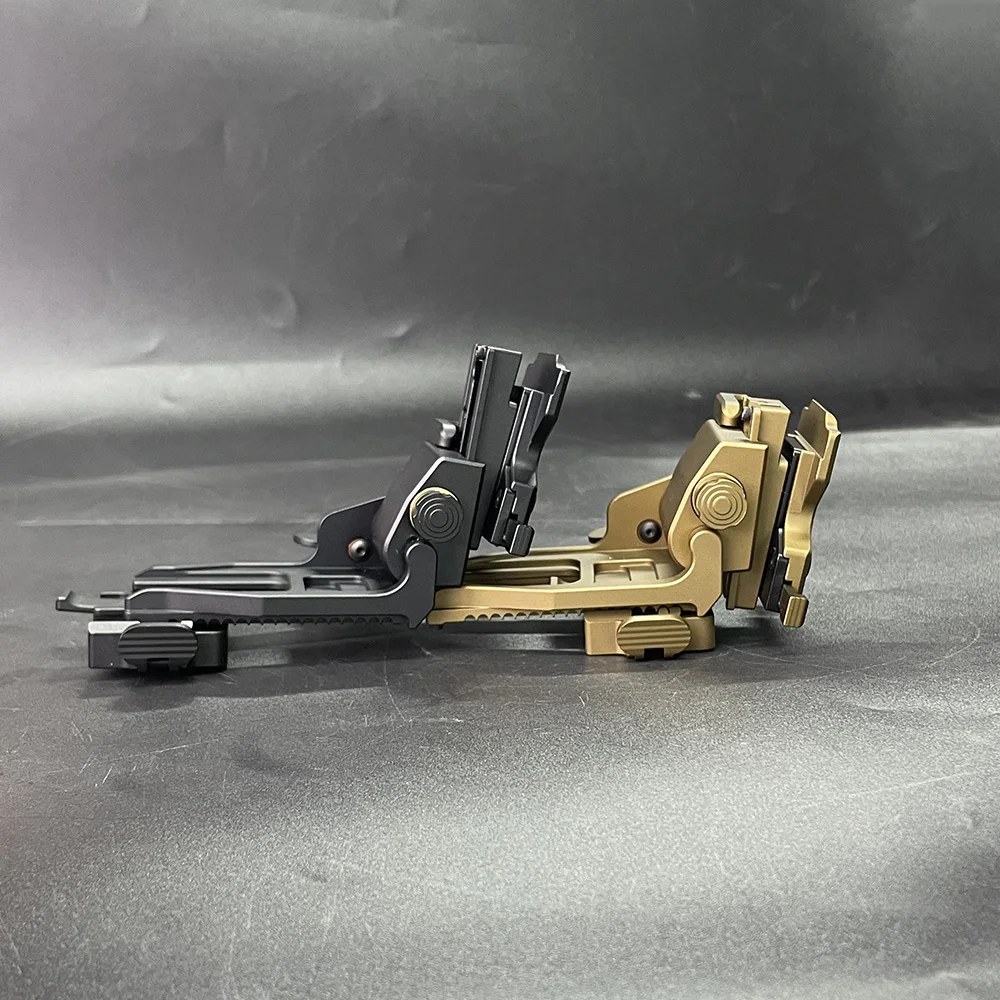 1. La fuerza para superar para guardar elimina las posibilidades de lesiones en el cuello (si el NVG es golpeado o impactado, el soporte abatible de perfil bajo se doblará y bloqueará en una posición vertical protegiendo el NVG y el operador.