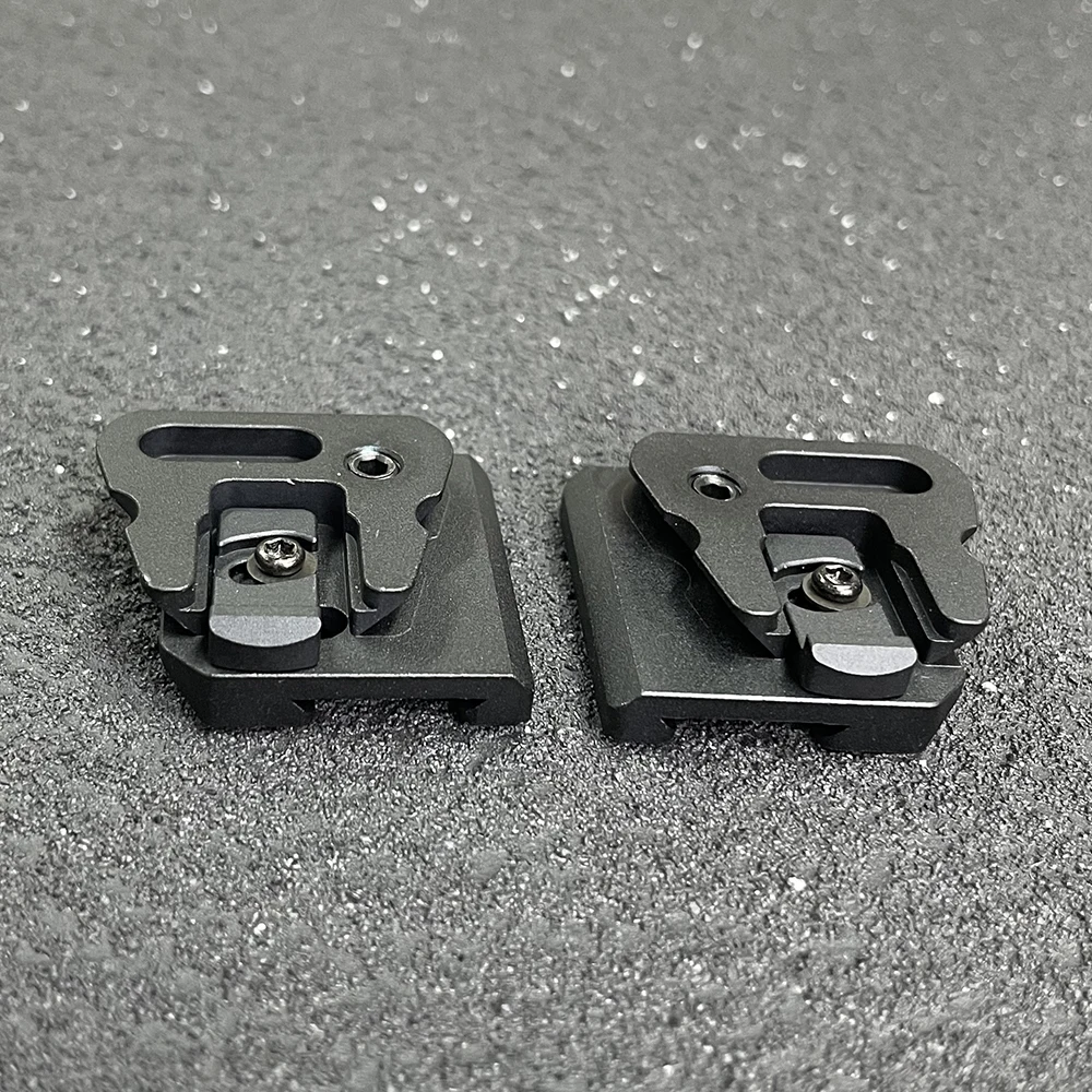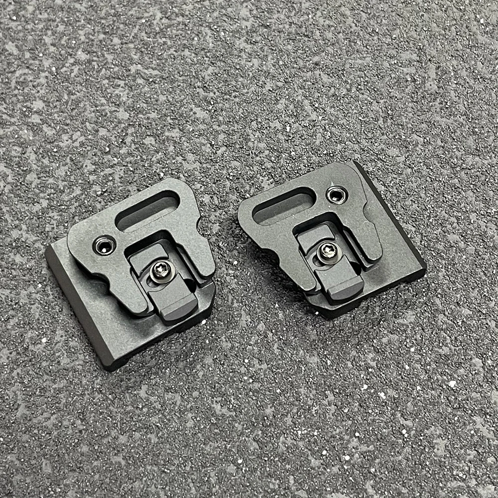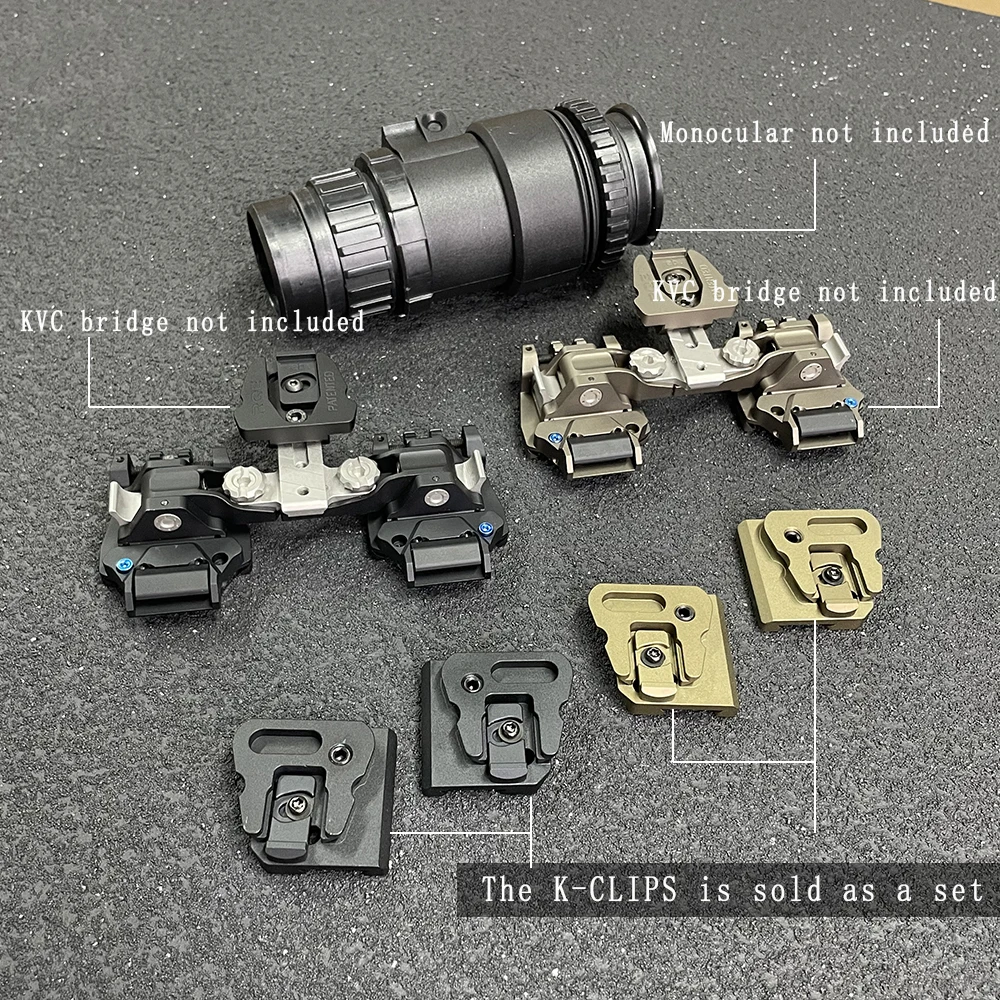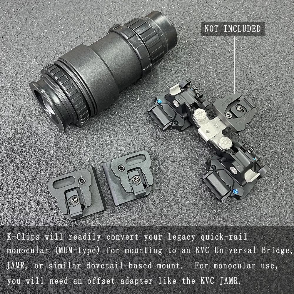 KVC K-Clips están diseñados para la adaptación de código abierto/tipo universal en la que se requiere la conversión de una placa de riel MUM de estilo heredado a una zapata de cola de milano BNVD moderna. Altamente adaptable, el juego de zapatas K-Clip incluye dos unidades individuales (derecha e izquierda). Se pueden usar en dos dispositivos separados para usar uno al lado del otro, o en la parte superior/inferior de un solo dispositivo para crear múltiples puntos de montaje. Los K-Clips están diseñados para deslizarse directamente sobre el "riel rápido" heredado de MUM. Un tornillo de fijación hexagonal integrado de 1/4-20 "bloquea el K-Clip en la ranura central del riel anfitrión.