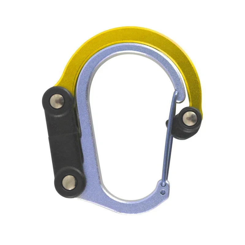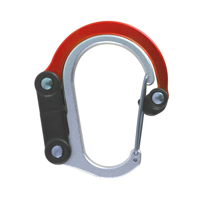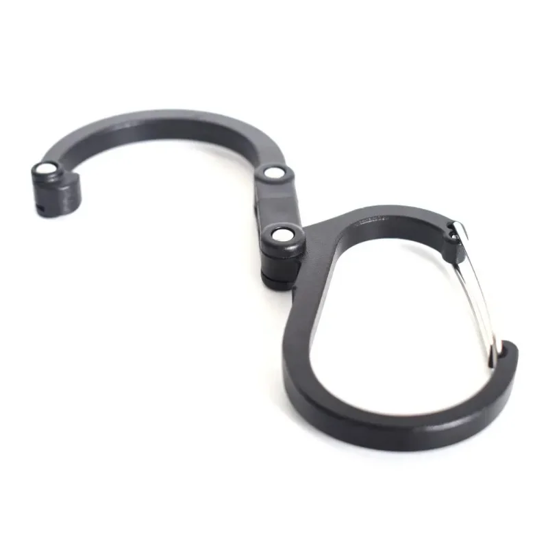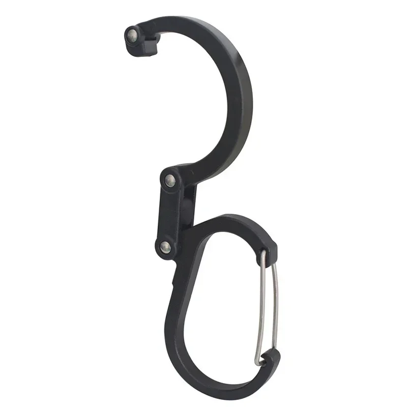 Carabiner with rotating, folding hook has rubber tip to hang just about anywhere.