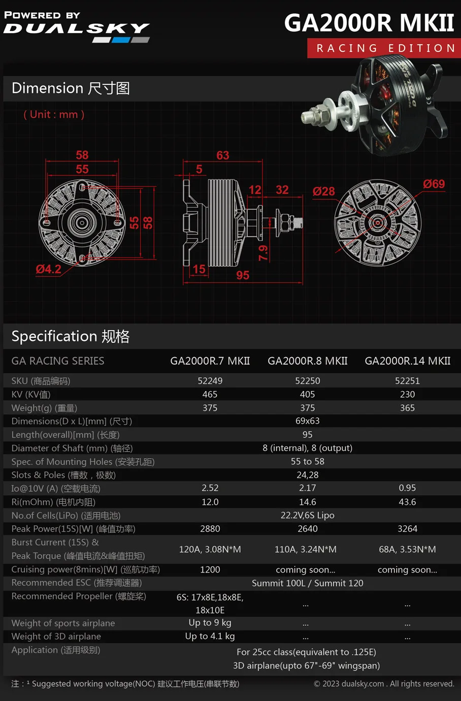 Motor sin escobillas DUALSKY GA2000R MKII 230/405/465KV edición de competición adecuado para motor de gasolina de ala fija clase 70E 15-20cc