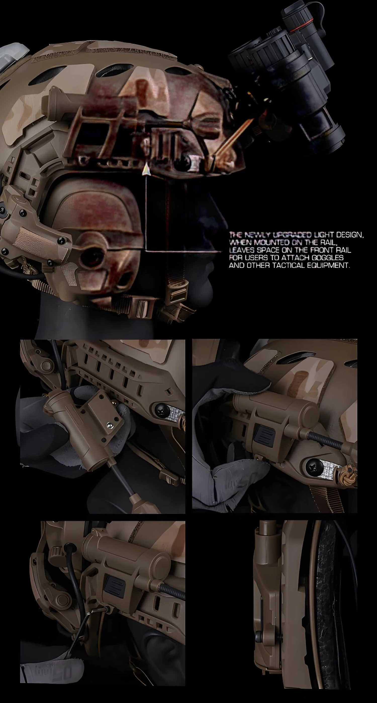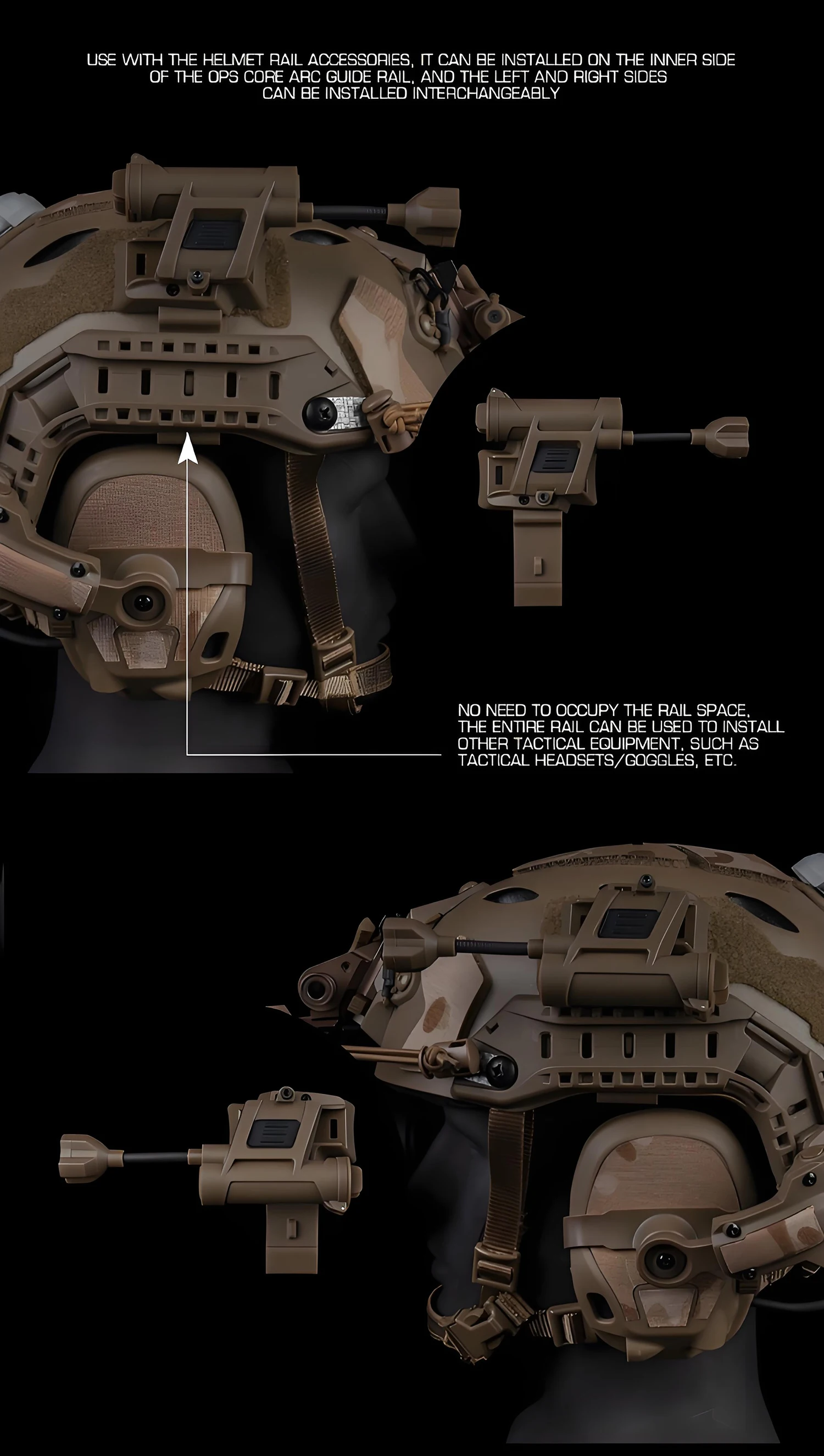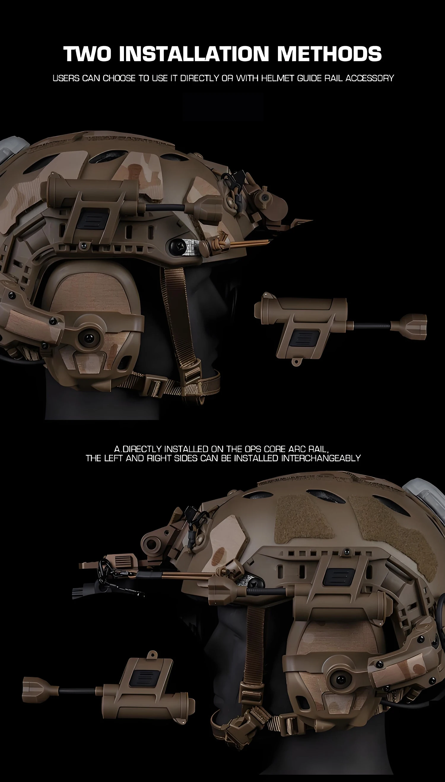 Diseño compatible con rieles: se monta directamente en rieles ARC (intercambiables izquierdo/derecho) sin bloquear el espacio de riel frontal para gafas/NVG.