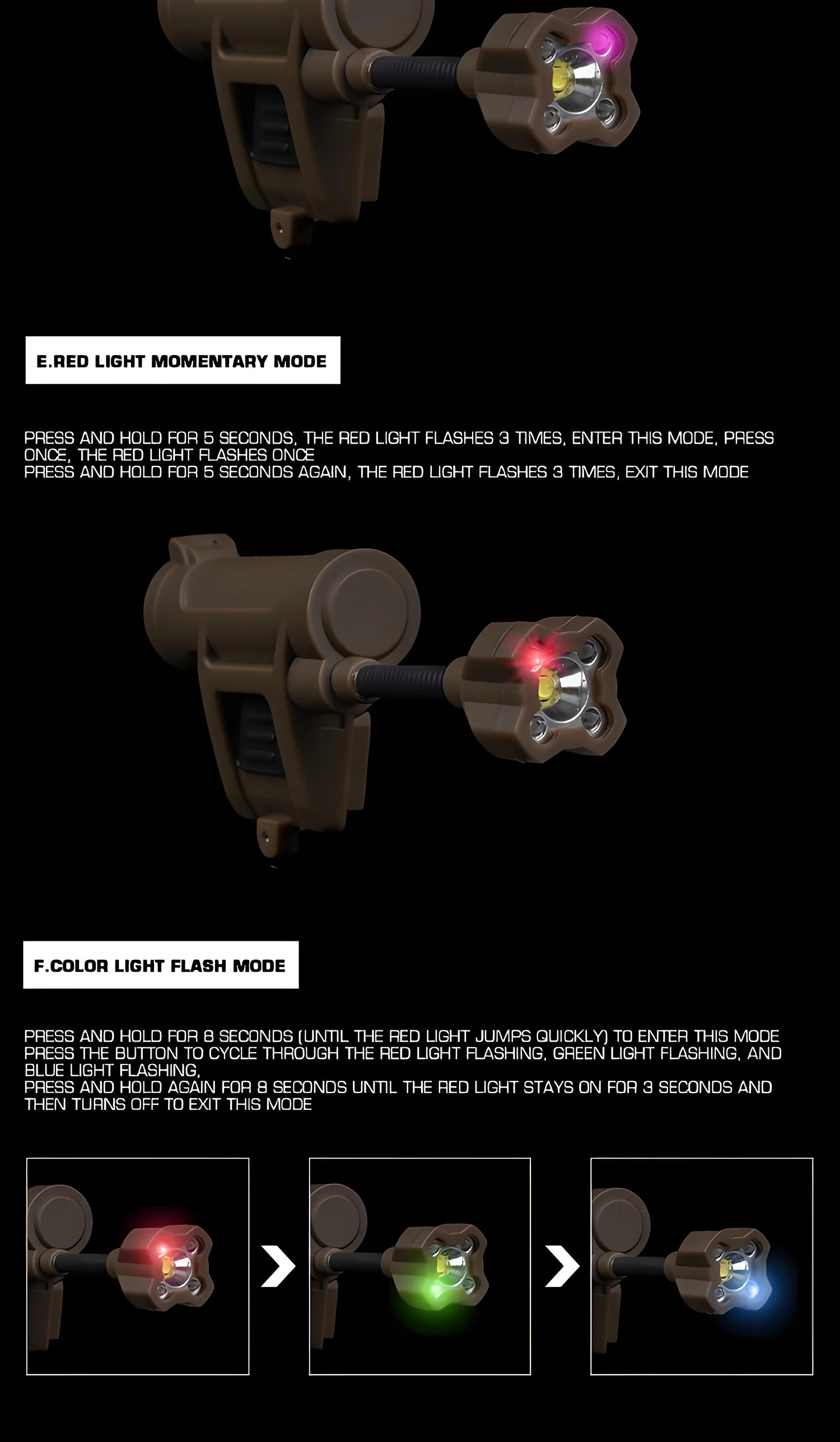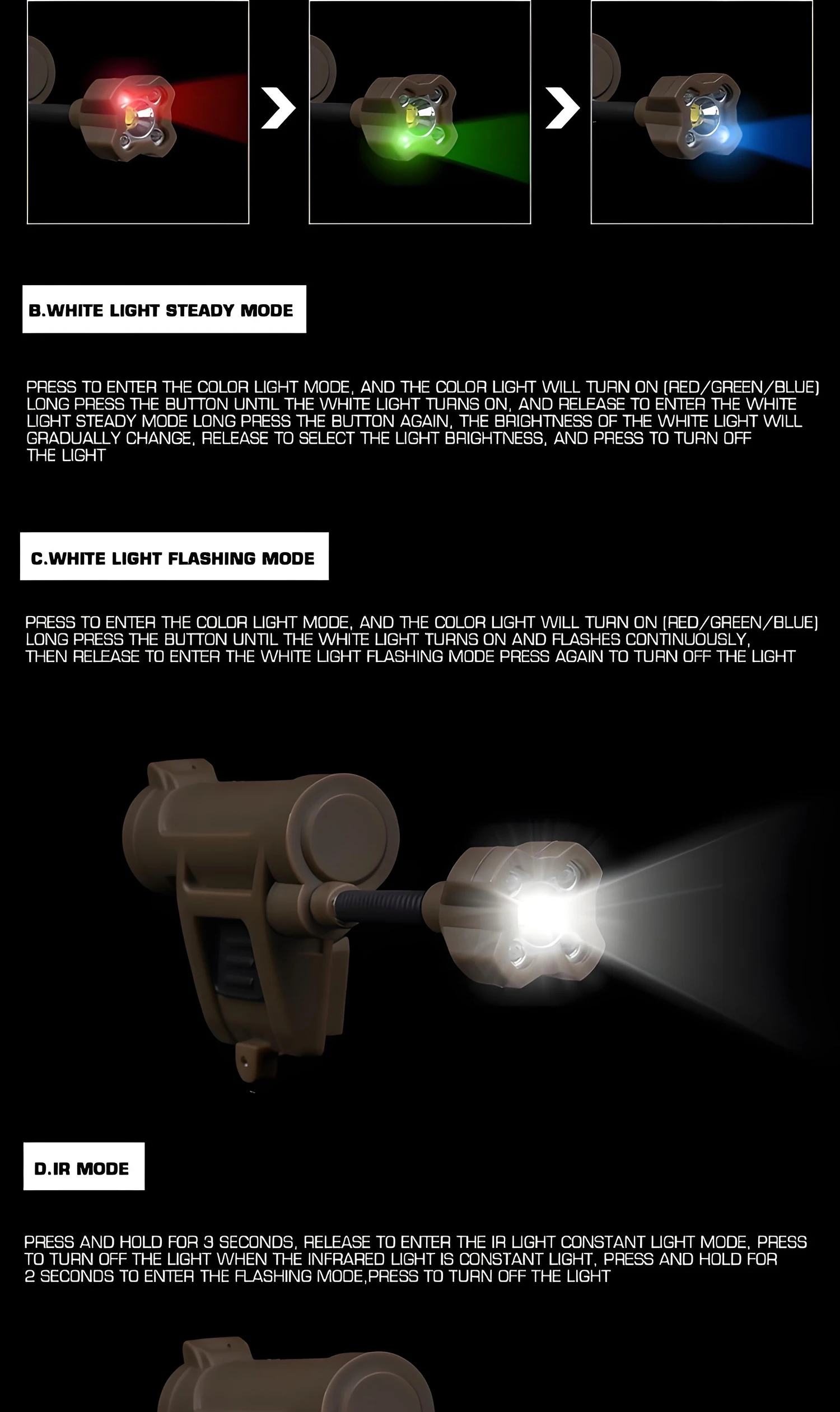 Iluminación multiespectro: cambie entre iluminación blanca, IR para visión nocturna, señales de colores (rojo/verde/azul) y modos estroboscópicos para versatilidad táctica.