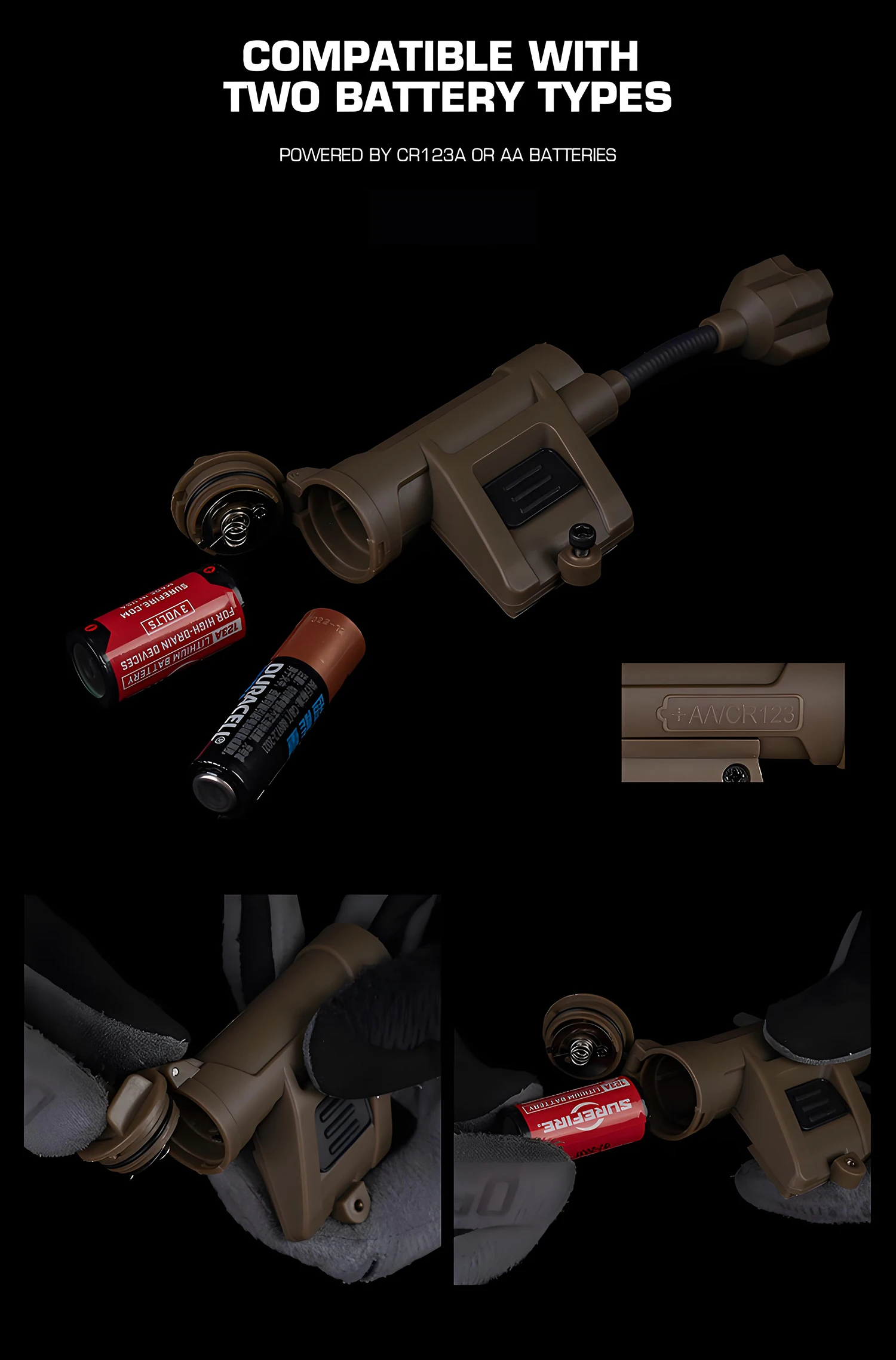Sistema de batería dual: admite baterías CR123A (3 V) o AA (adaptadores incluidos) para operaciones de campo extendidas.