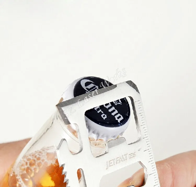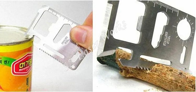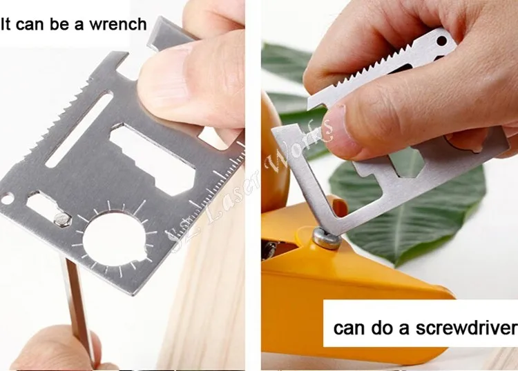 Esta mini herramienta de supervivencia es ideal para acampar, hacer senderismo, mochilero, cazar, montar en senderos. Funciones: Abrelatas Filo cuchillo Destornillador Regla Abrebotellas Llave de mariposa Llave de 2 posiciones Hoja Sierra Indicación auxiliar de direcciónLlave de 4 posiciones Agujero para llavero Especificaciones: Material: acero inoxidable 420 de alta calidad Tamaño: aproximadamente 6,9x4,5x0,2 cm (2,68 "x 1,78" x 0.079 ") Peso: aproximadamente 30g Dureza: 55HRC