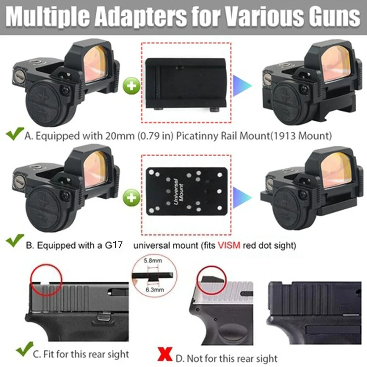 Tenga en cuenta si la selección de productos incluye montura G17 Tenga en cuenta que existen muchas versiones y replicas de G17. Verifique la ranura de la mira trasera G17 antes de comprar. Si tiene alguna pregunta, comuníquese con el servicio de atención al cliente.