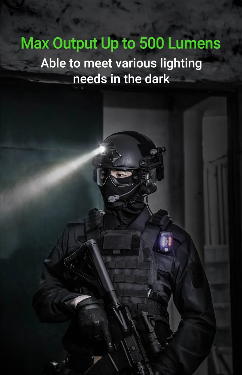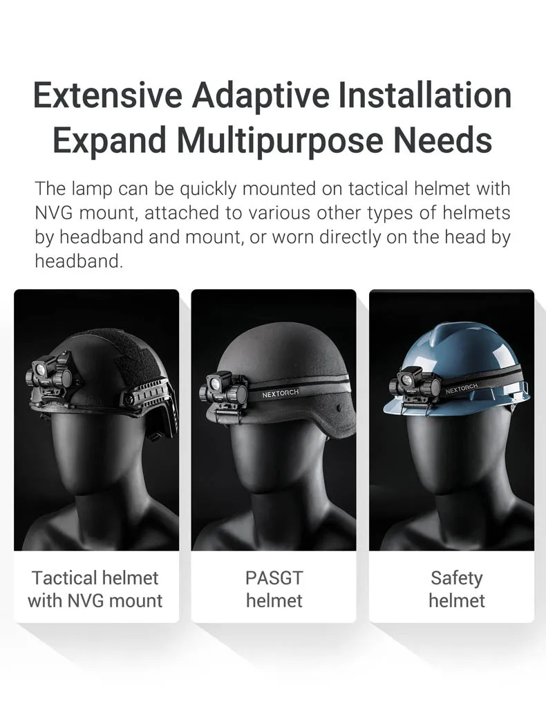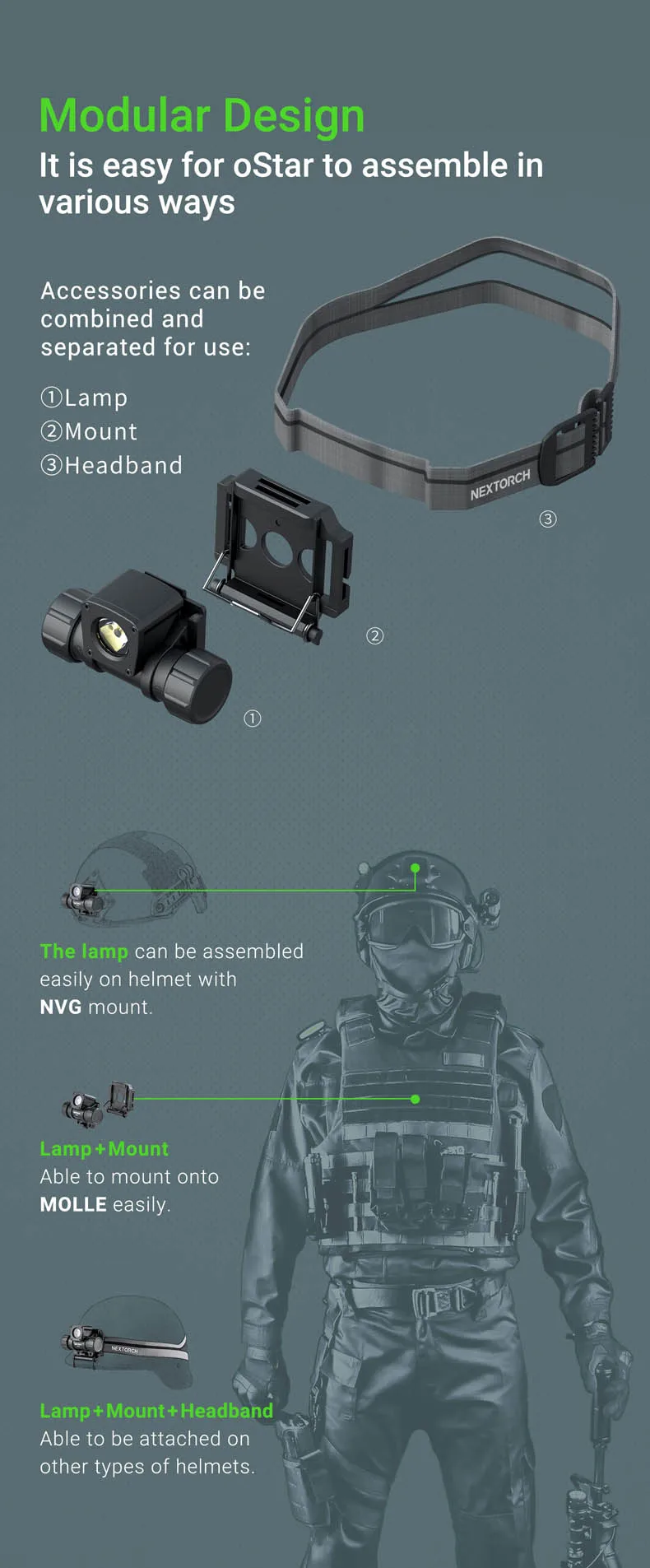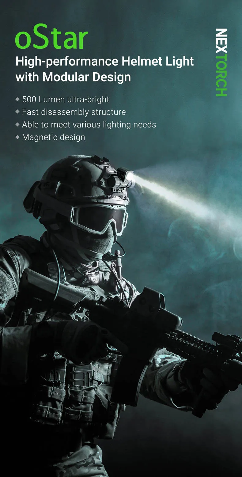 ② OStar se puede montar rápidamente en cascos con interfaz NVG, también se puede fijar en otros tipos de cascos a través de la banda del faro y el soporte del borde, Y se puede adsorber magnéticamente en superficies de metales ferrosos para luces de trabajo de mantenimiento.